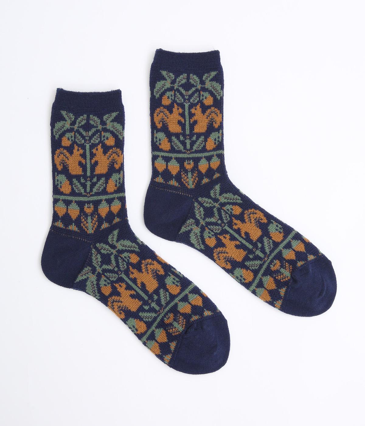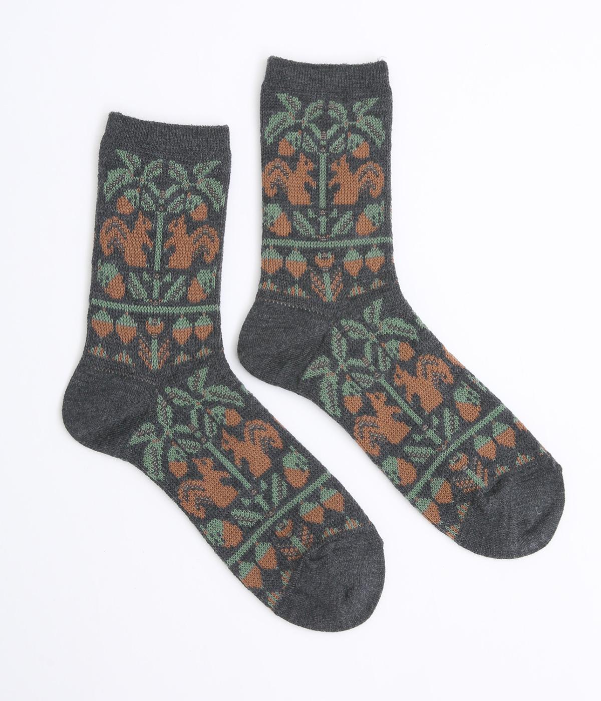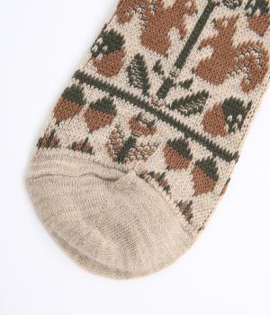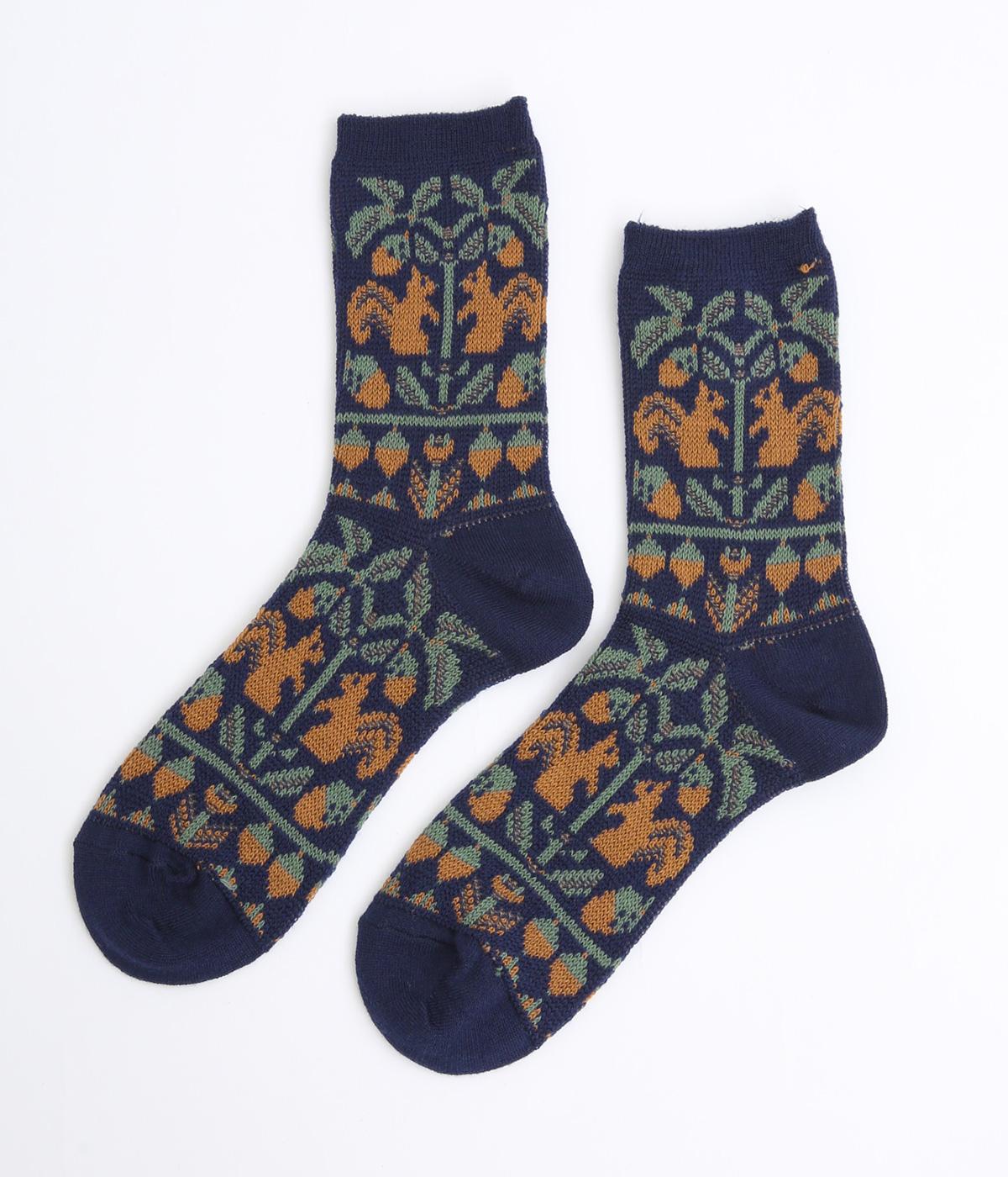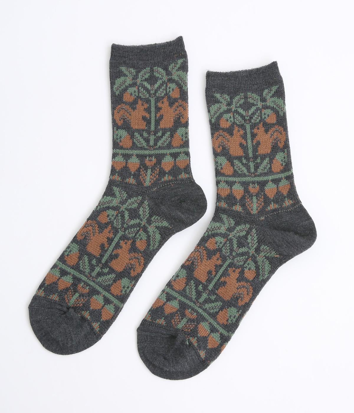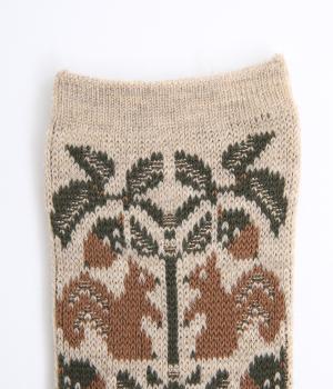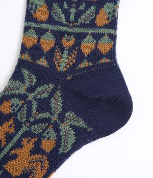 どんぐりとリスをモチーフにした、ほっこりとした可愛らしさのあるジャカード編みソックス。深みのある色あいも季節感にマッチしていて、キャッチーながらも大人スタイルにもすんなりなじみます。