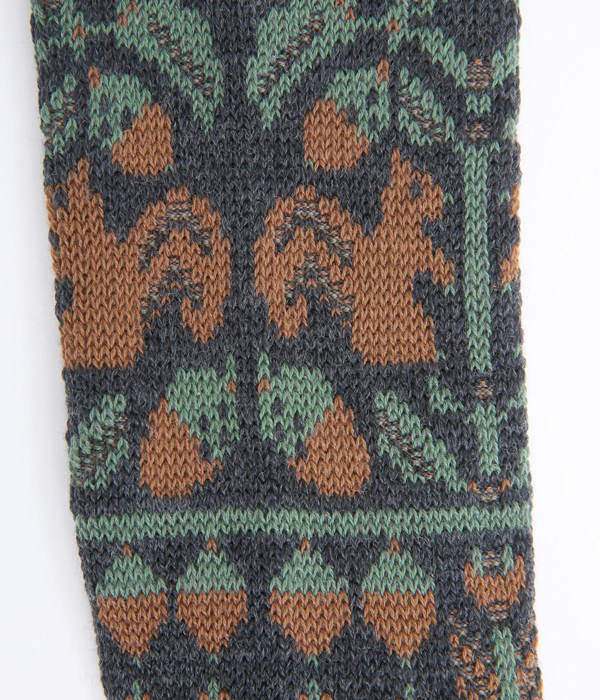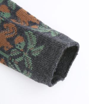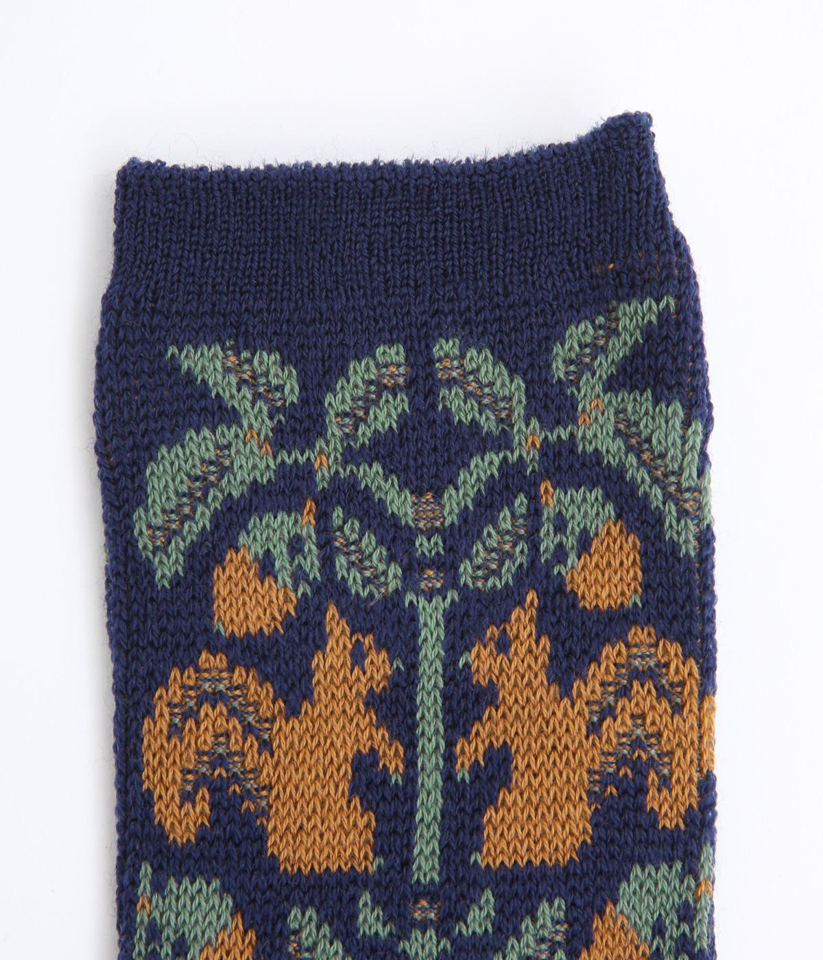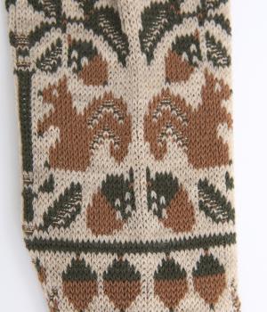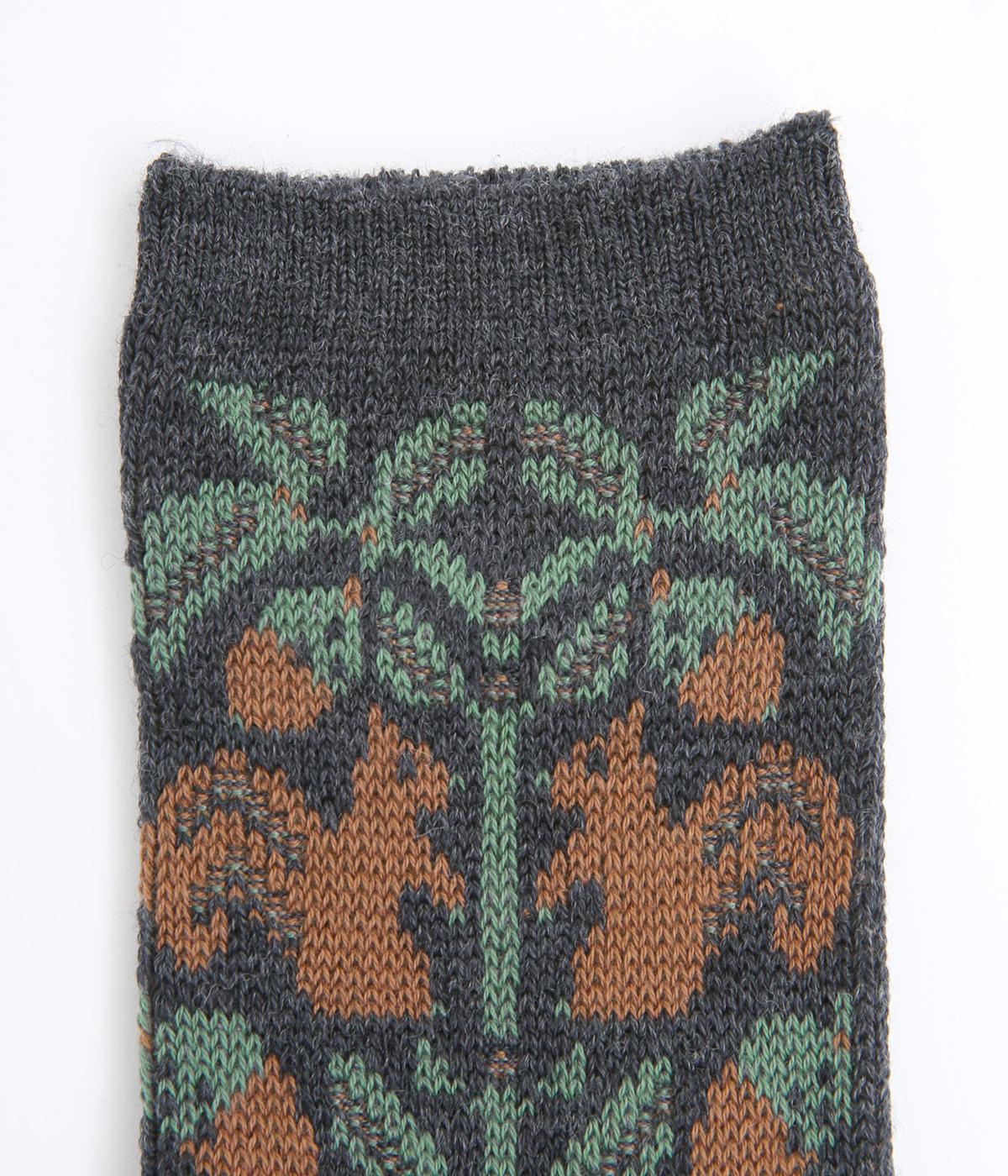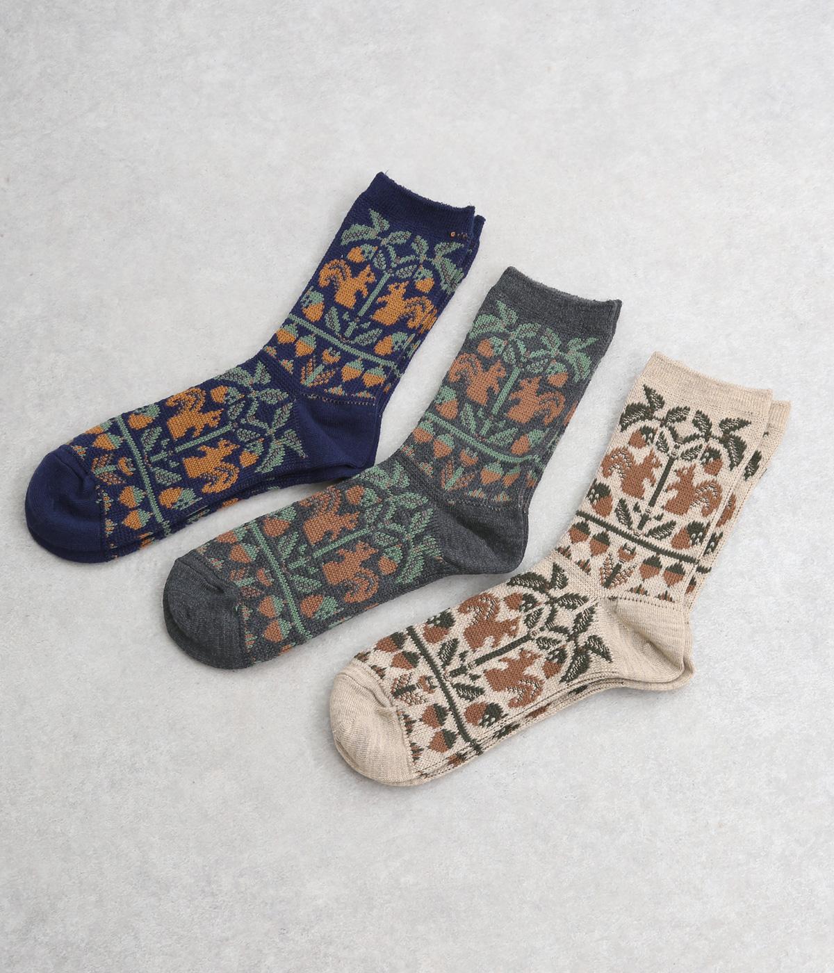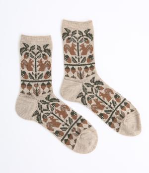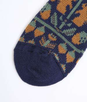 どんぐりとリスをモチーフにした、ほっこりとした可愛らしさのあるジャカード編みソックス。深みのある色あいも季節感にマッチしていて、キャッチーながらも大人スタイルにもすんなりなじみます。