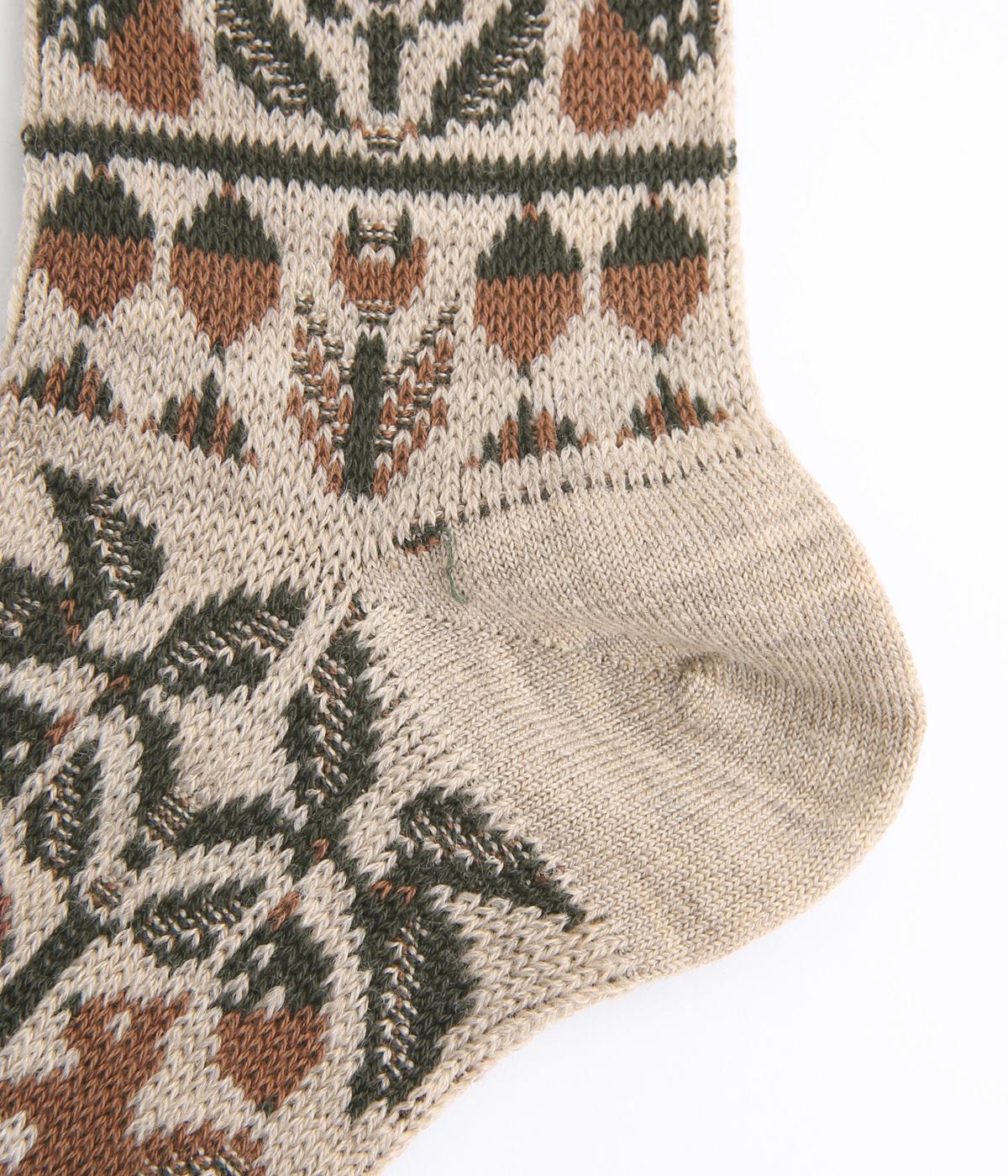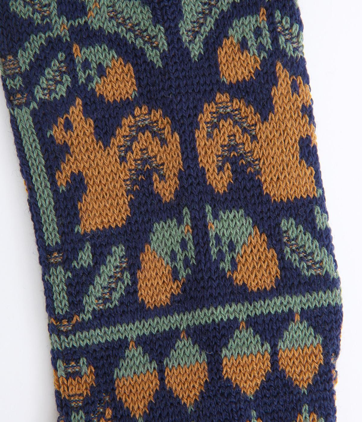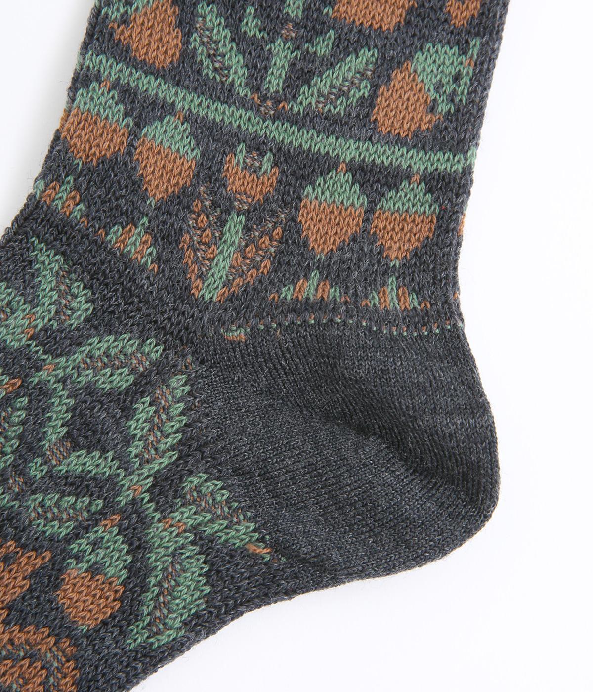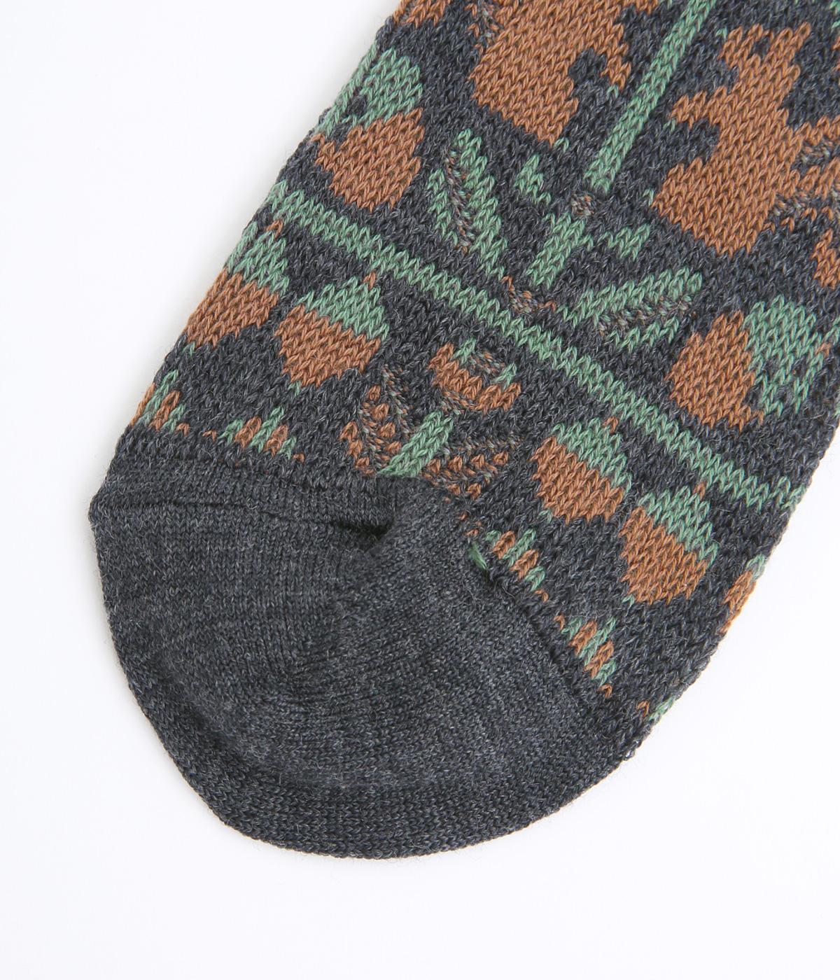 どんぐりとリスをモチーフにした、ほっこりとした可愛らしさのあるジャカード編みソックス。深みのある色あいも季節感にマッチしていて、キャッチーながらも大人スタイルにもすんなりなじみます。
