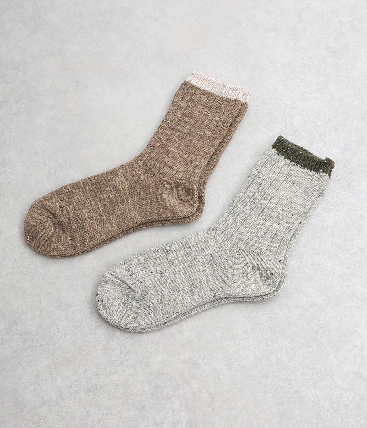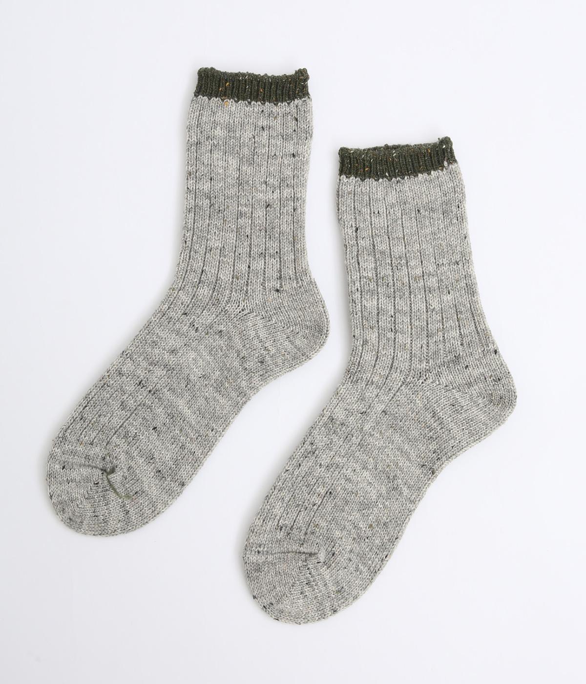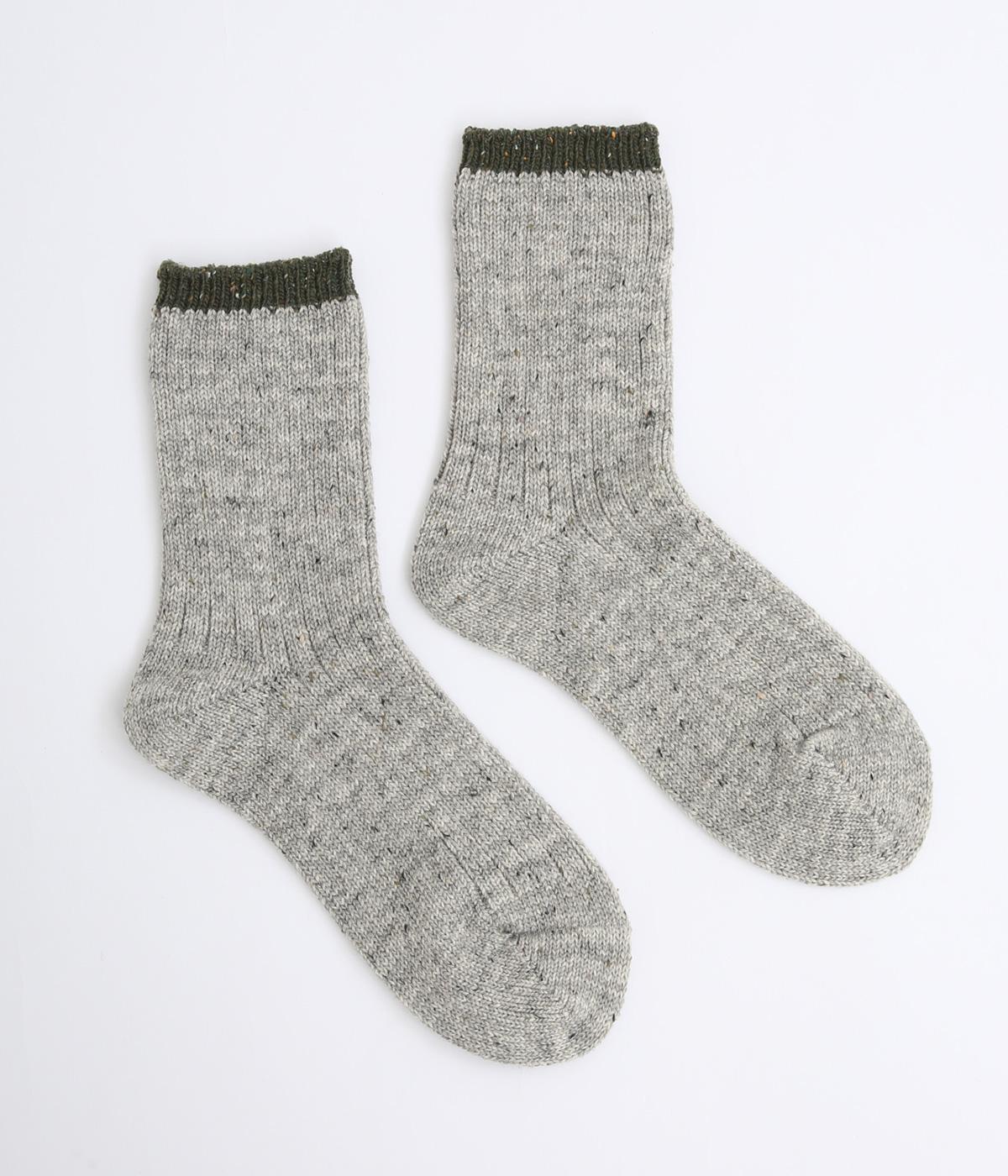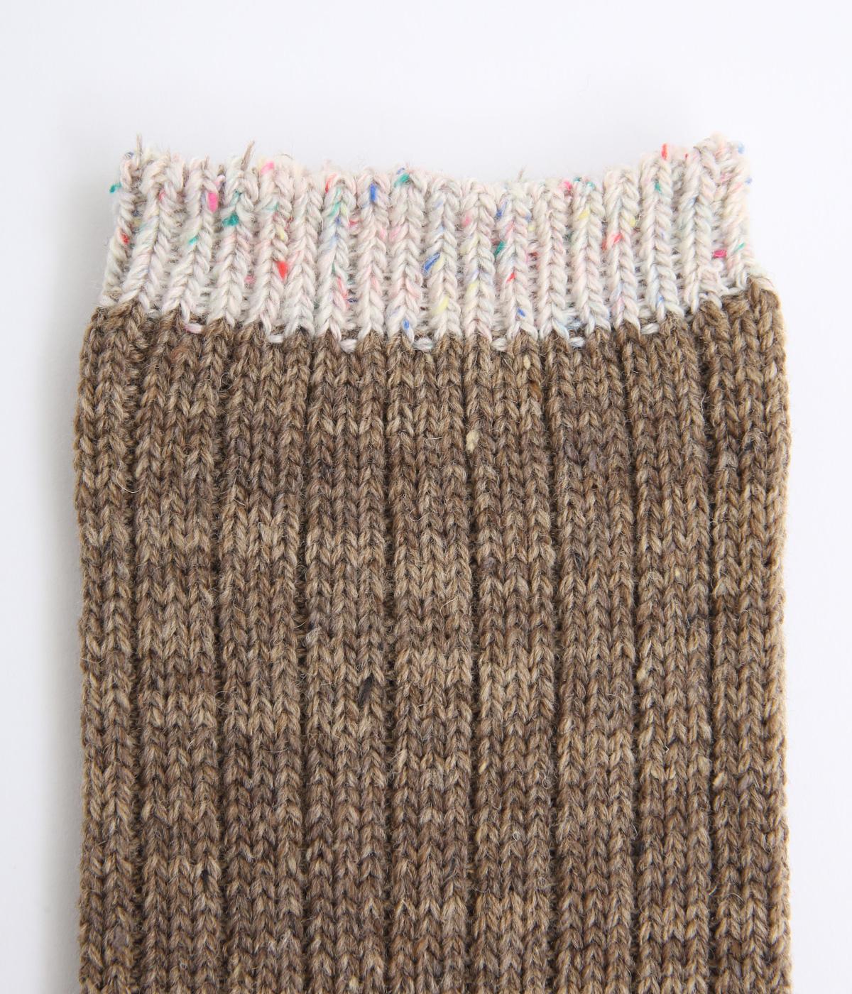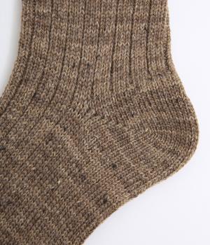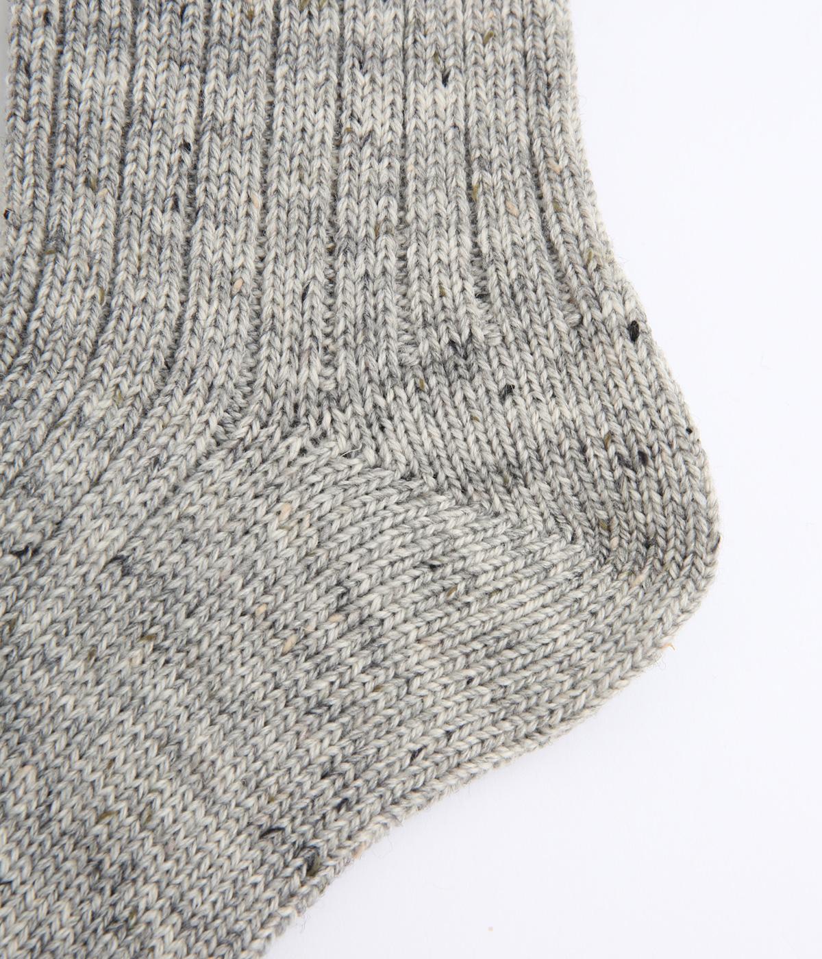 ほっこりとしたあたたかみのあるカラーネップに防縮ウール糸で編み立てたニットソックス。リブ編みではきやすく、ほどよく厚みがあります。