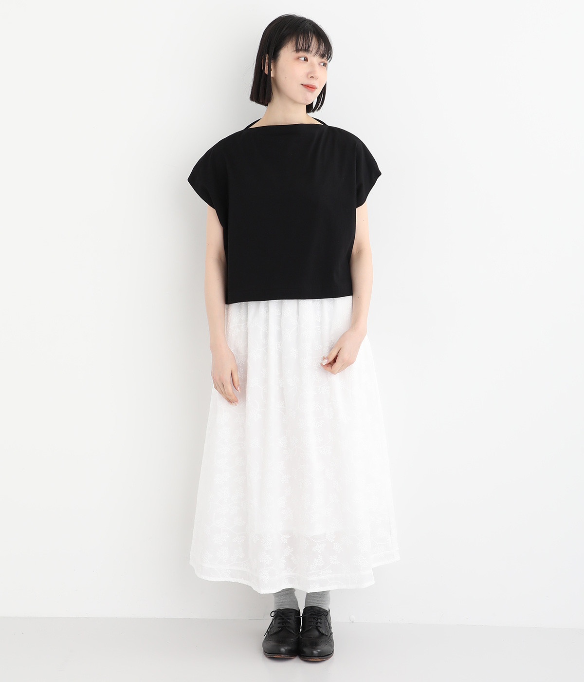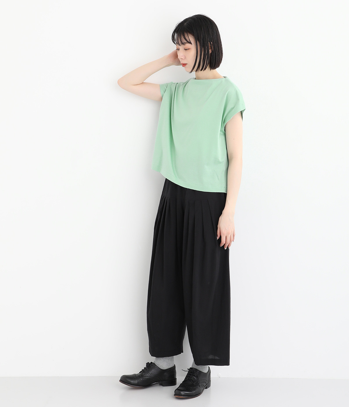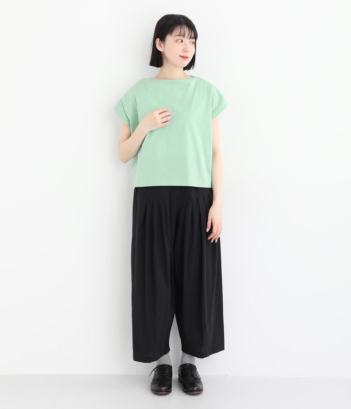 すっきりとしたボートネックにちょこんとついたフレンチスリーブが特徴的な一枚。コンパクトなサイズ感がミニマルな仕上がりで、いつものTシャツスタイルもちょっと品よく見せてくれる存在です。