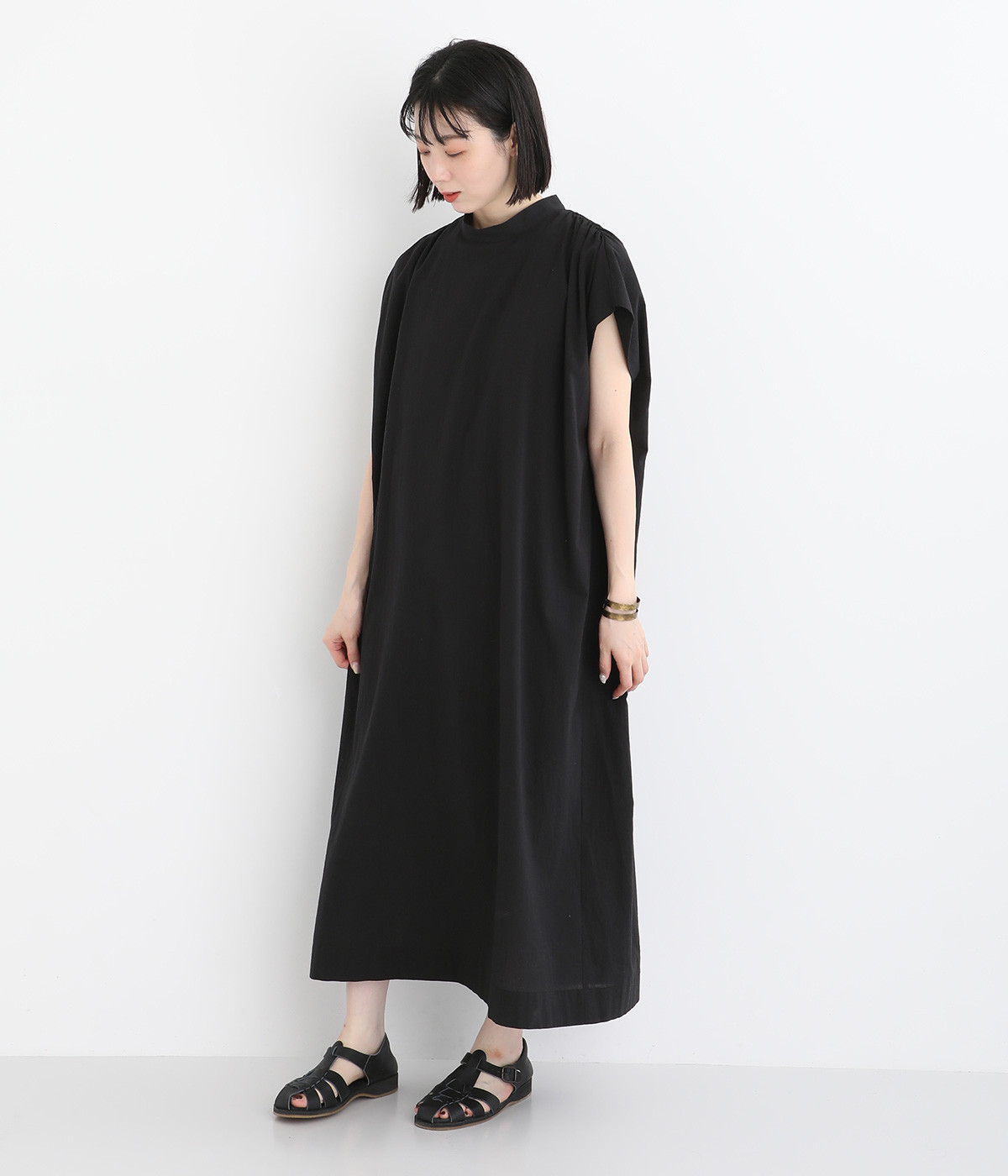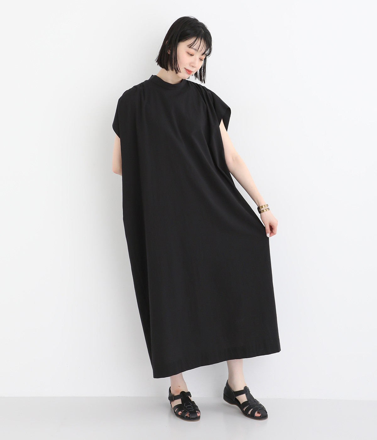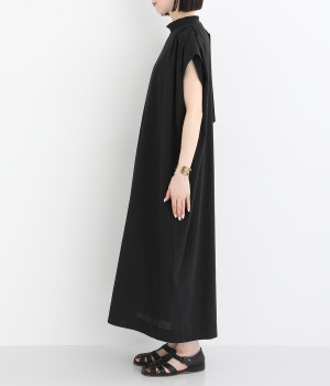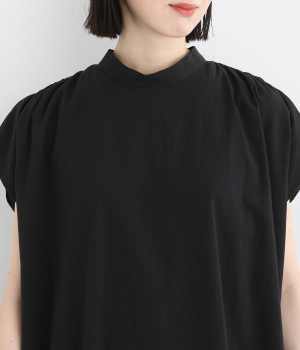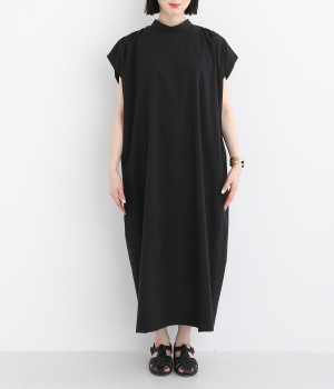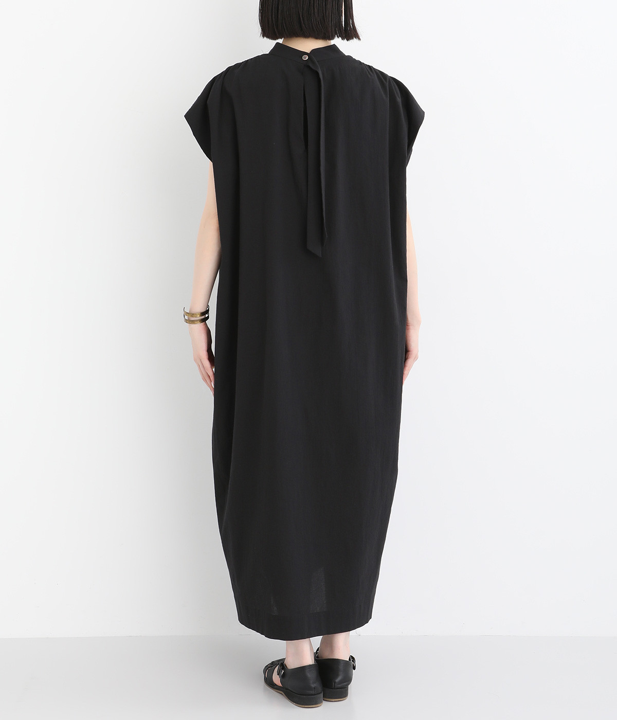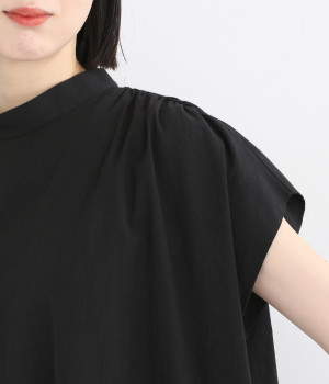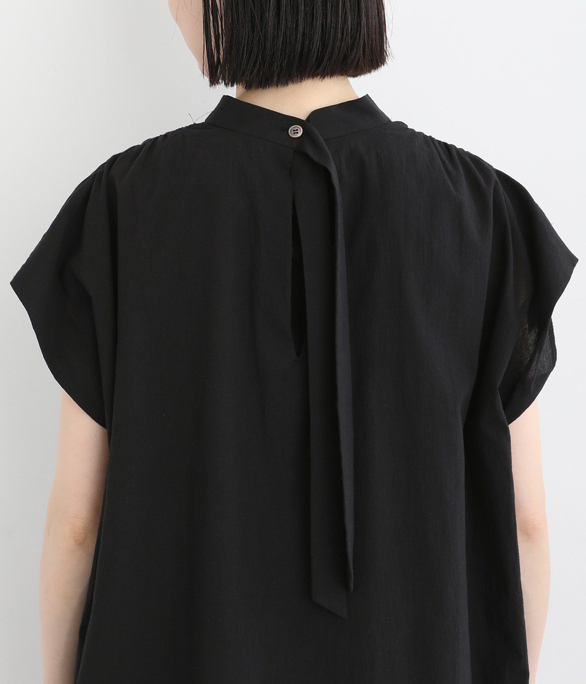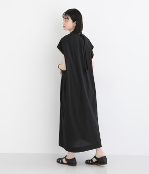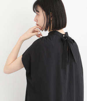 体のラインを拾いにくいゆったりとしたシルエットが特徴的。フレンチスリーブのように落ちた肩が肌の露出をおさえて上品に仕上がっています。後ろリボンは自然に垂らしても結んでもすてきです。