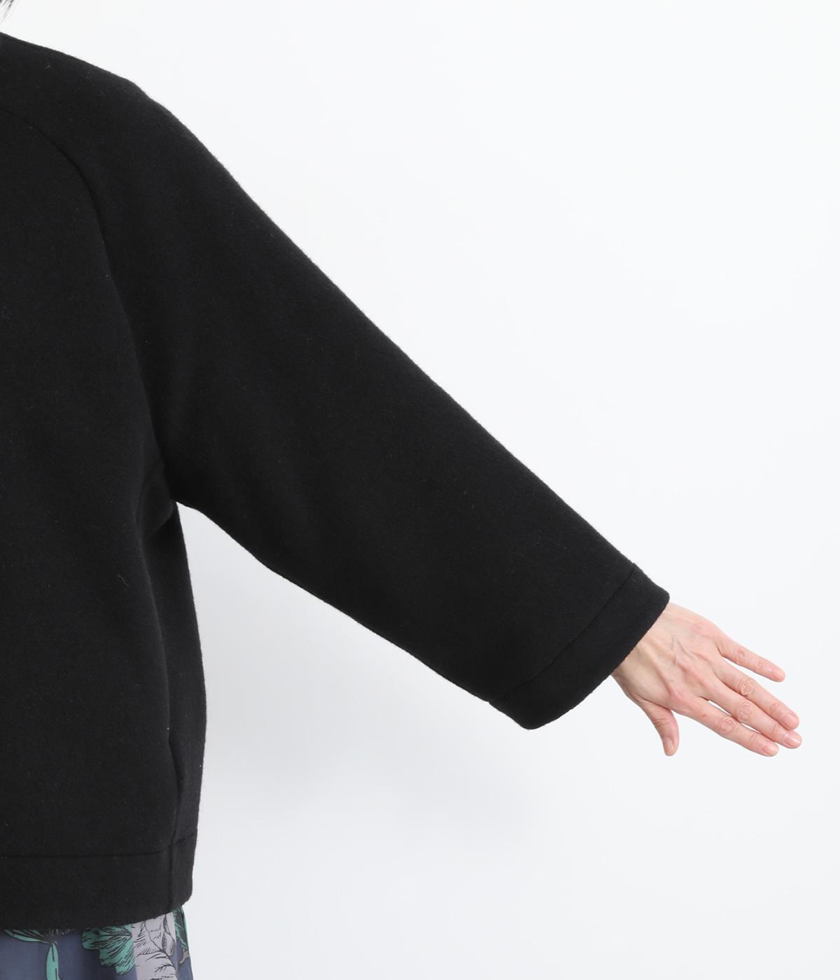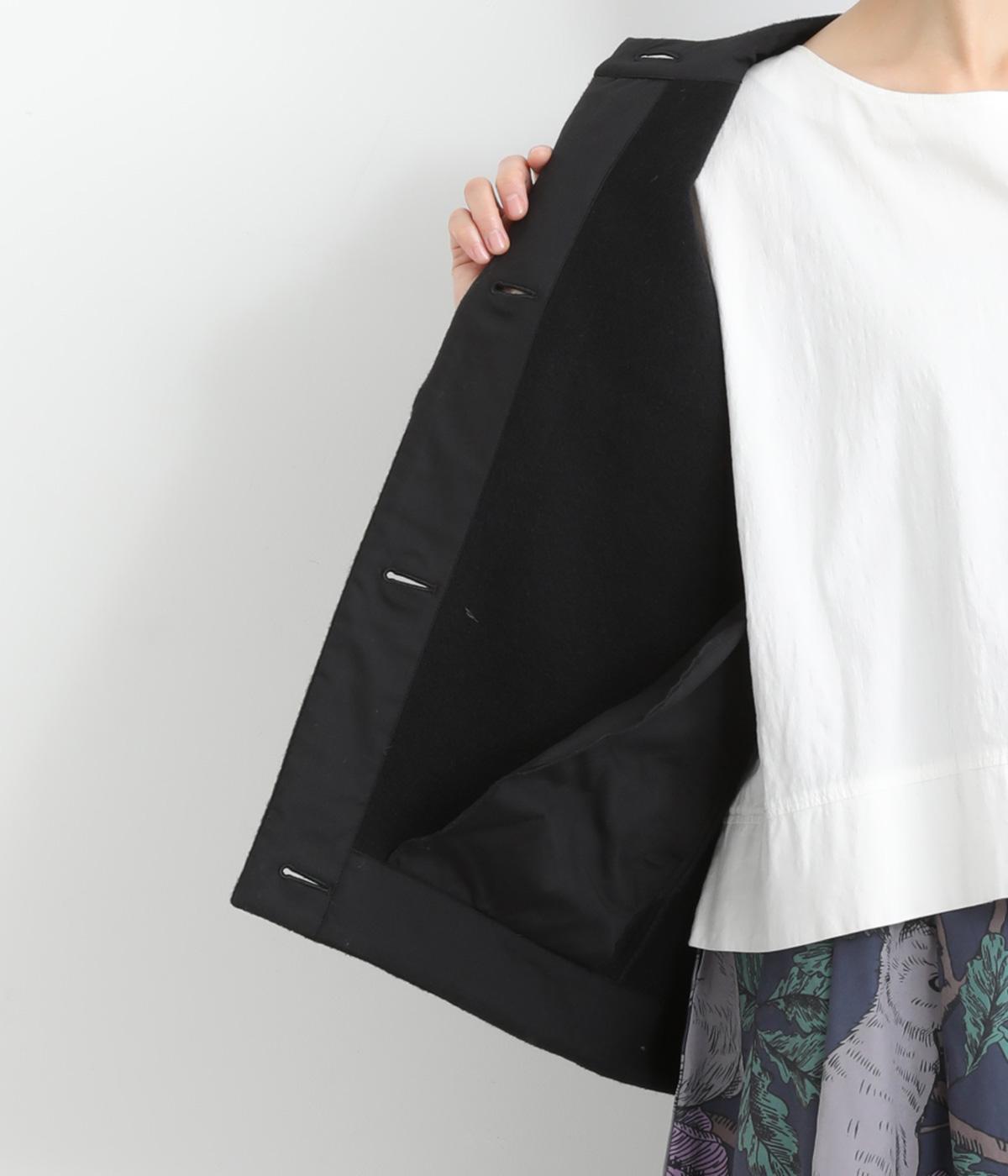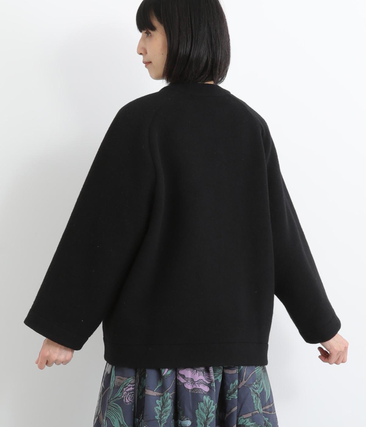 適度に厚みがあり、なめらかな手触りでフェルトのような感触が特徴的なメルトン生地を使用。保温性が高く、ポリエステル製で重すぎない羽織りやすい仕上がりです。