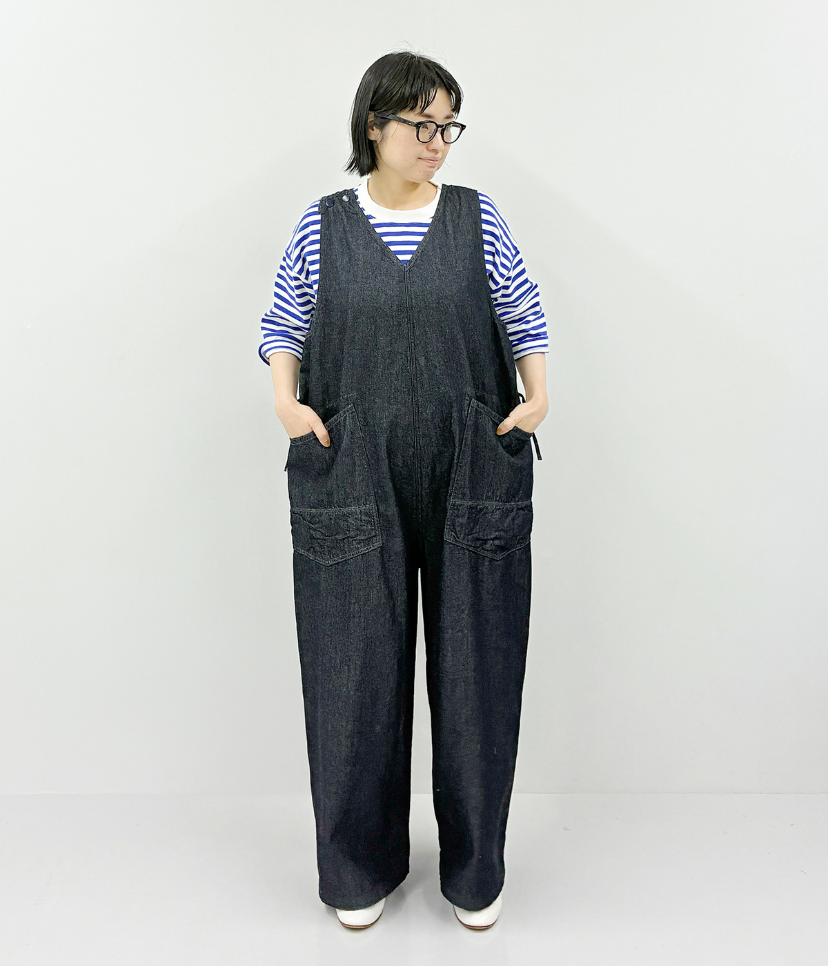 生地を贅沢にたっぷりと使用したオーバーサイズが特徴のサロペットパンツ。後ろのリボンをきゅっとしぼれば動きのあるデフォルメシルエットがたのしめます。大きめポケットもメンズライクなポイントで、実用性を備えつつおしゃれを楽しめる一着。