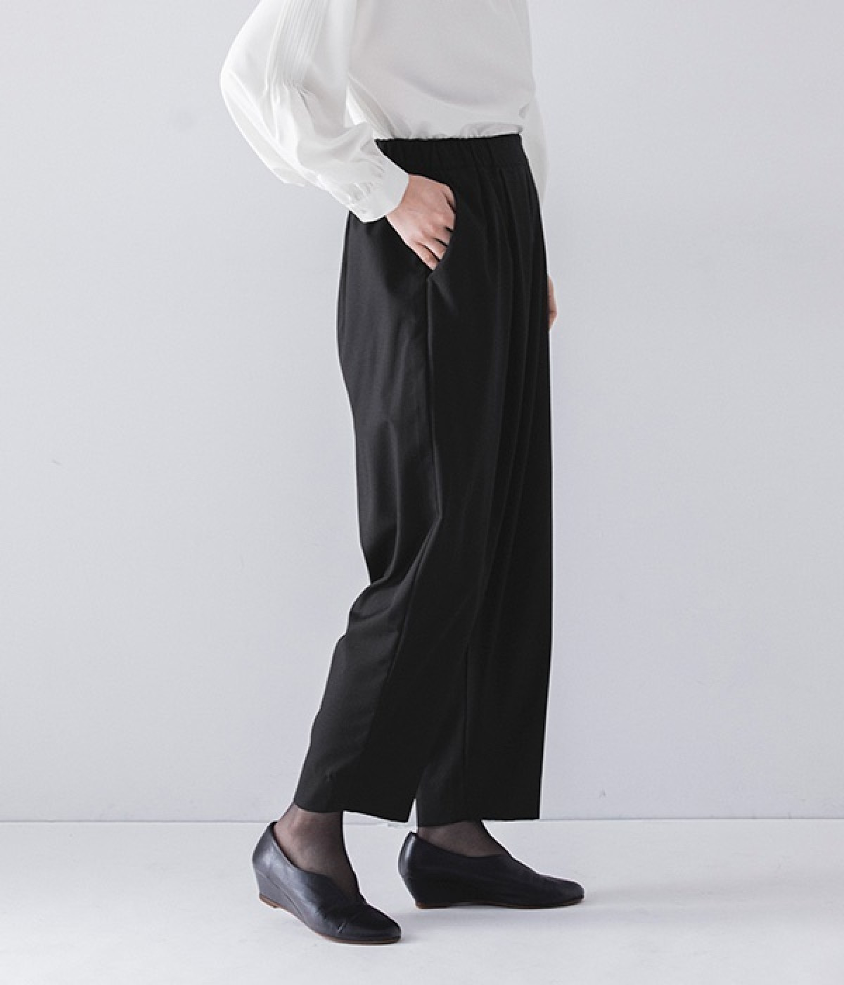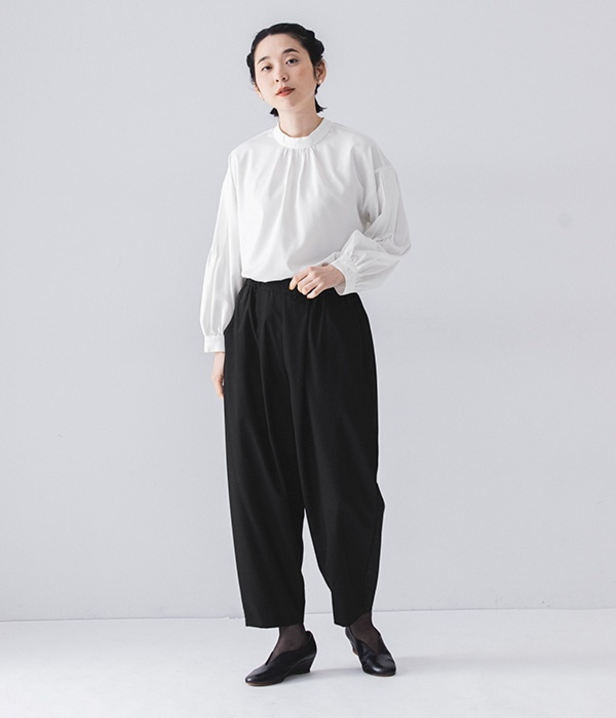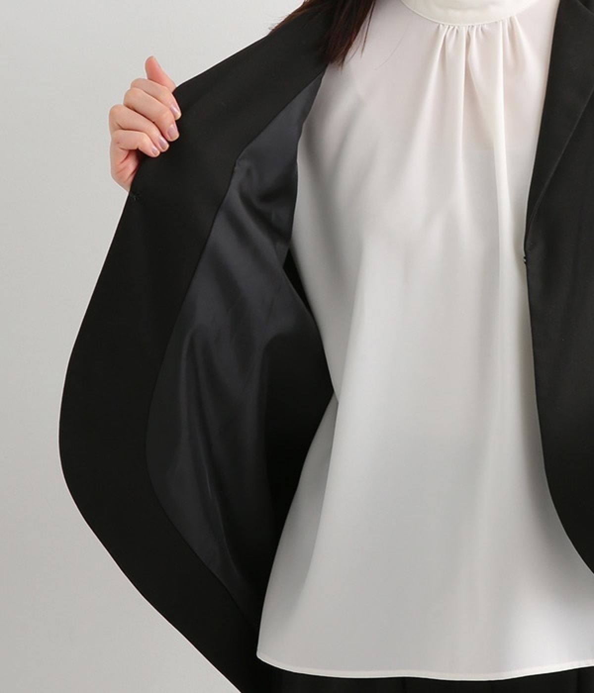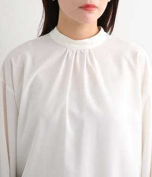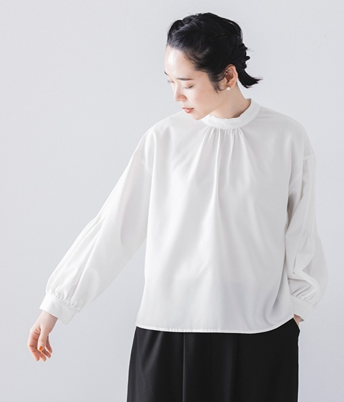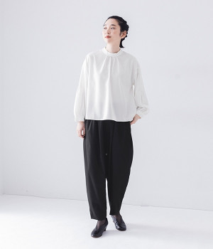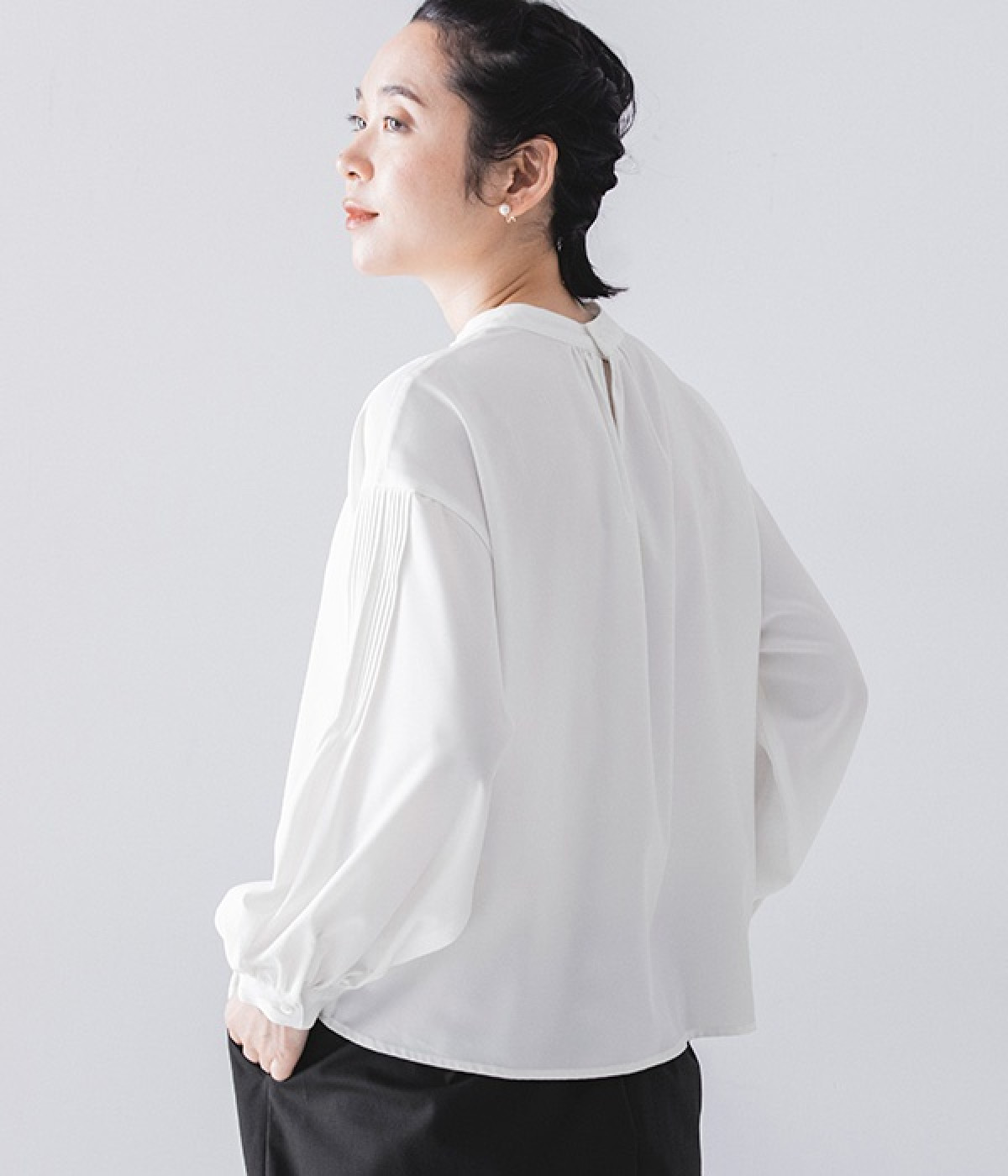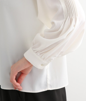 ブラウスはジャケットに合わせたときはシンプルに見え、一枚で着るときは袖のピンタックが女性らしさをプラスしてくれます。