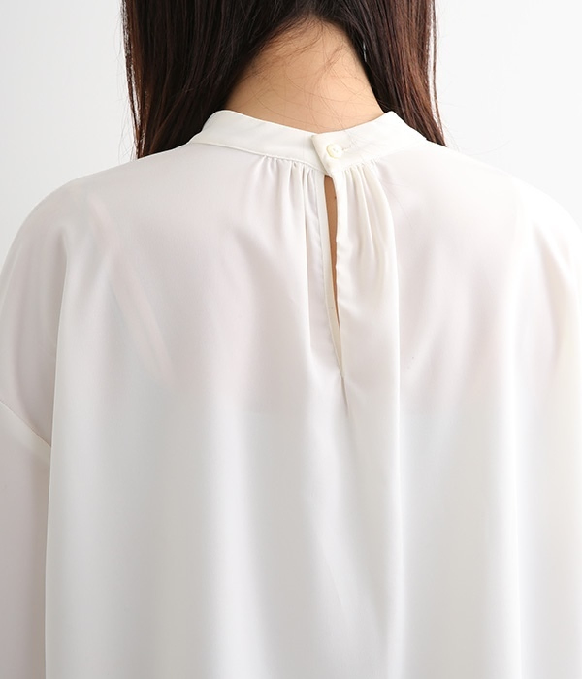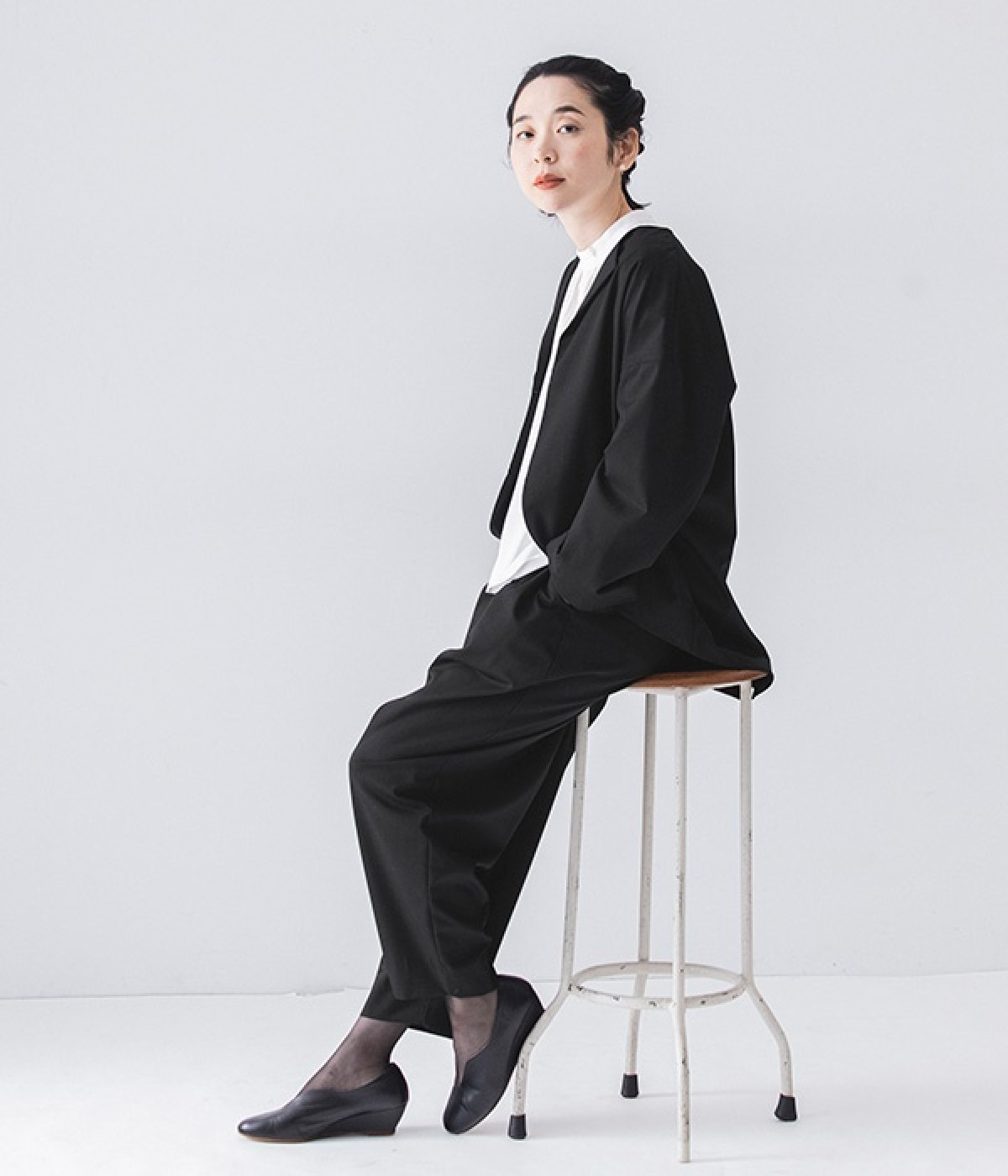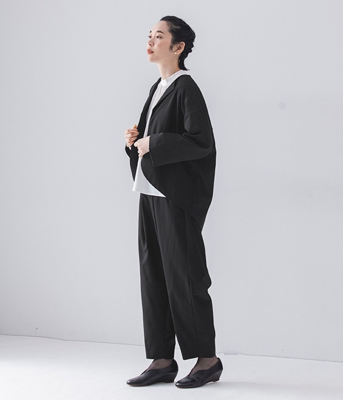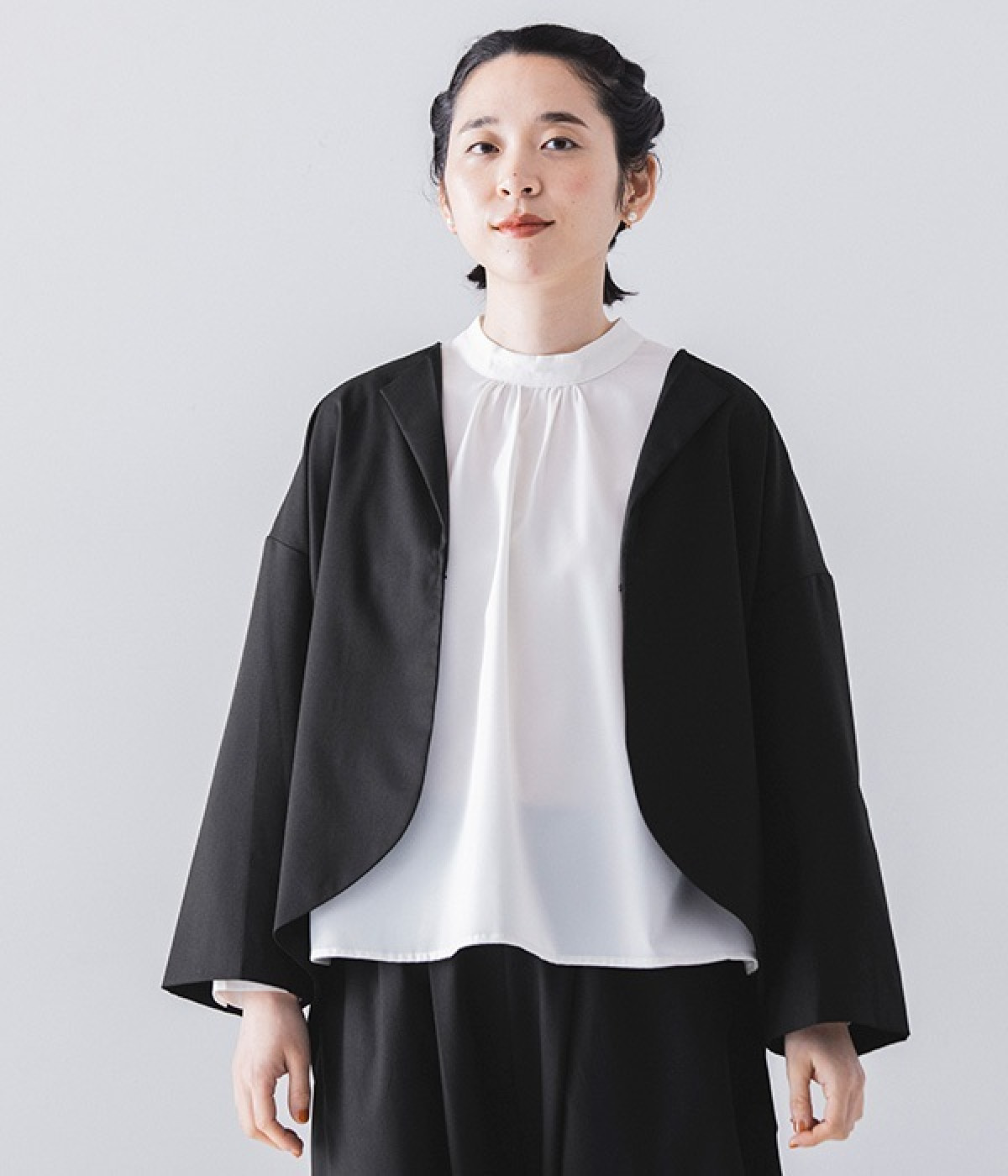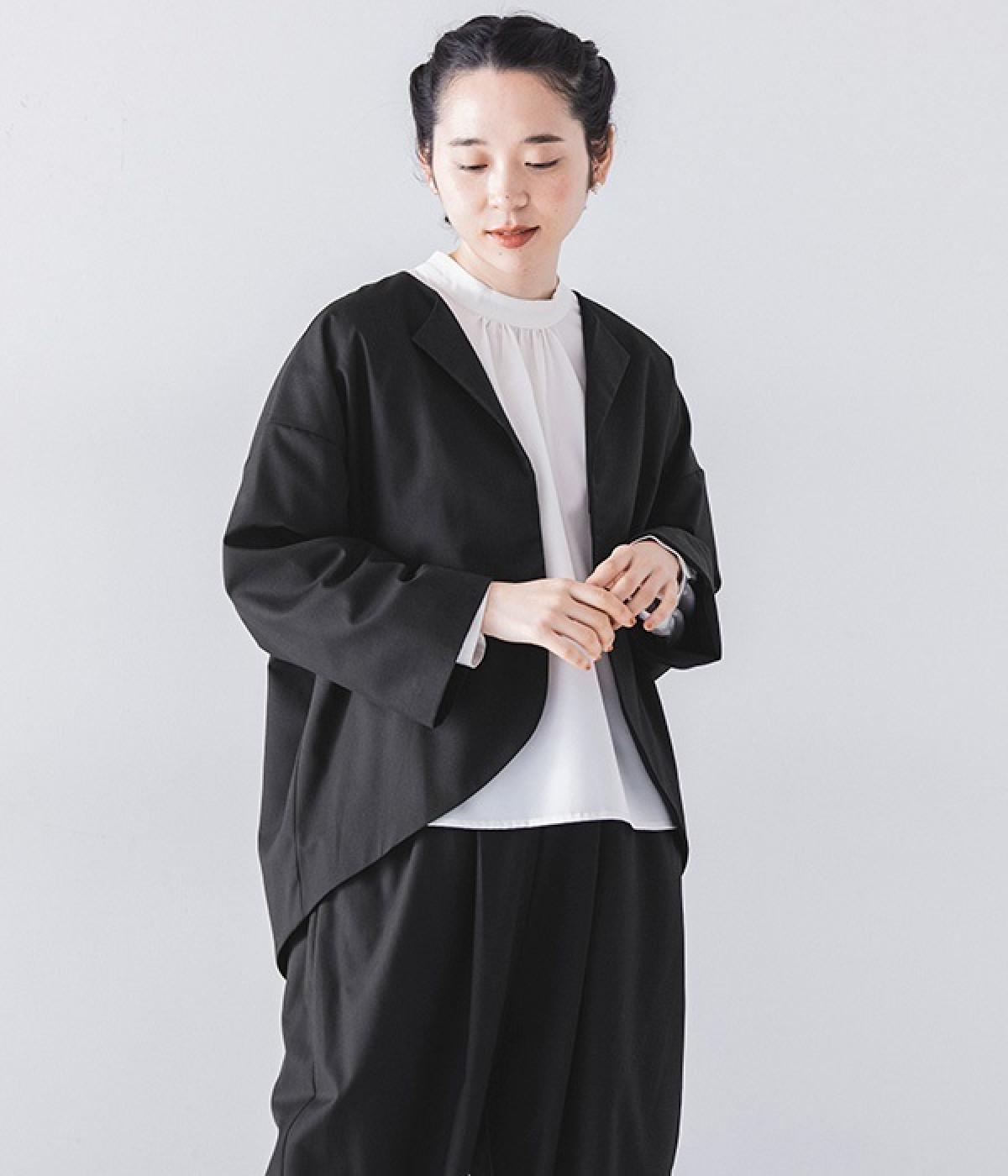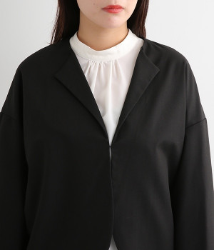 ブラウスはジャケットに合わせたときはシンプルに見え、一枚で着るときは袖のピンタックが女性らしさをプラスしてくれます。