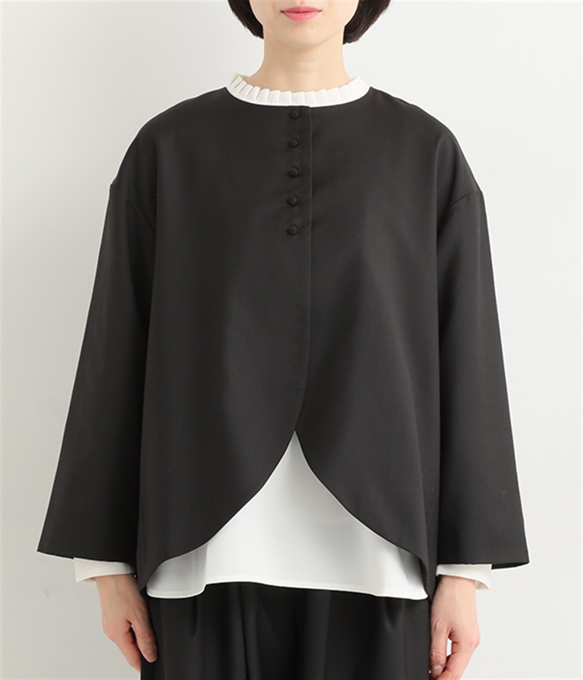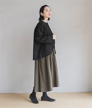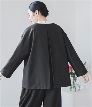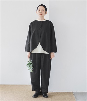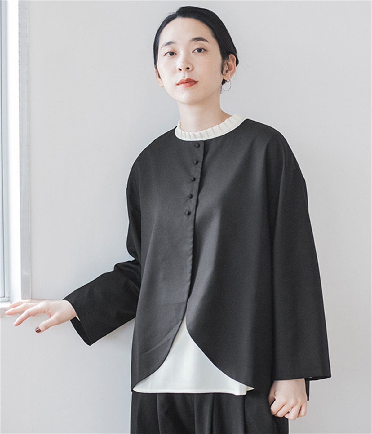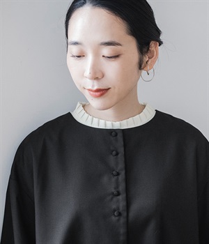 襟ぐりにくるみボタンを集中させてインナー合わせをラクに
