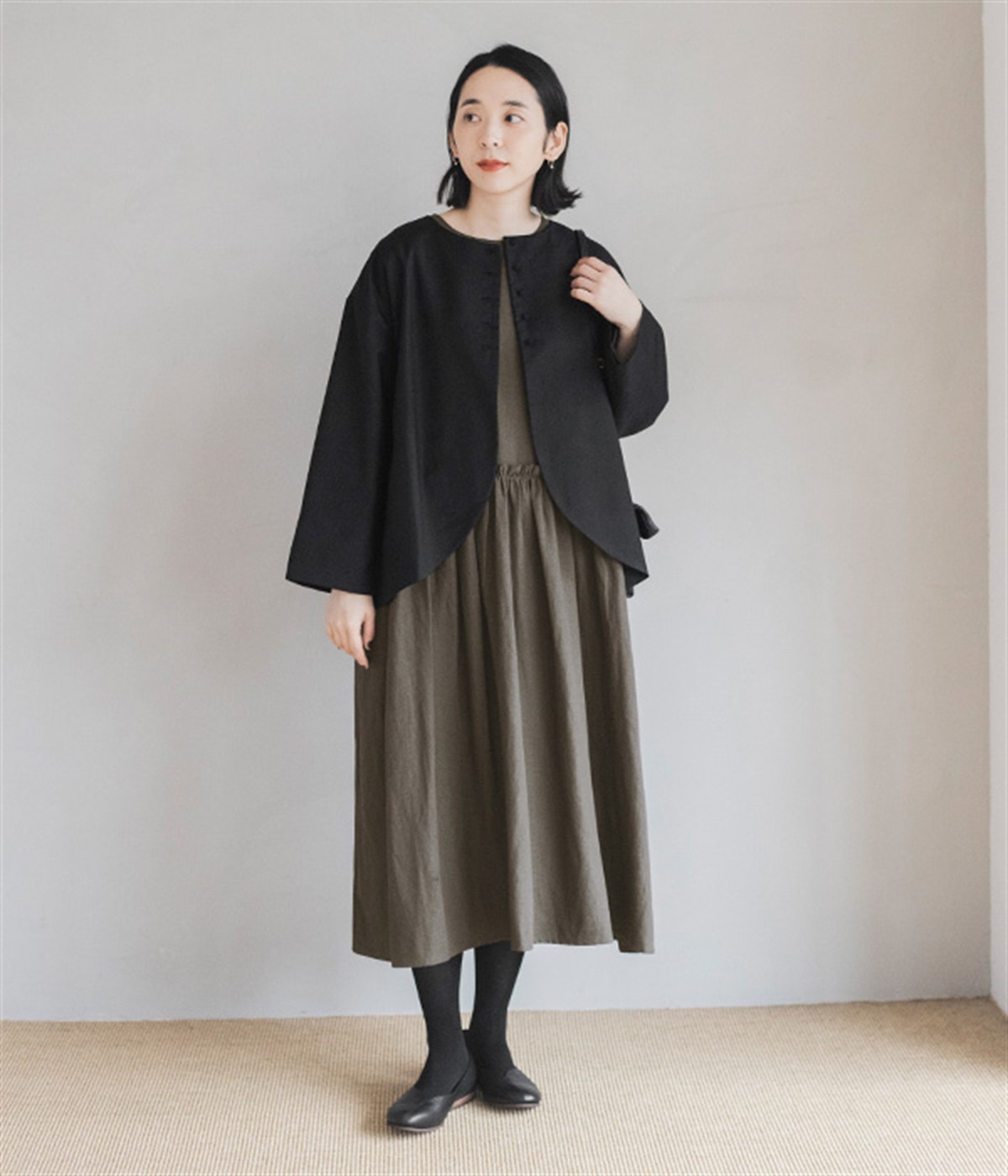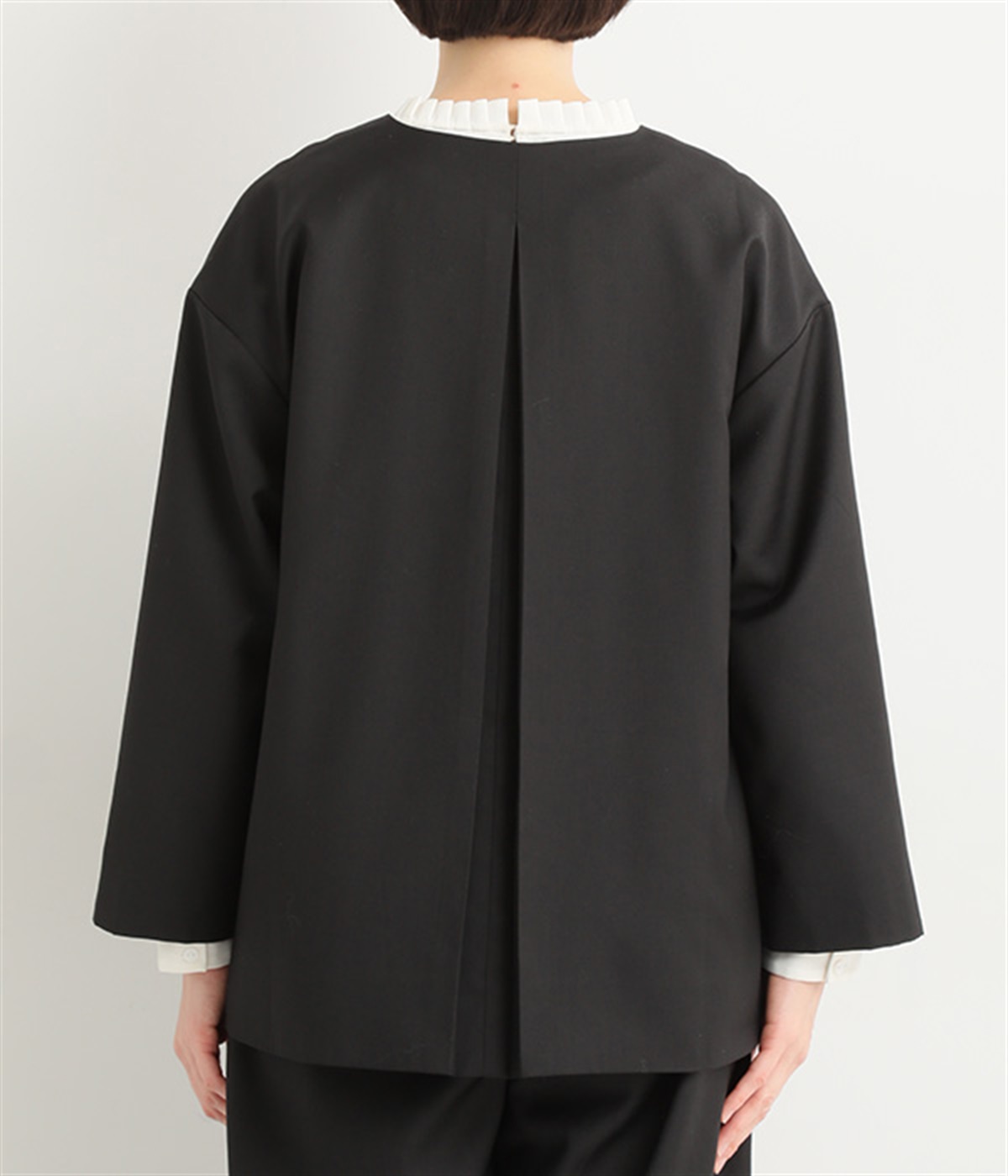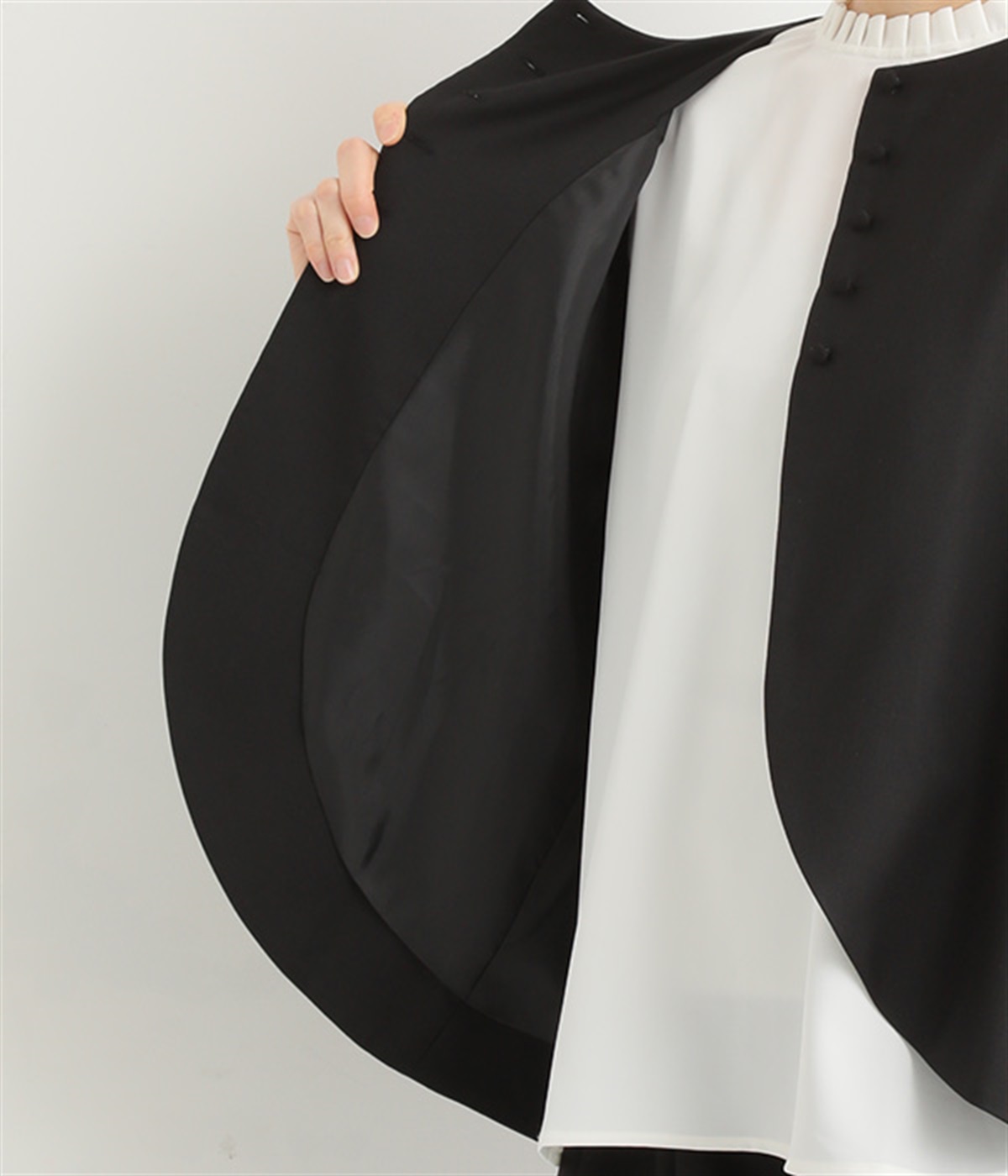 襟ぐりにくるみボタンを集中させてインナー合わせをラクに