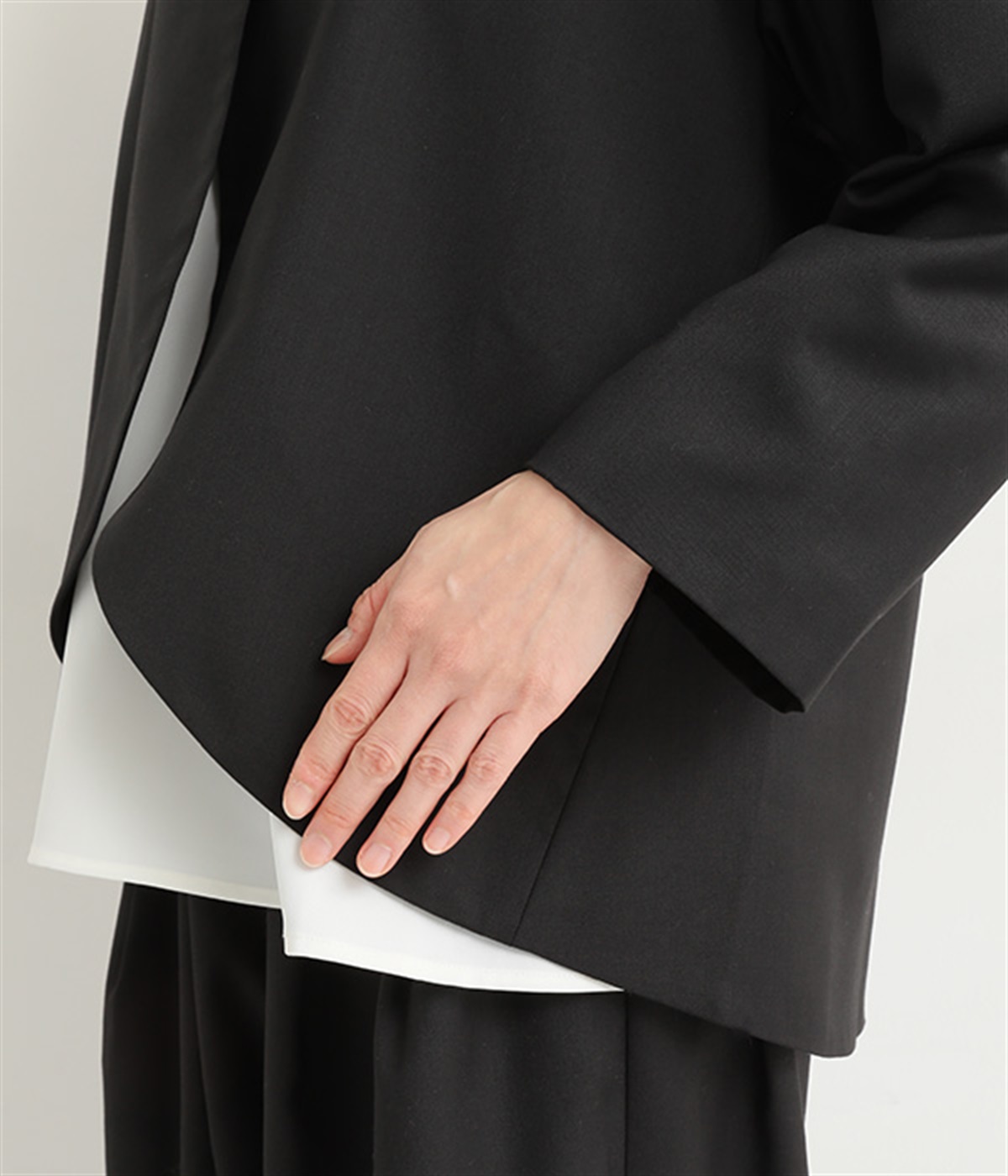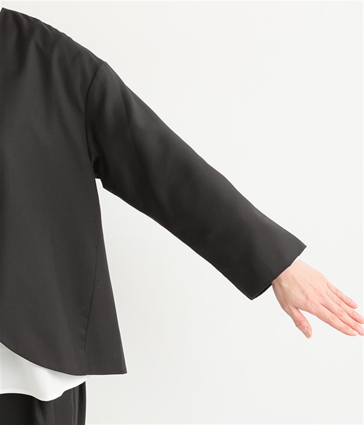 前合わせに大きくカーブをつけて、すっきりと抜け感を