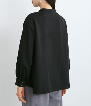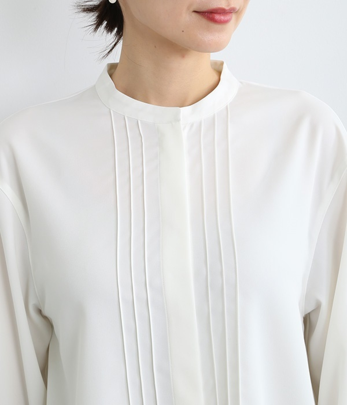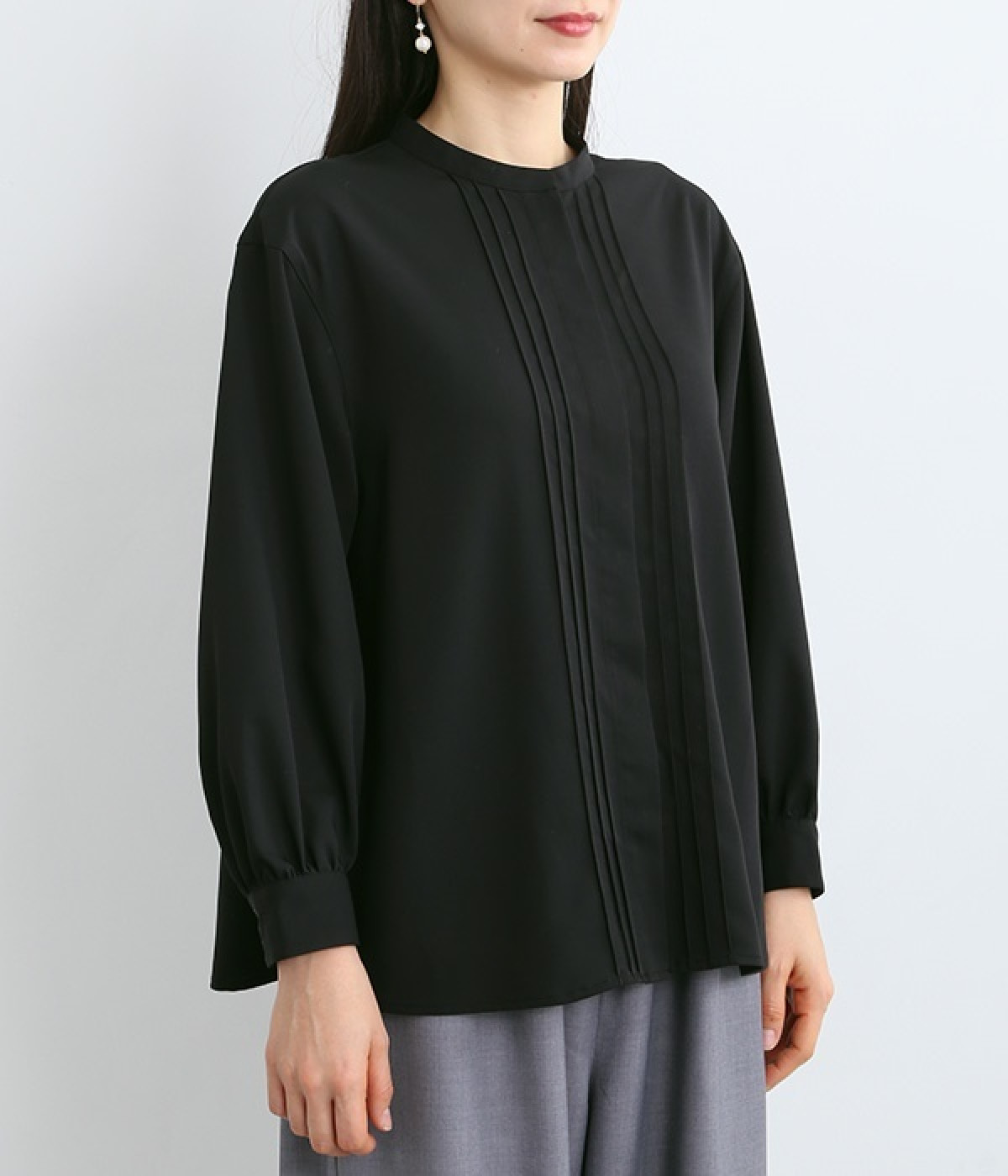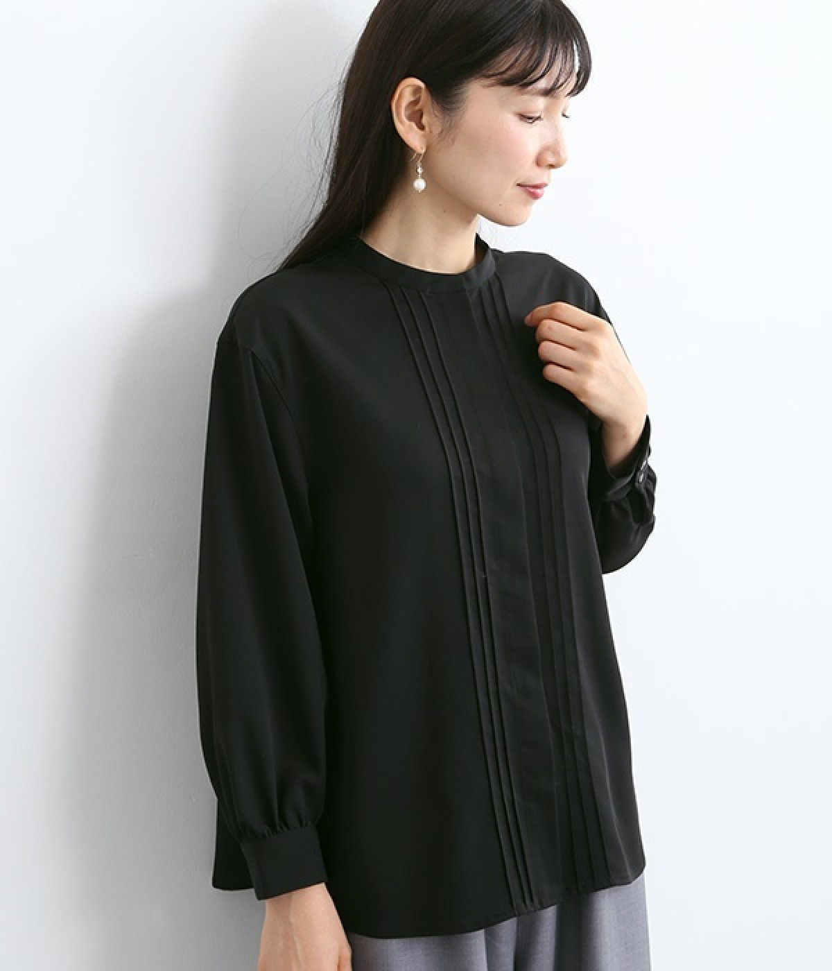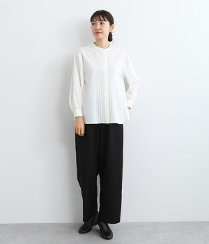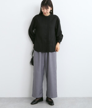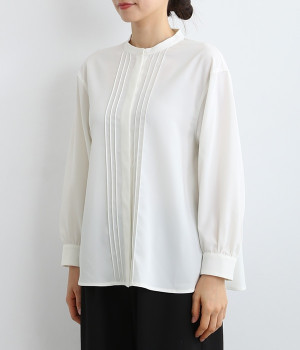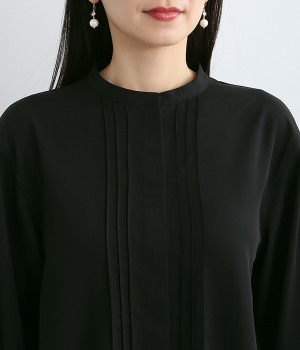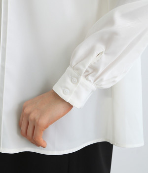 スタイリングに品の良さをプラスする、前立てに寄り添うピンタックがポイントのブラウス。すべるようななめらかさと、美しいドレープが活きる光沢を持った素材で仕立てています。風合いの上品さやピンタックを引き立てるため、フロントはボタンを隠す比翼ですっきりと。きれいめな雰囲気たっぷりの見た目ながら、ポリエステル混でシワが発生しにくいのでデイリー使いに適しています。