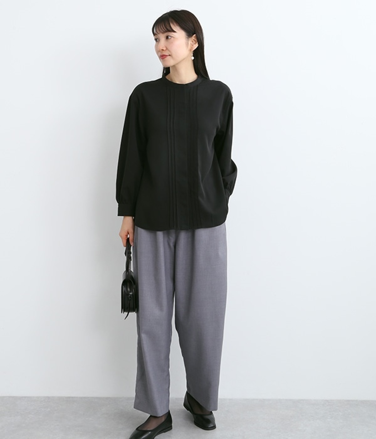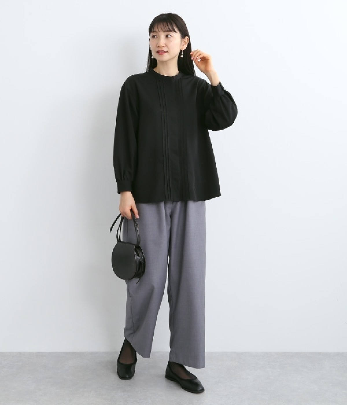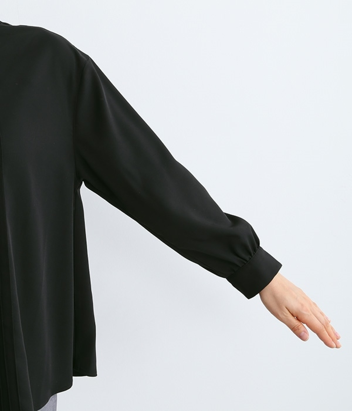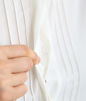 スタイリングに品の良さをプラスする、前立てに寄り添うピンタックがポイントのブラウス。すべるようななめらかさと、美しいドレープが活きる光沢を持った素材で仕立てています。風合いの上品さやピンタックを引き立てるため、フロントはボタンを隠す比翼ですっきりと。きれいめな雰囲気たっぷりの見た目ながら、ポリエステル混でシワが発生しにくいのでデイリー使いに適しています。