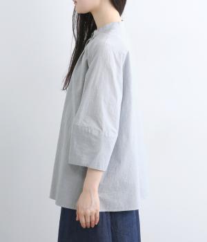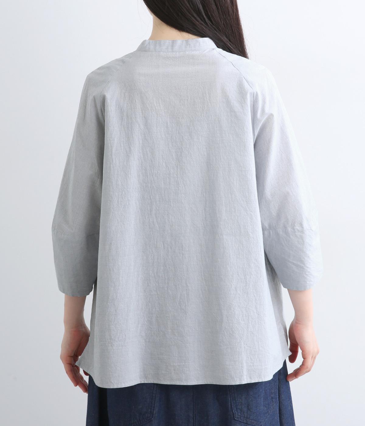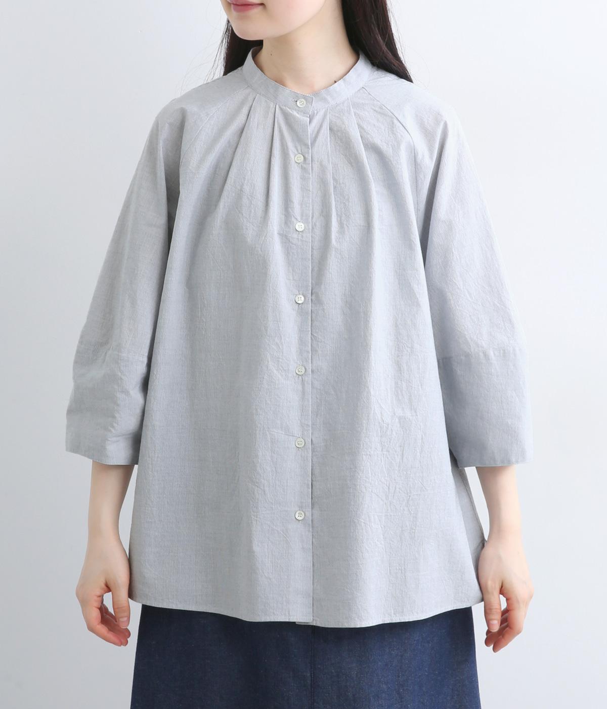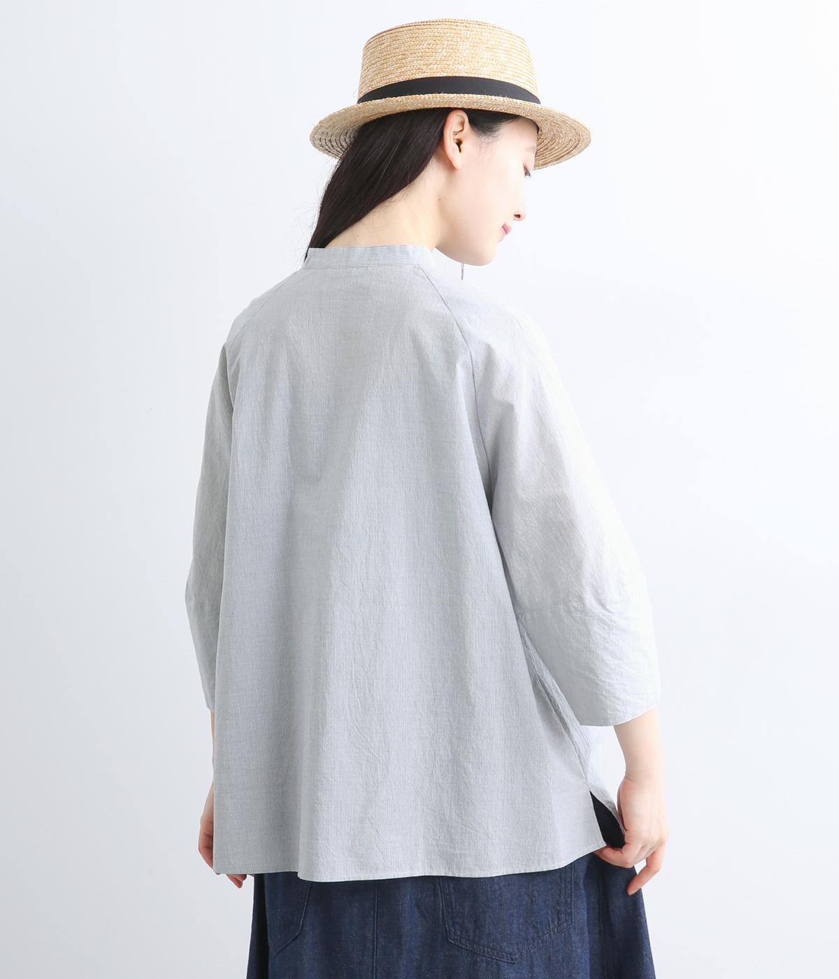ラグラン型のランタンスリーブで袖まわりに丸みを帯びたシルエットが特徴的なブラウス。襟ぐりタックで身頃にも自然な立体感が生まれ、風通しもよく涼し気でさわやかな印象に。裾スリット入りなのでラフなトップスアウトの着こなしもきまります。