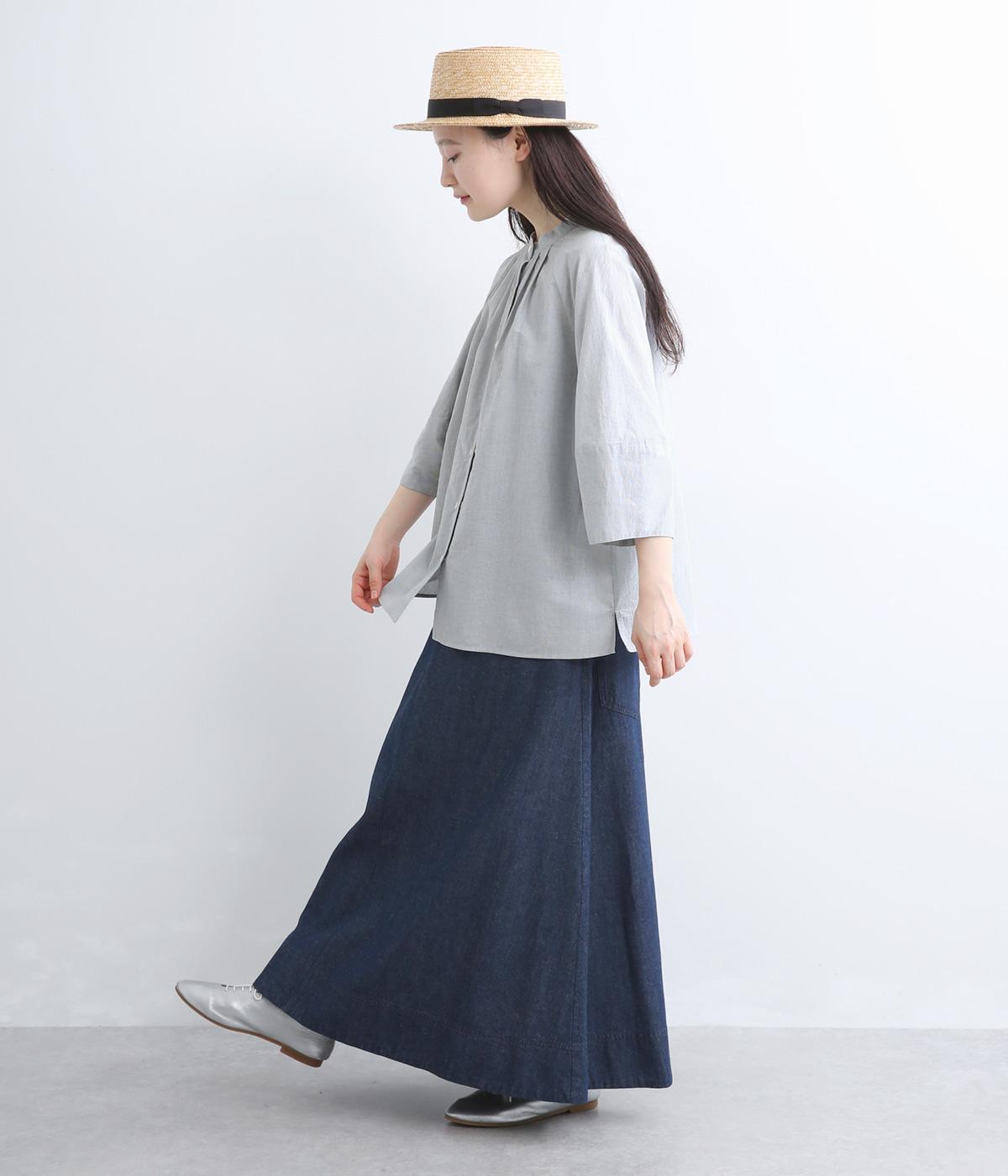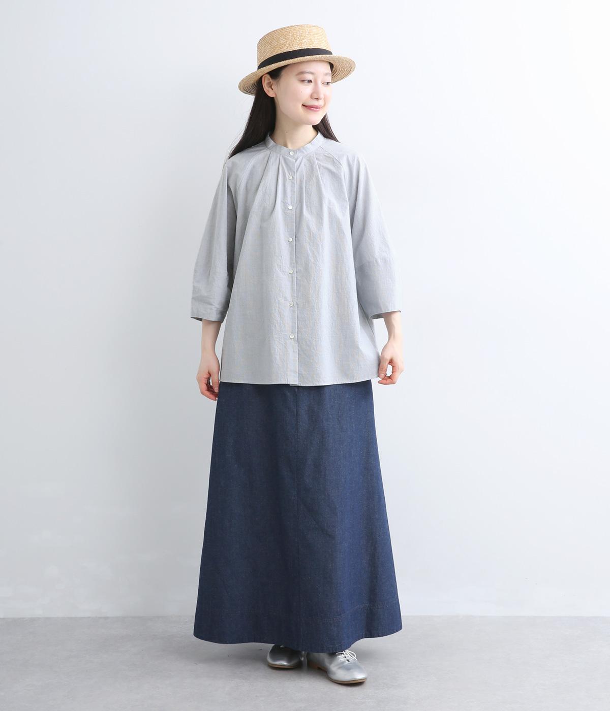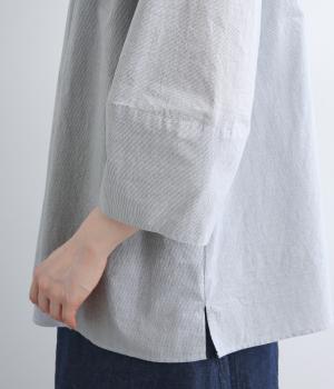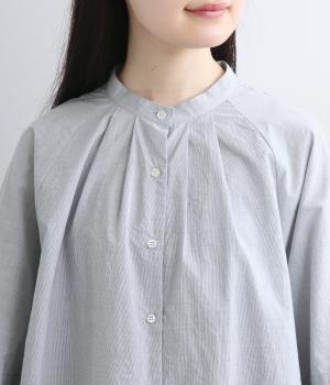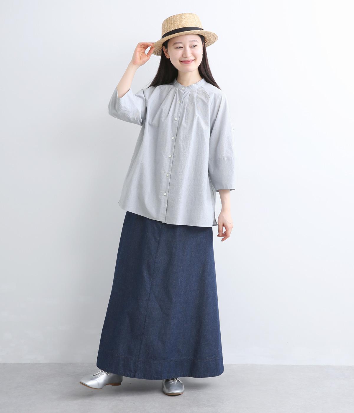 ラグラン型のランタンスリーブで袖まわりに丸みを帯びたシルエットが特徴的なブラウス。襟ぐりタックで身頃にも自然な立体感が生まれ、風通しもよく涼し気でさわやかな印象に。裾スリット入りなのでラフなトップスアウトの着こなしもきまります。