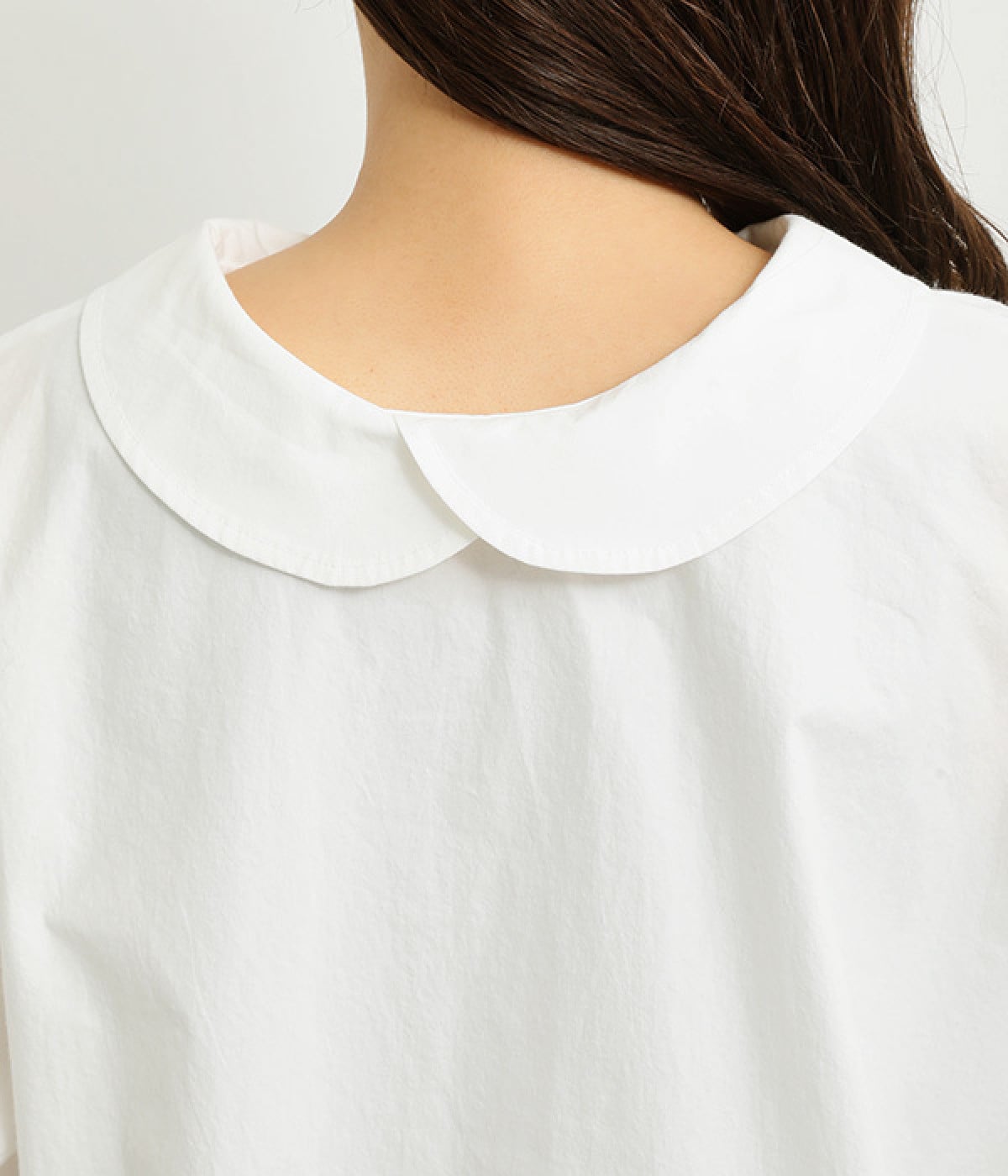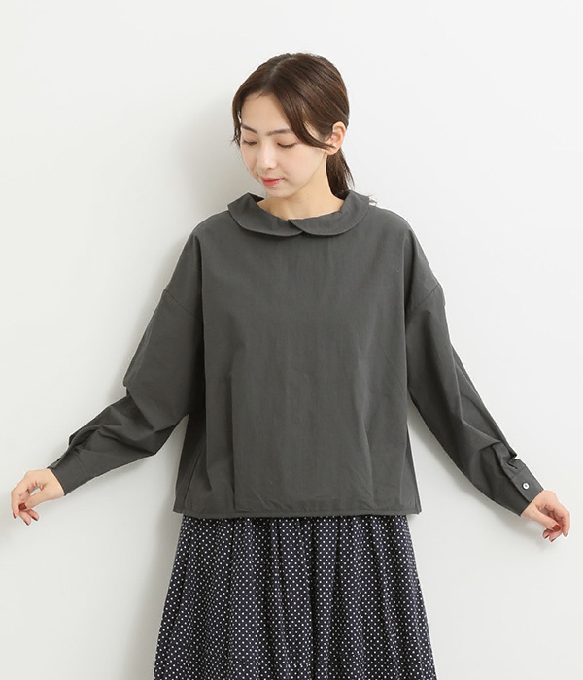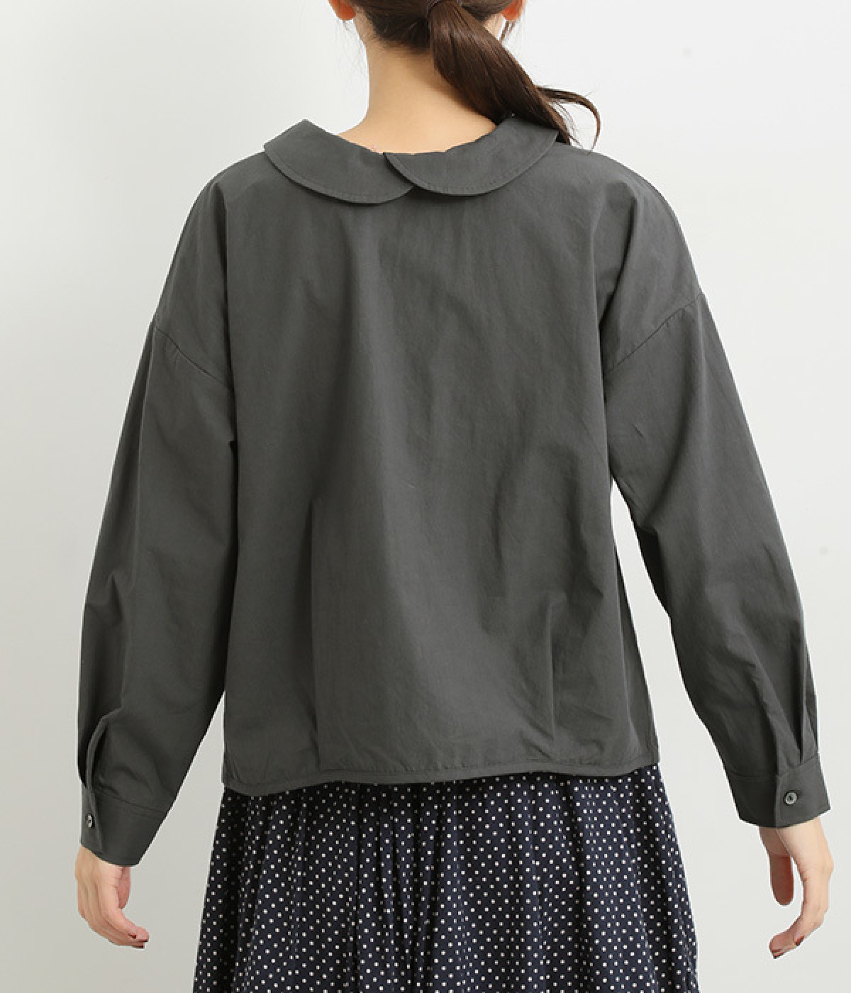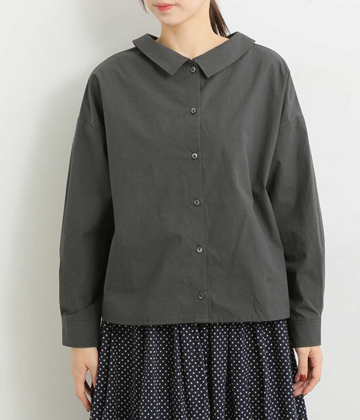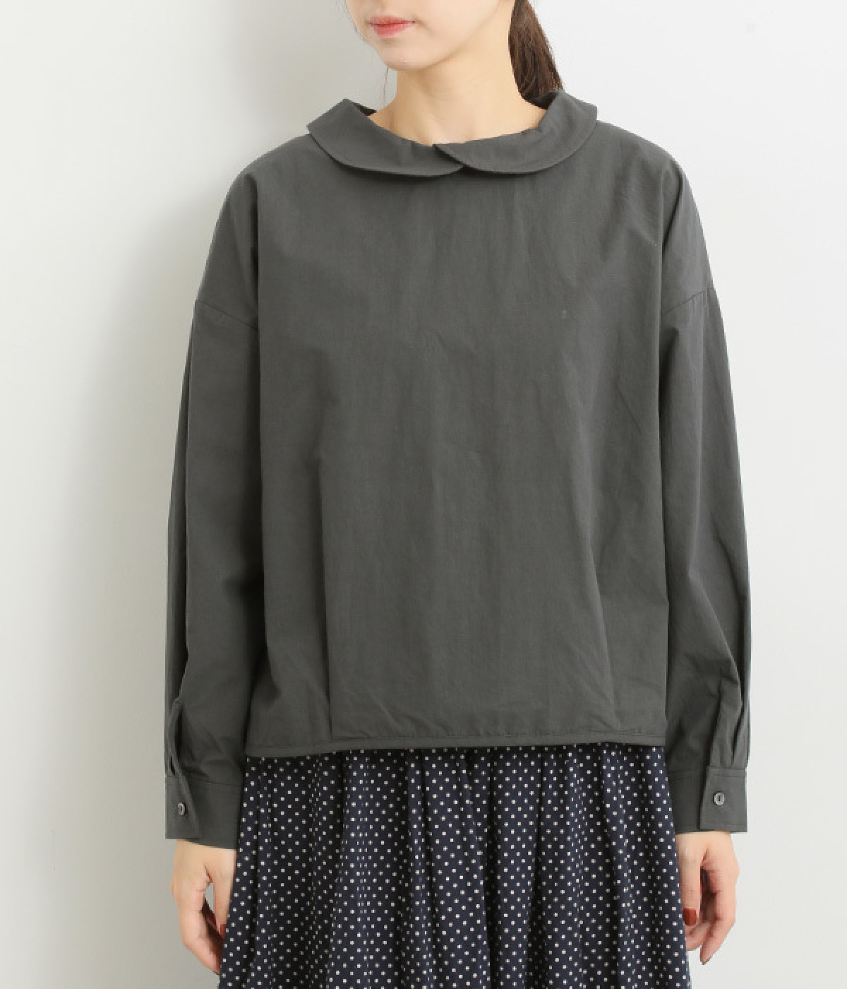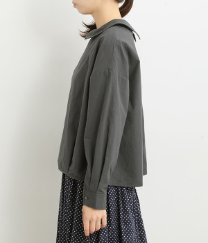 小さめのレギュラーカラーとカシュクールした丸襟で表情ががらりと変化