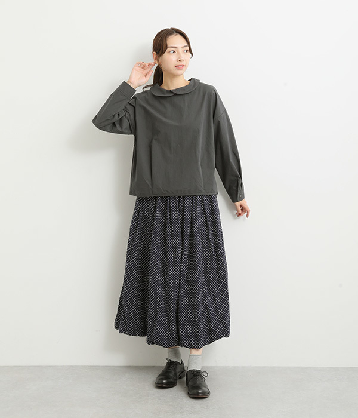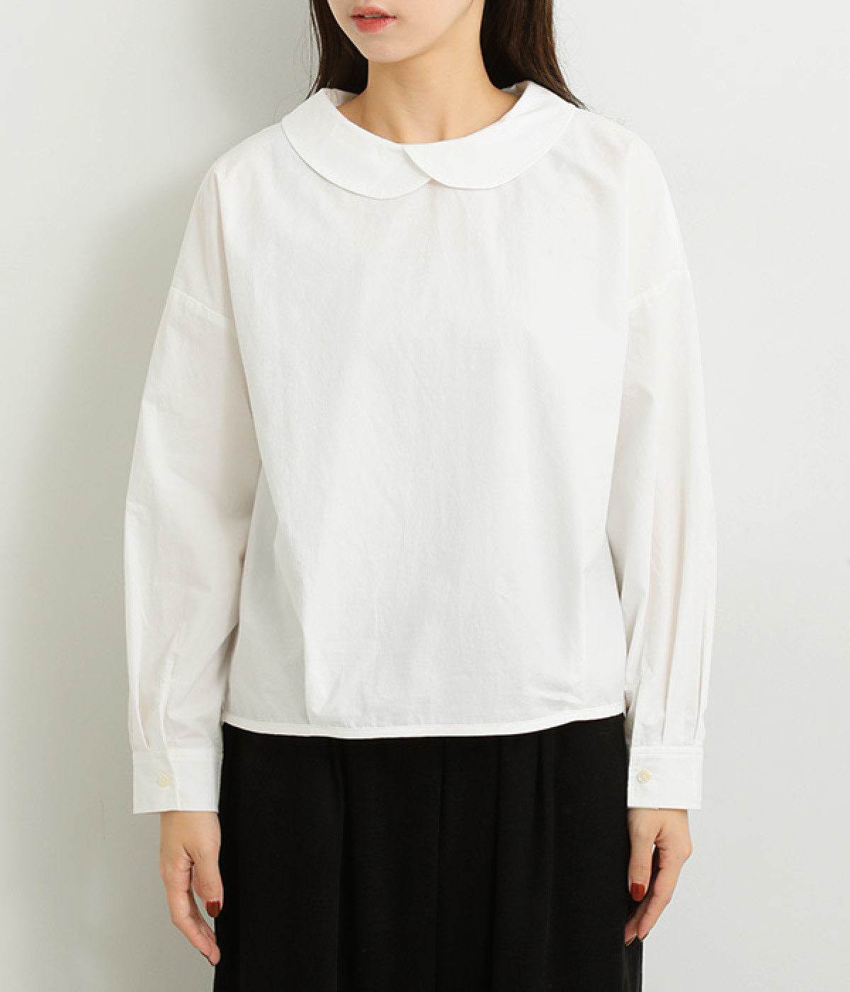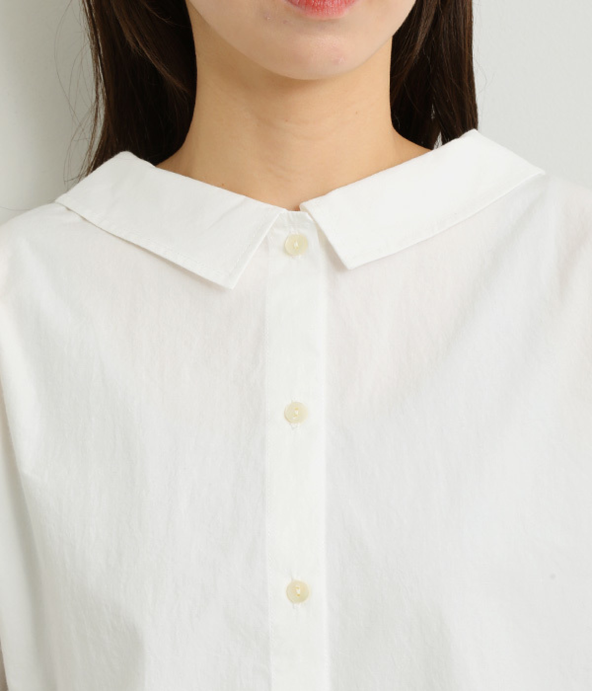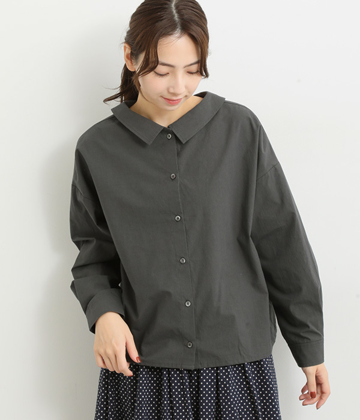 小さめのレギュラーカラーとカシュクールした丸襟で表情ががらりと変化
