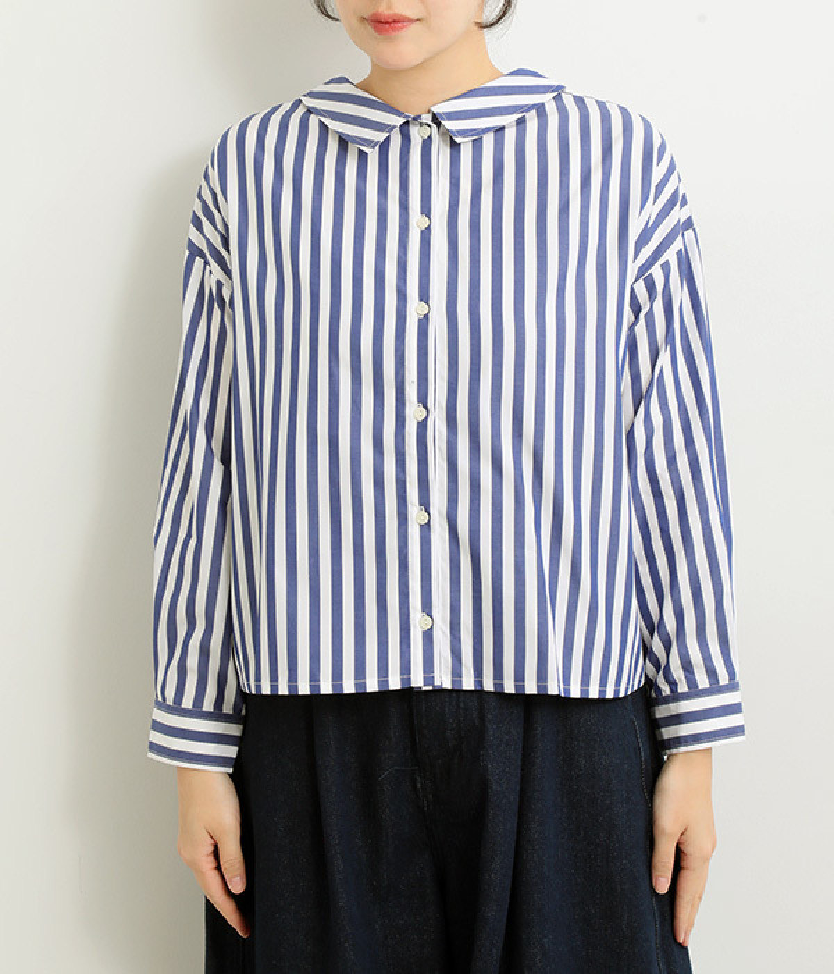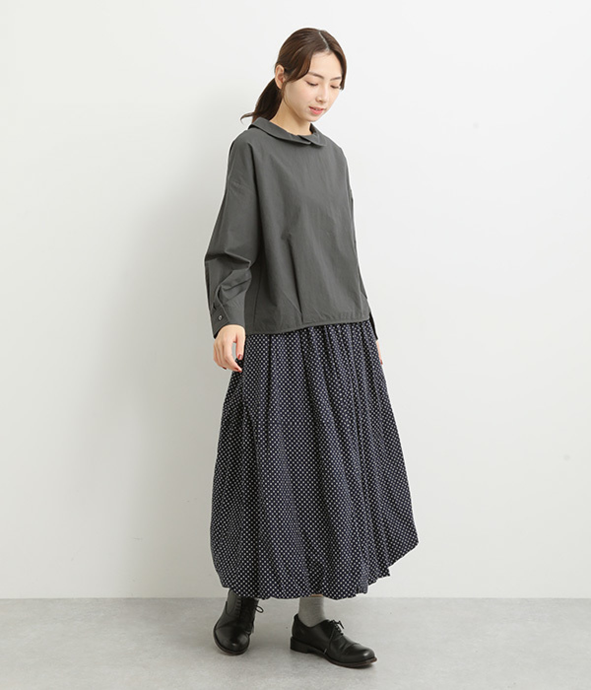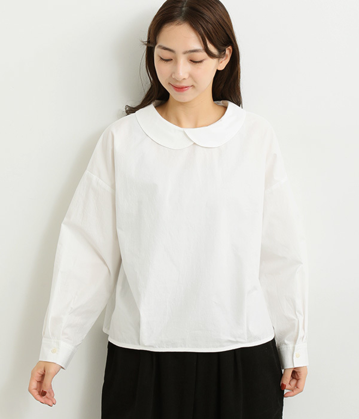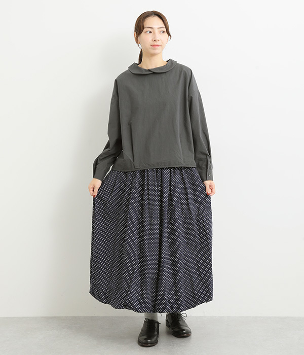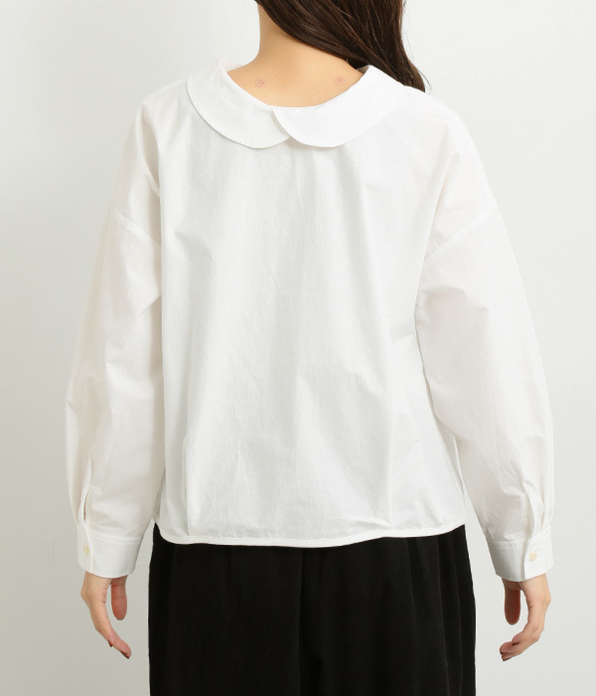小さめのレギュラーカラーとカシュクールした丸襟で表情ががらりと変化