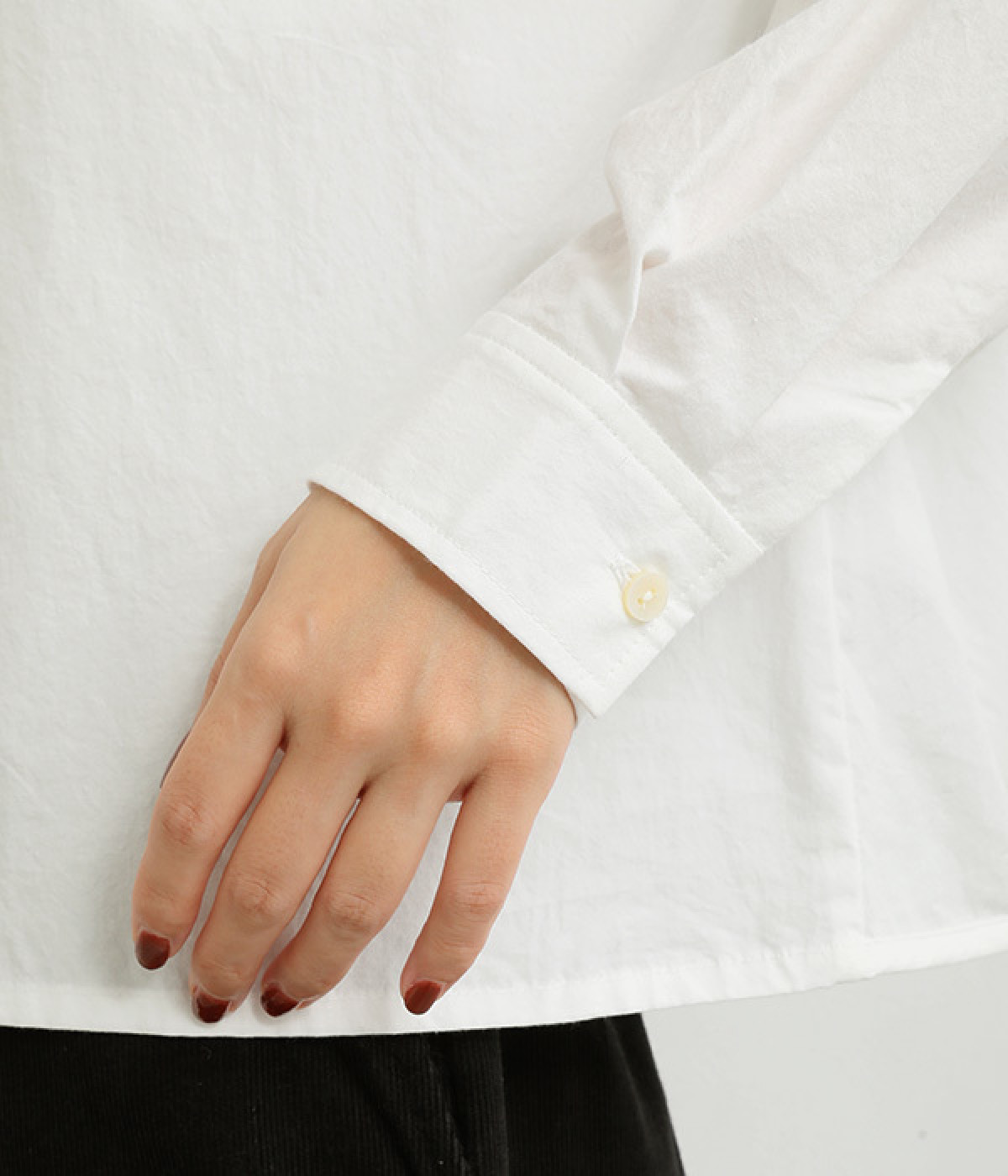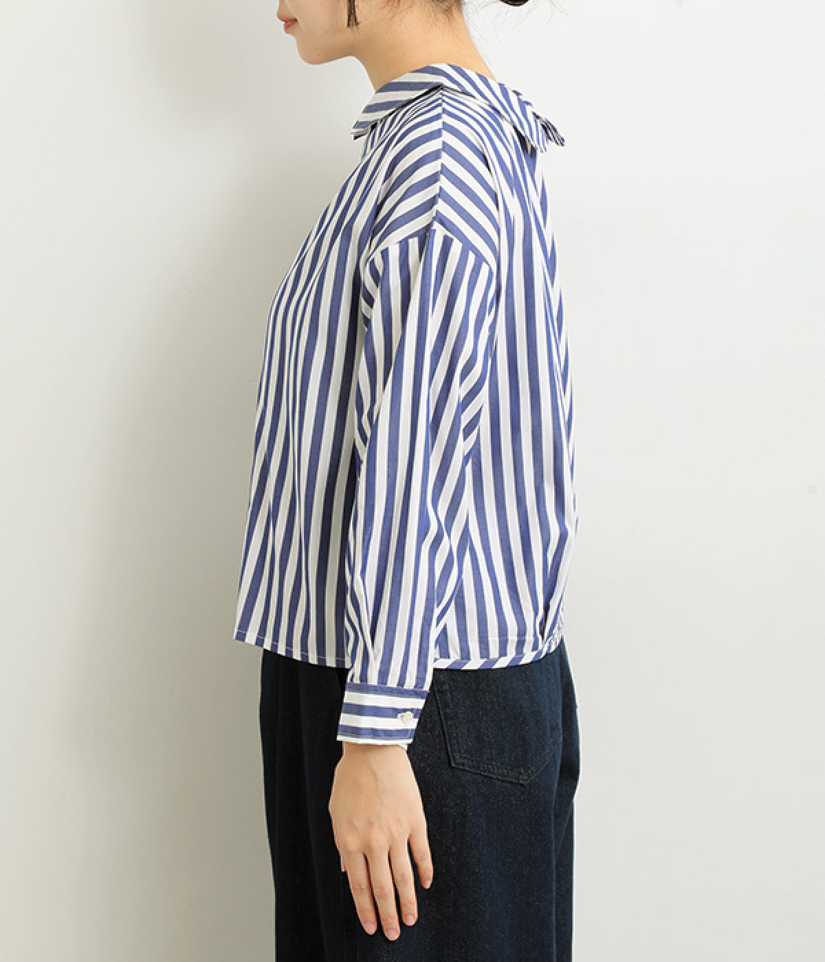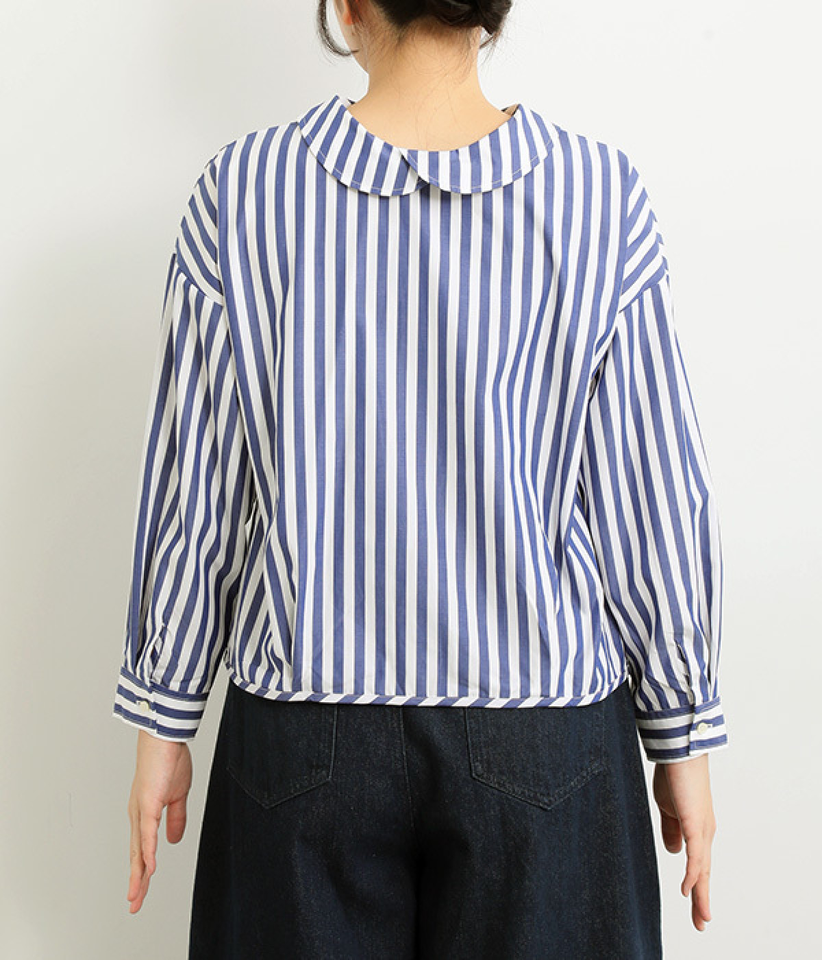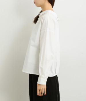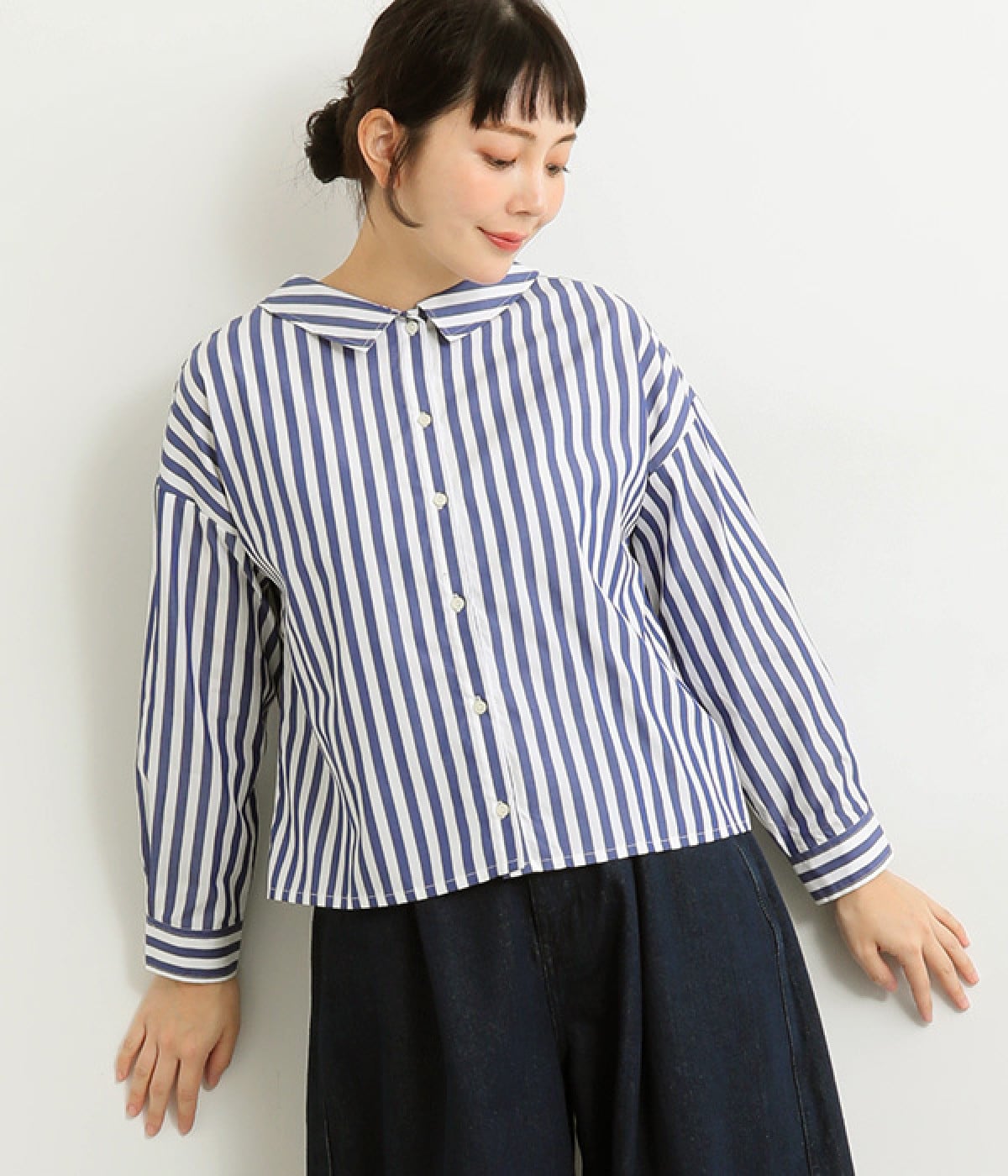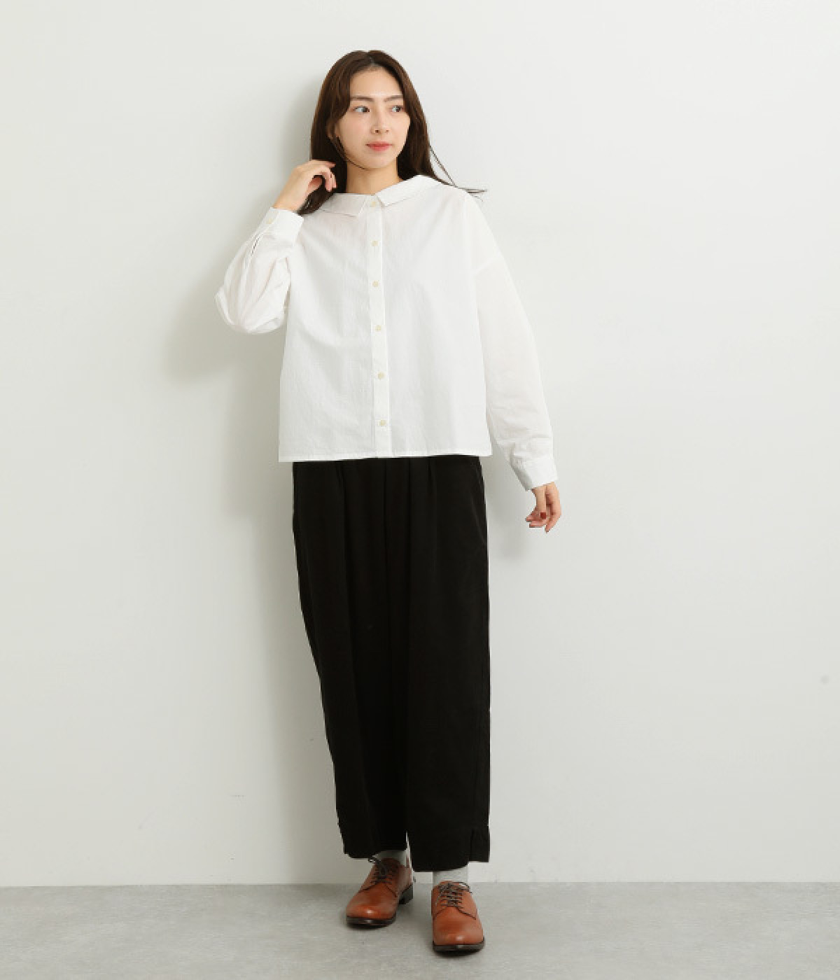小さめのレギュラーカラーとカシュクールした丸襟で表情ががらりと変化