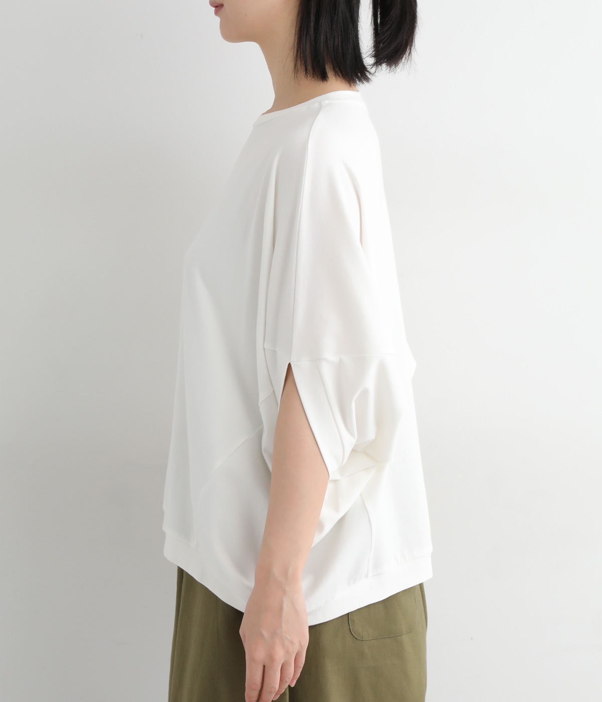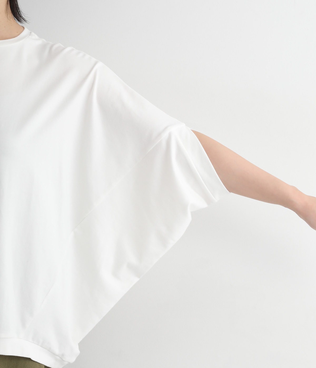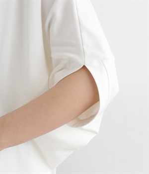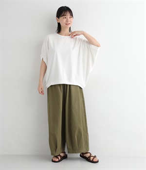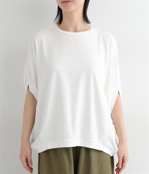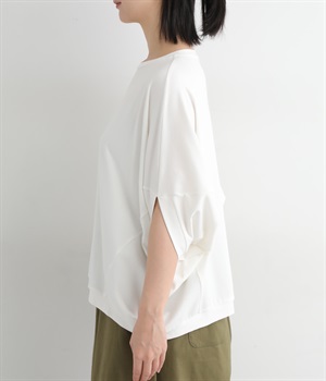 ゆったりとしたシルエットにポンチョスリーブが特徴的なプルオーバーです。着用すると脇下からサイドが自然と垂れるつくりに。カジュアルテイストな素材ながらドレープが生まれて、大人顔なスタイリングがたのしめる一枚です。