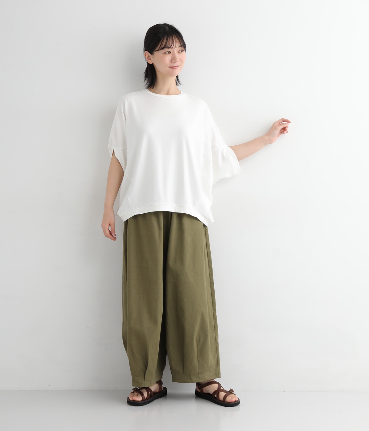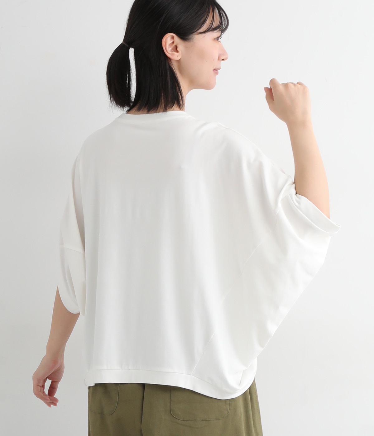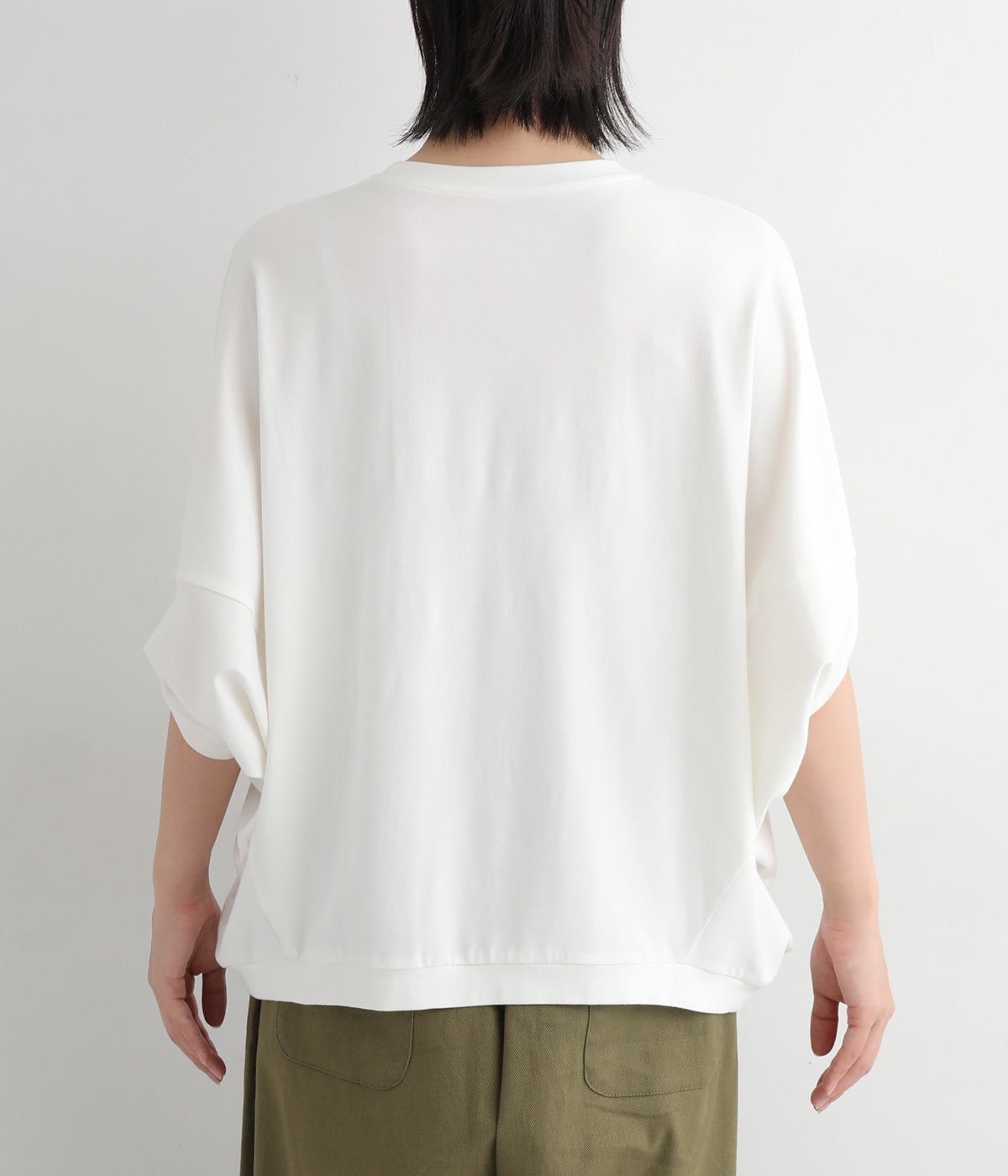 ゆったりとしたシルエットにポンチョスリーブが特徴的なプルオーバーです。着用すると脇下からサイドが自然と垂れるつくりに。カジュアルテイストな素材ながらドレープが生まれて、大人顔なスタイリングがたのしめる一枚です。