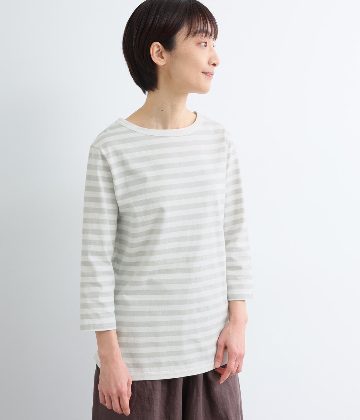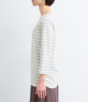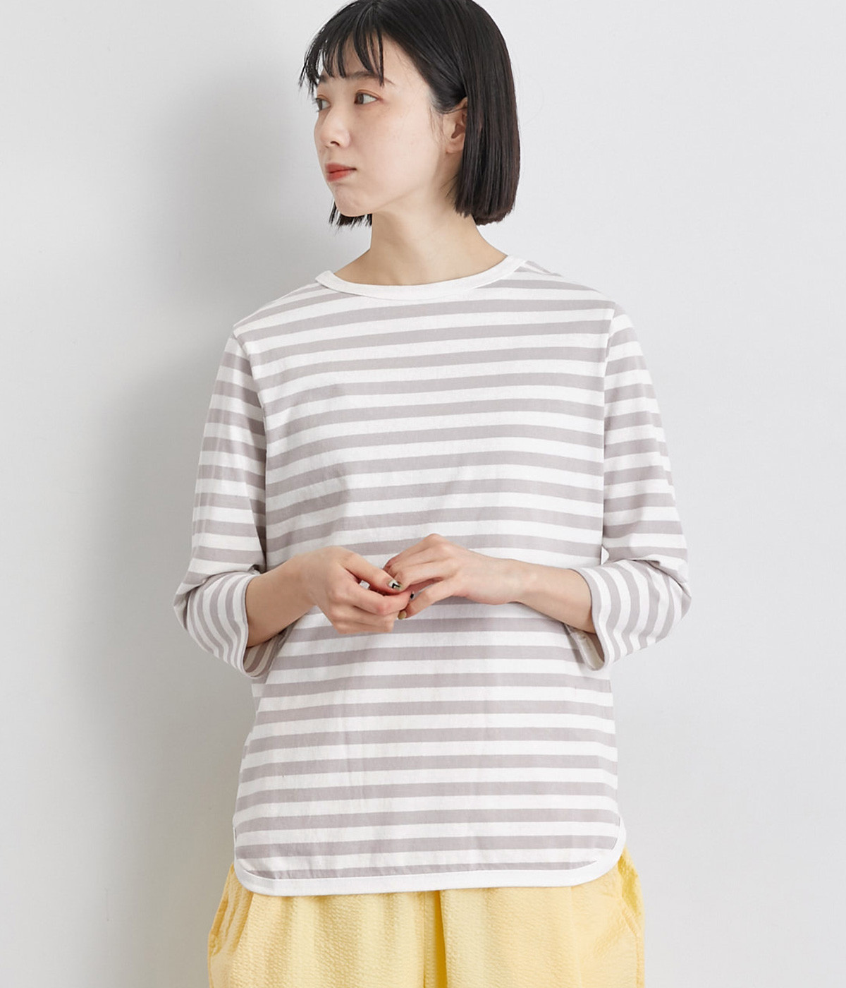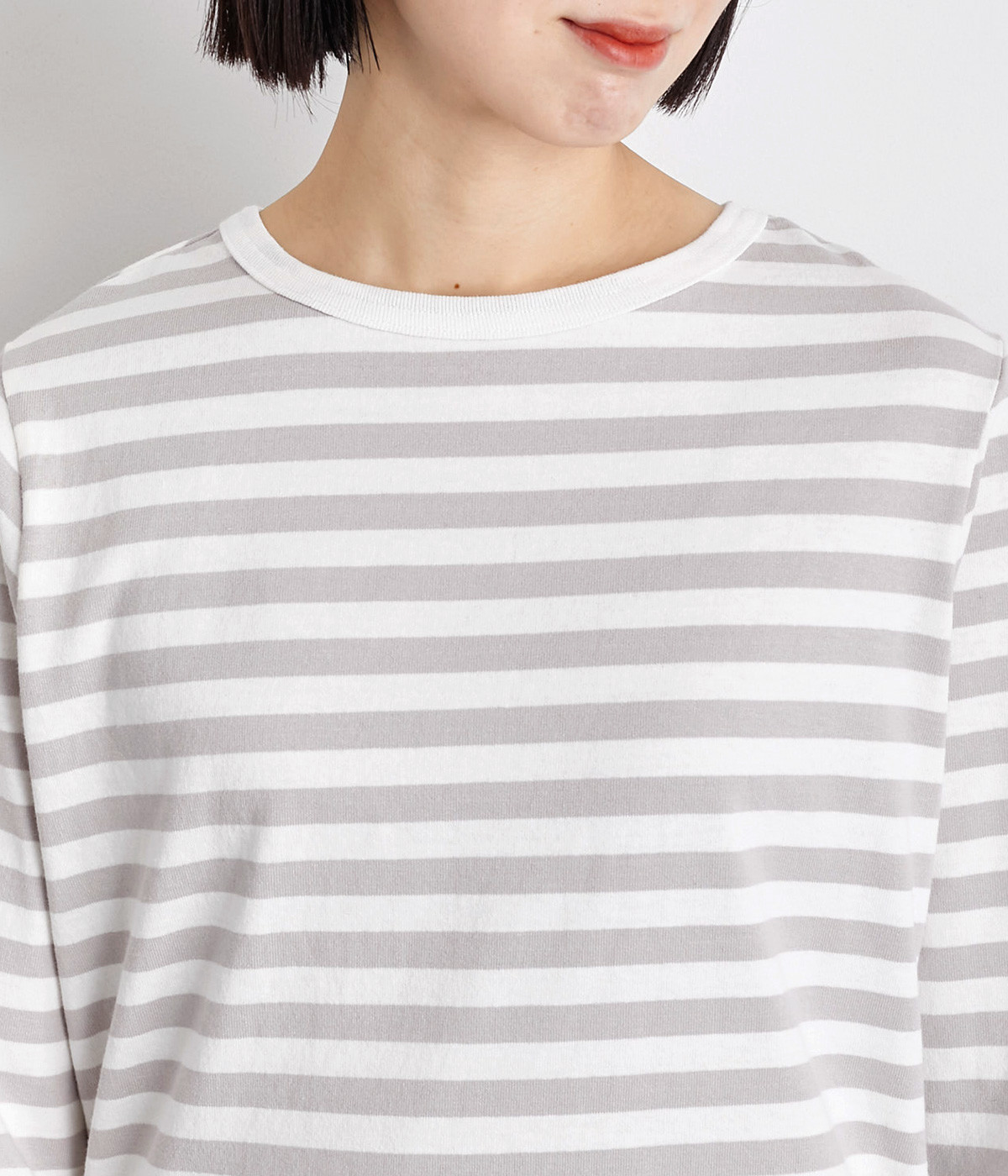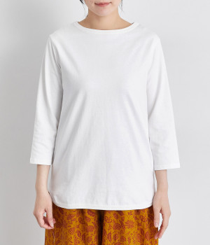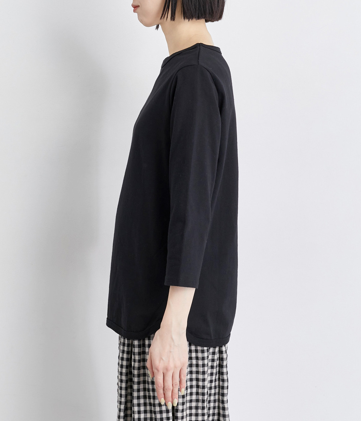 サラッと快適な着心地のコットン天竺生地です。独特の風合いを出す加工をほどこし、一枚一枚異なる味わいが魅力です。ほどよい厚みでデイリー使いにぴったりな素材感です。