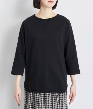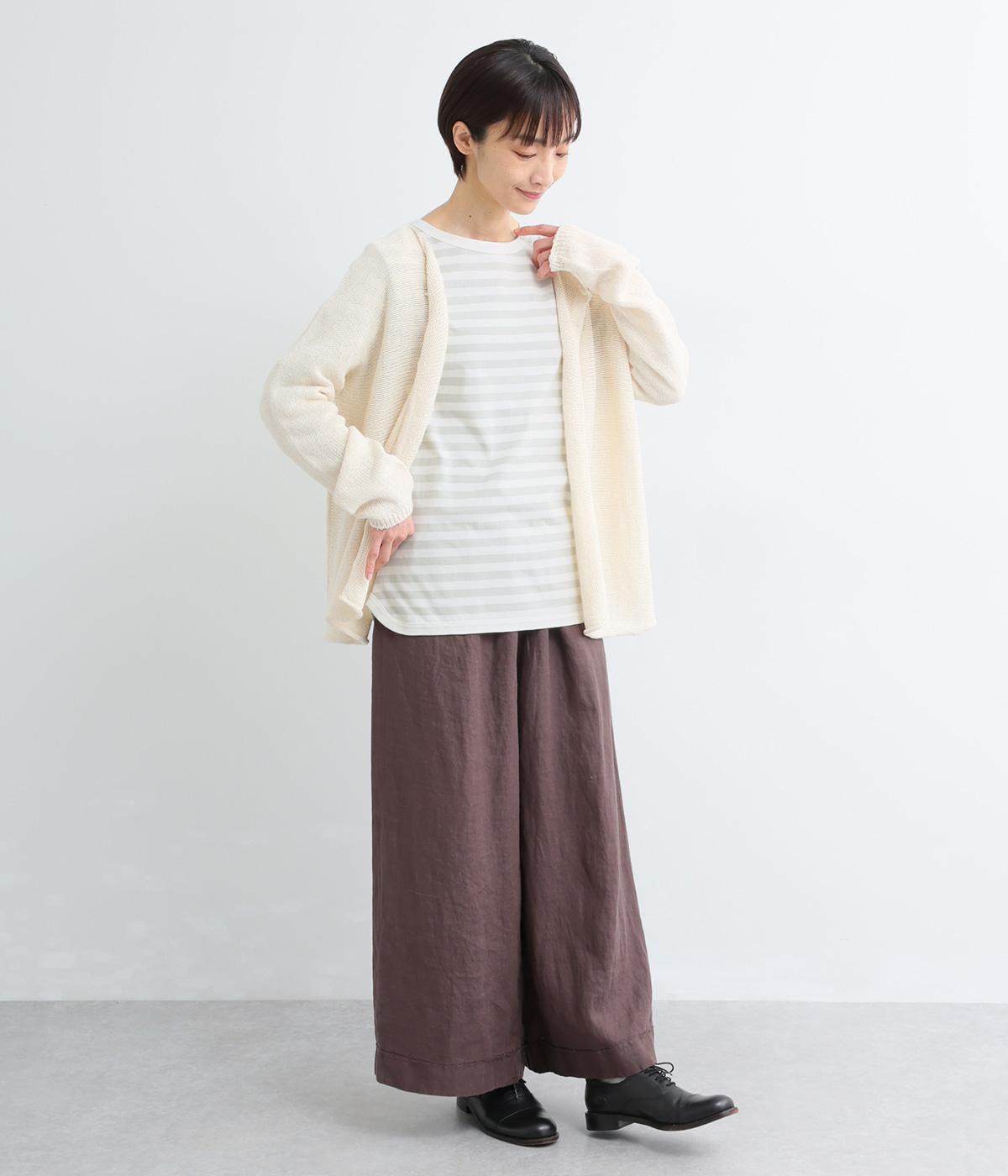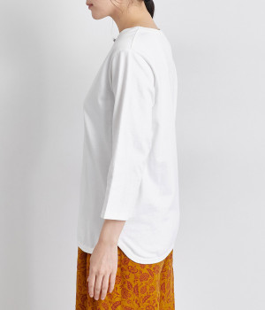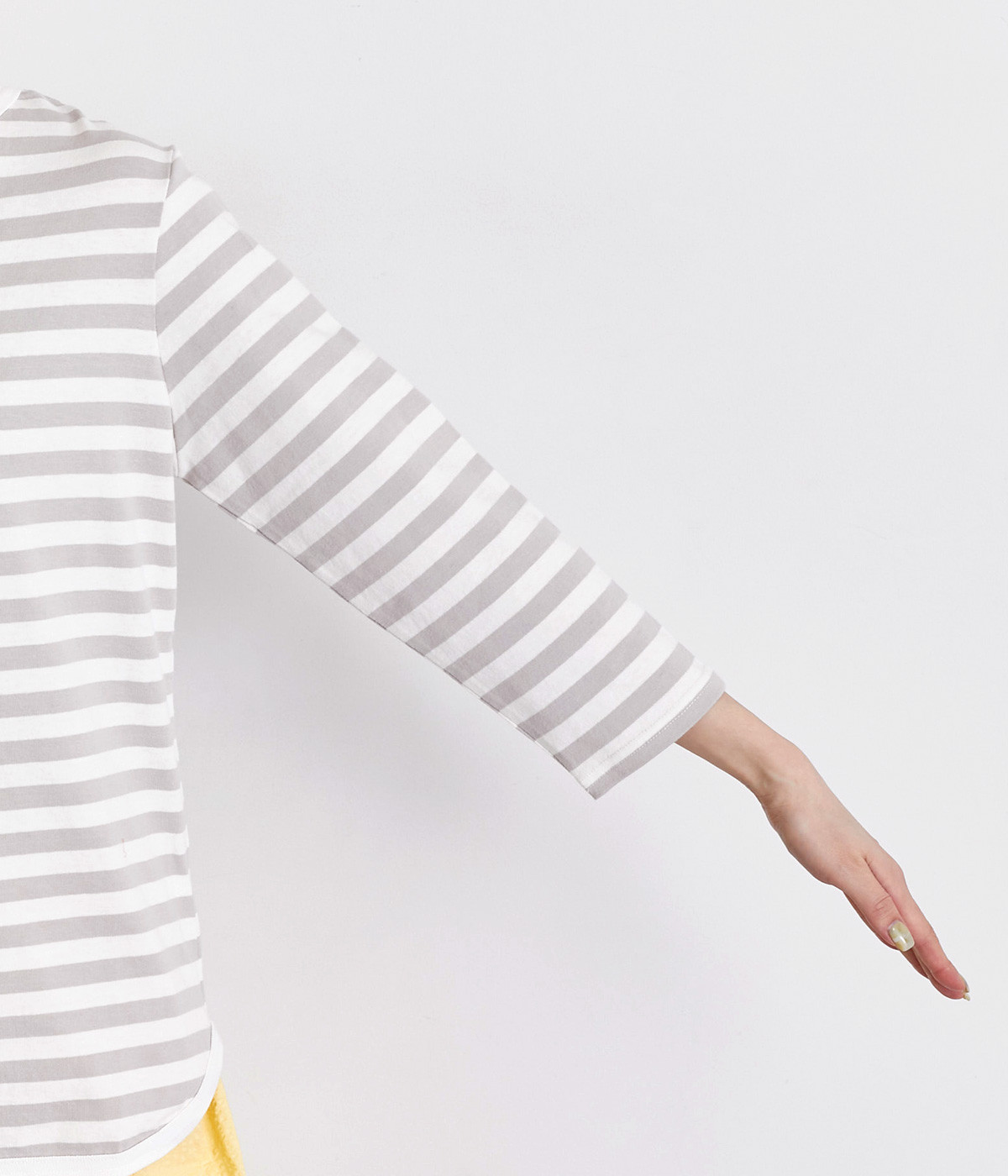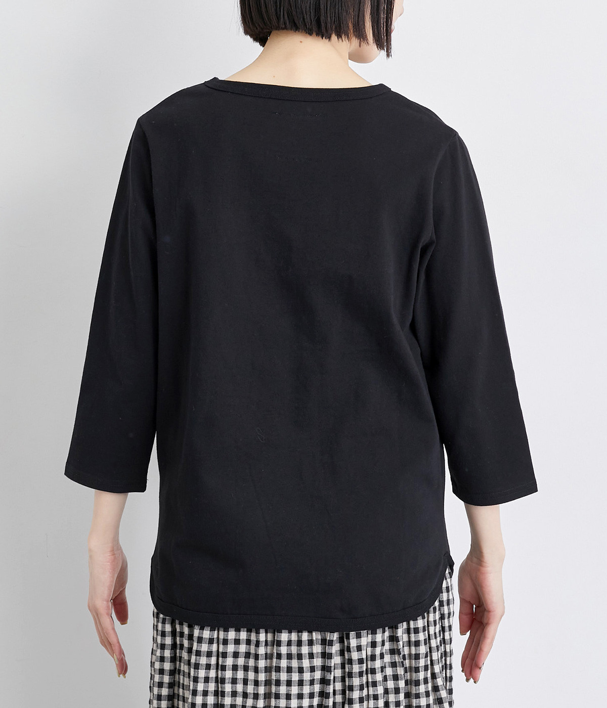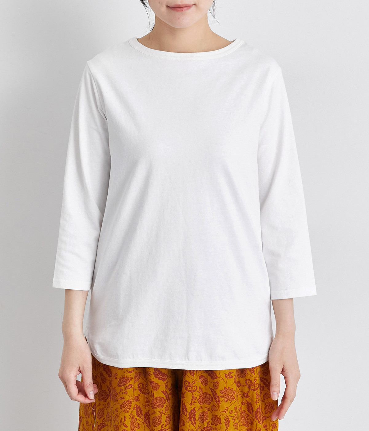 首元と裾に効かせた白や、七分袖が抜け感を演出します。締め付け感の少ない、ほどよい開き具合の首元もポイント。バランスよく見せつつリラックス感のある着心地です。シンプルながらさりげなく細部にこだわった一枚です。