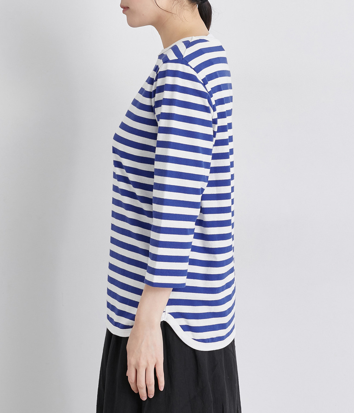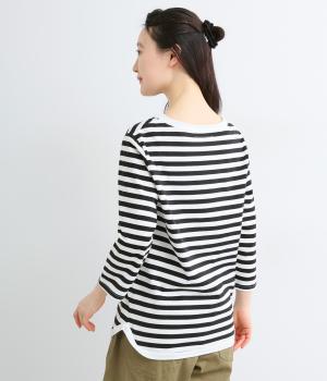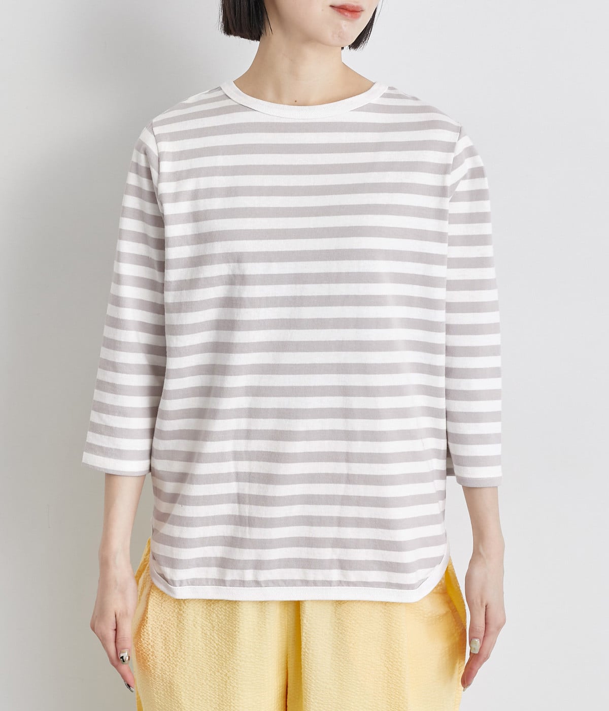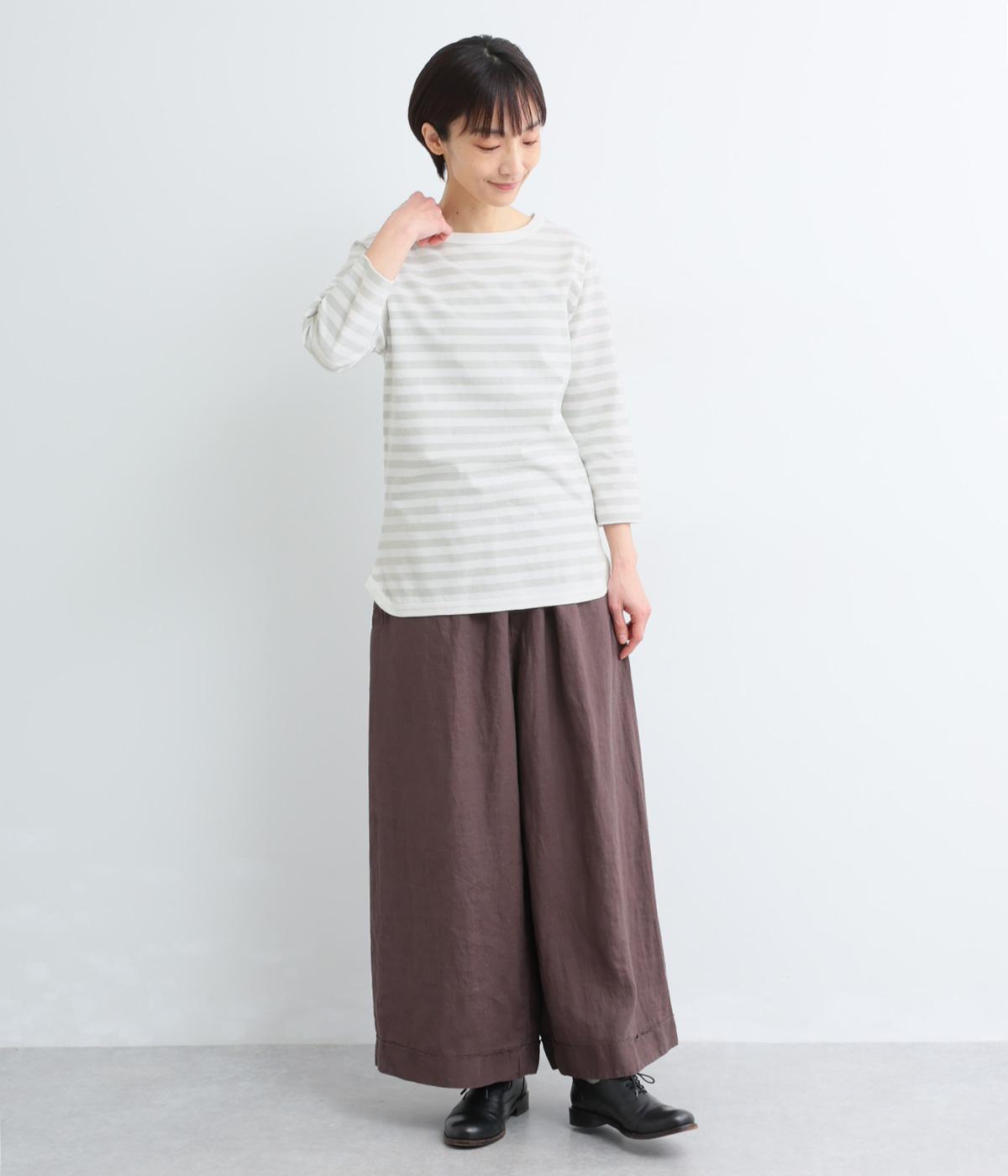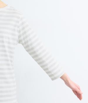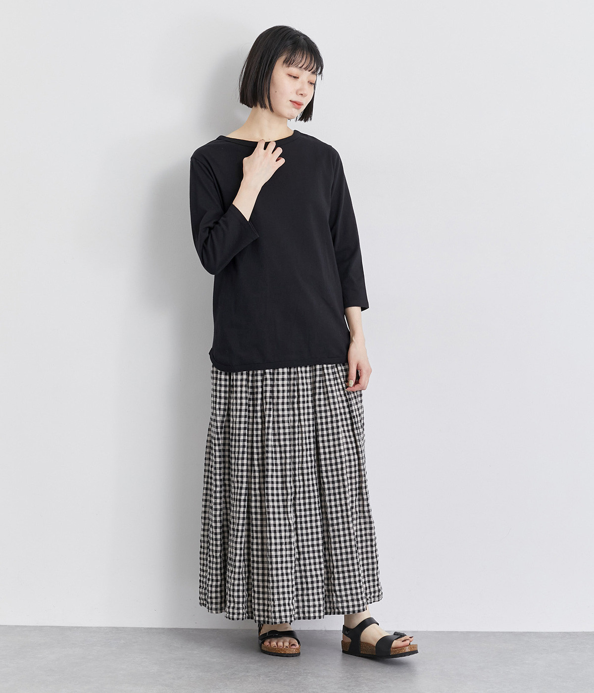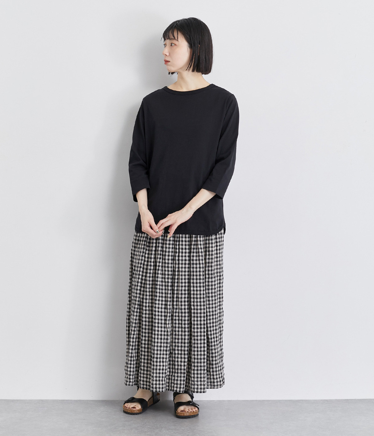 首元と裾に効かせた白や、七分袖が抜け感を演出します。締め付け感の少ない、ほどよい開き具合の首元もポイント。バランスよく見せつつリラックス感のある着心地です。シンプルながらさりげなく細部にこだわった一枚です。