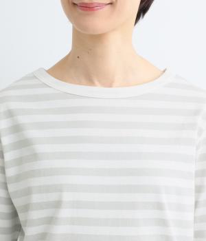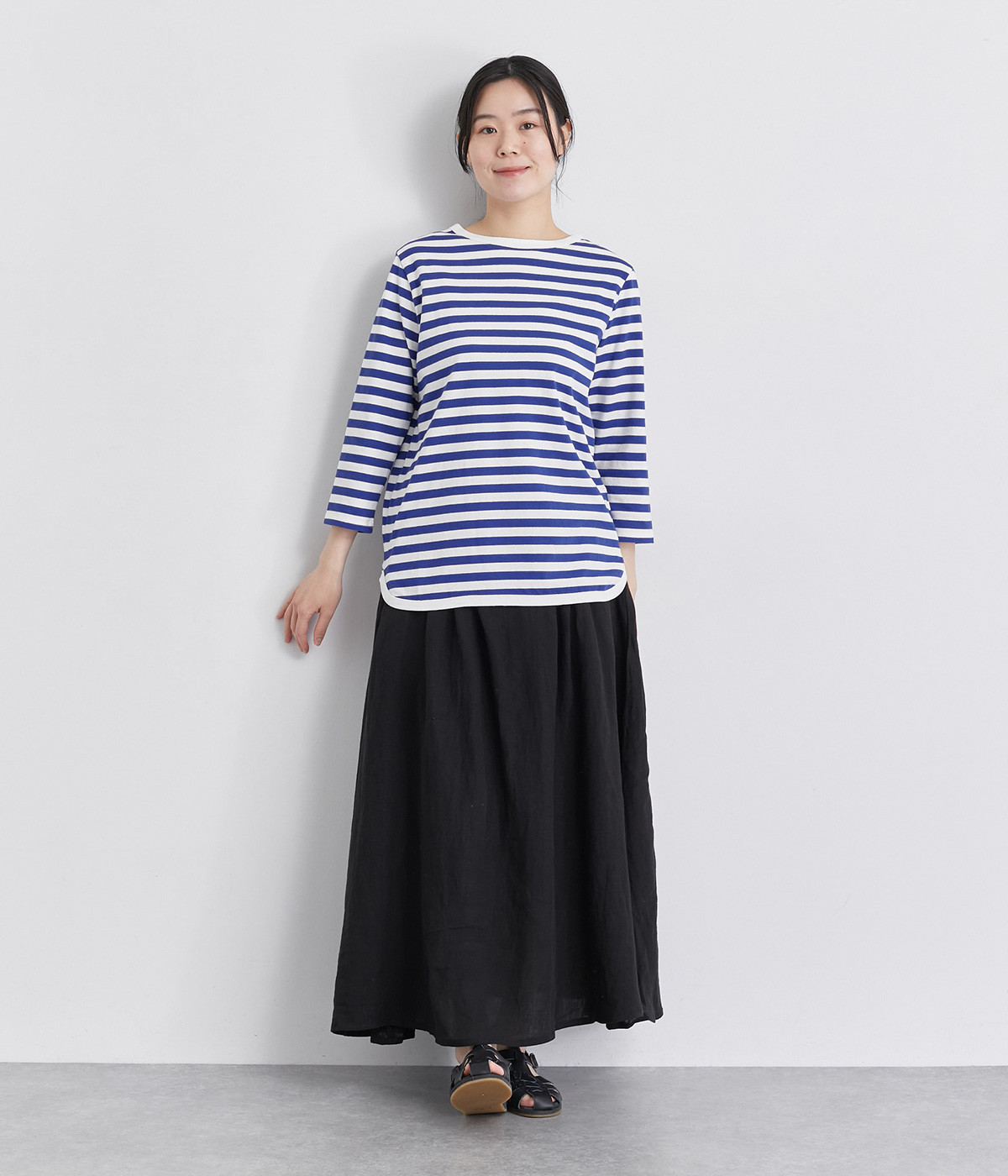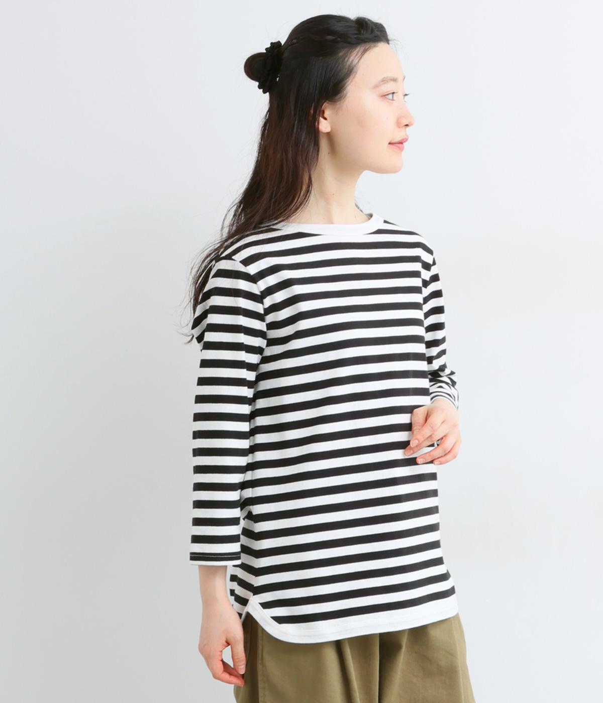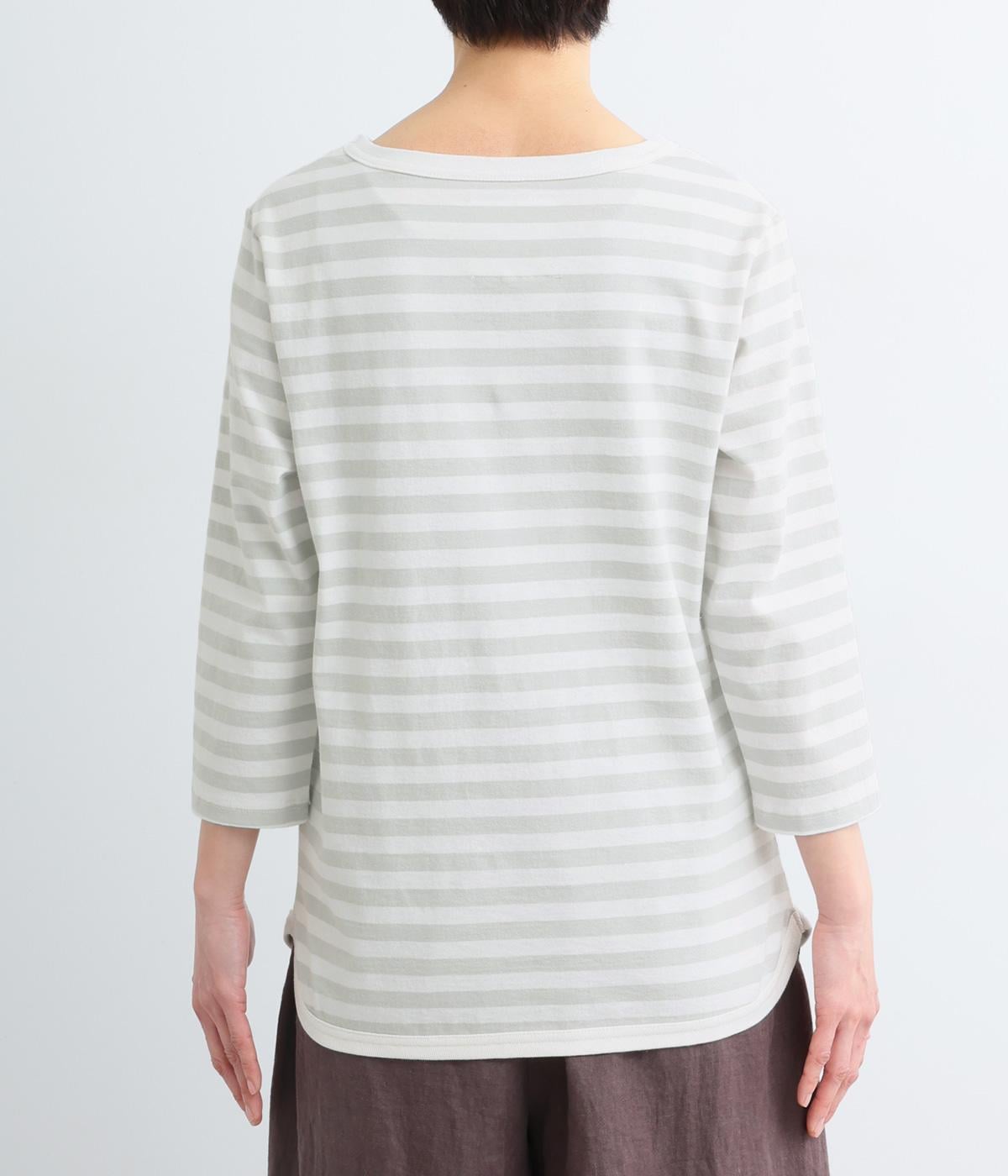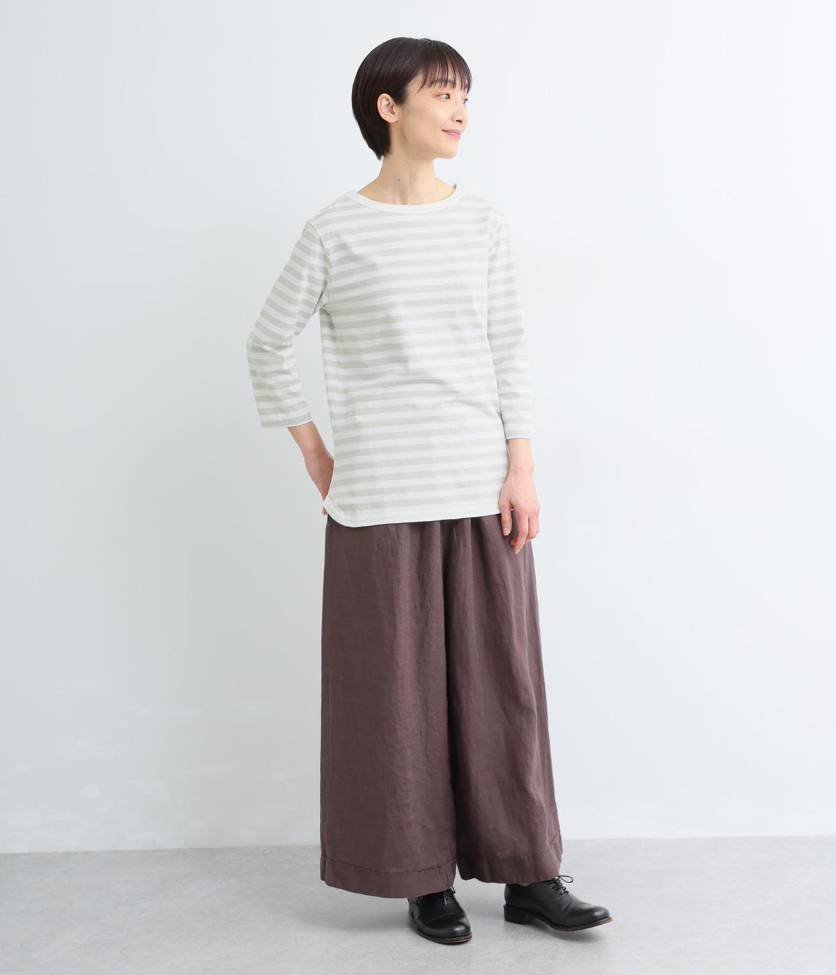 首元と裾に効かせた白や、七分袖が抜け感を演出します。締め付け感の少ない、ほどよい開き具合の首元もポイント。バランスよく見せつつリラックス感のある着心地です。シンプルながらさりげなく細部にこだわった一枚です。