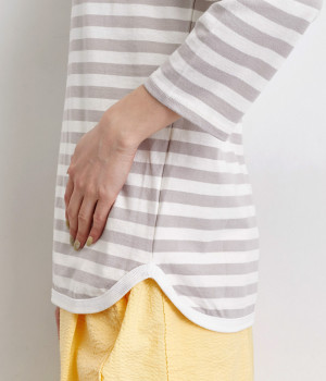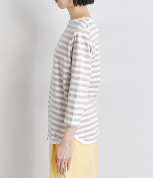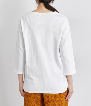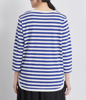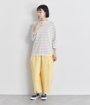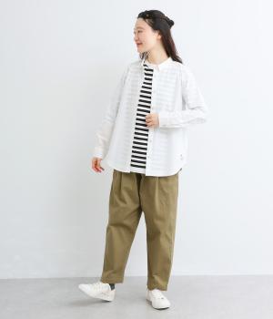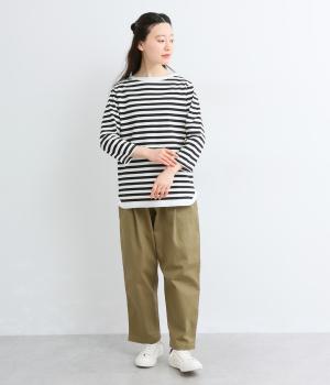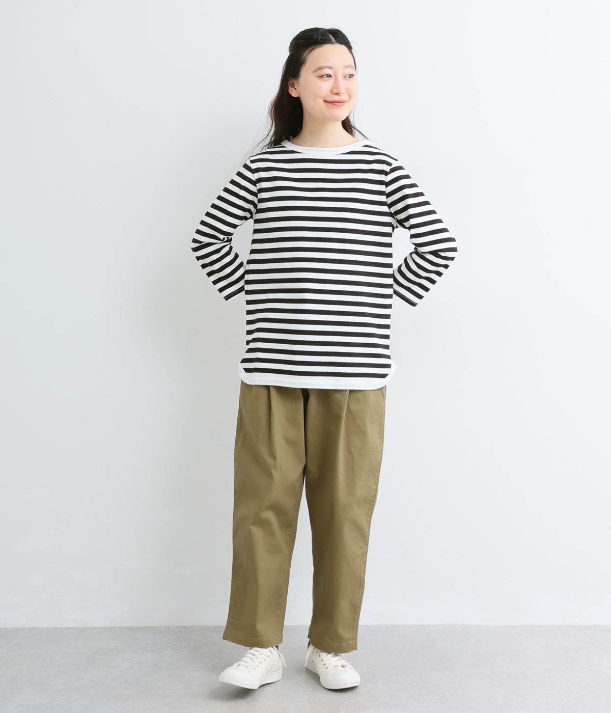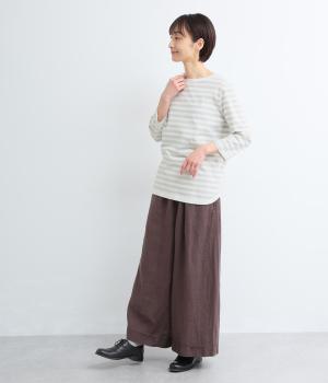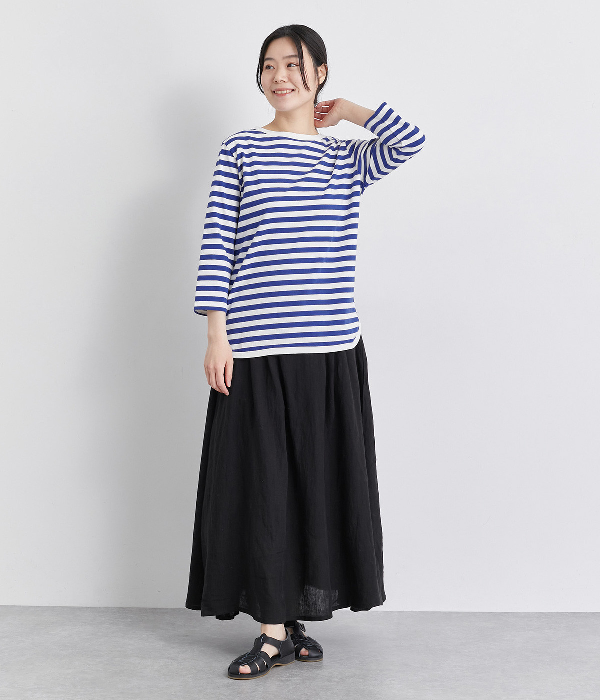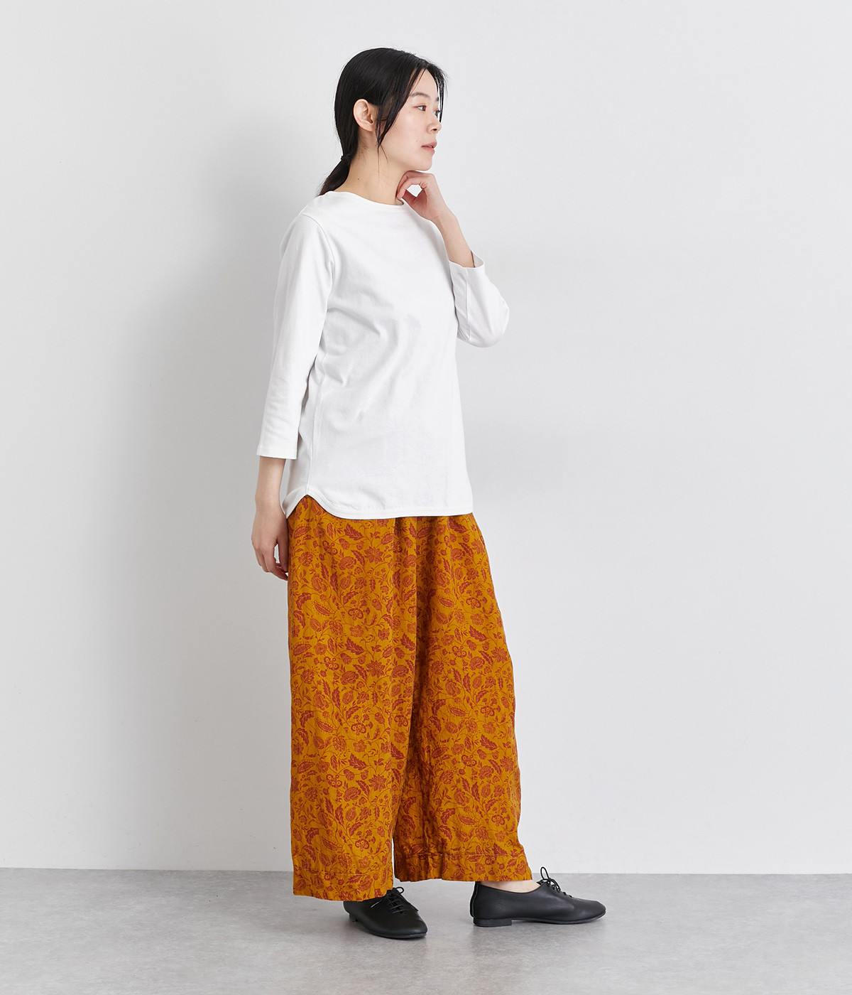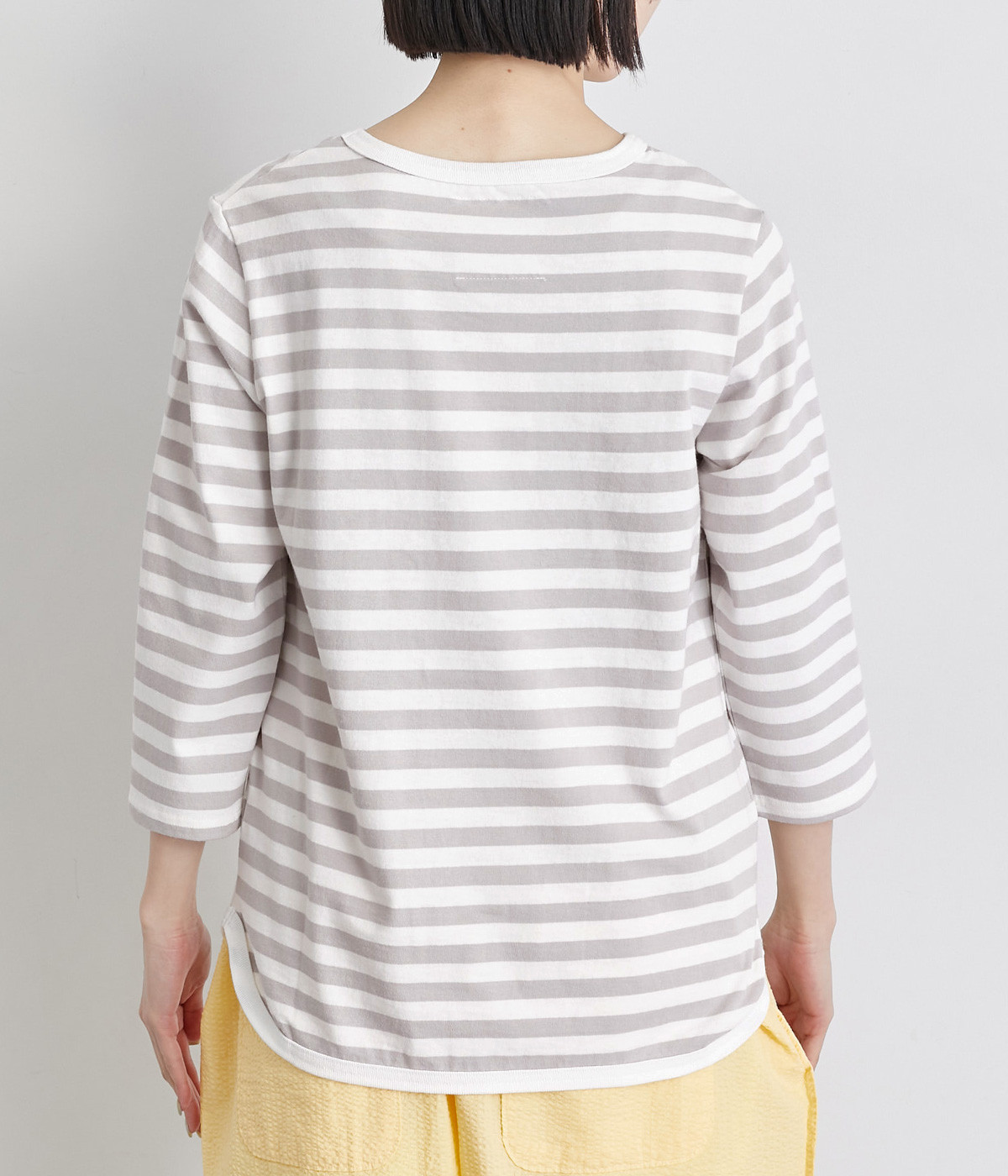 首元と裾に効かせた白や、七分袖が抜け感を演出します。締め付け感の少ない、ほどよい開き具合の首元もポイント。バランスよく見せつつリラックス感のある着心地です。シンプルながらさりげなく細部にこだわった一枚です。