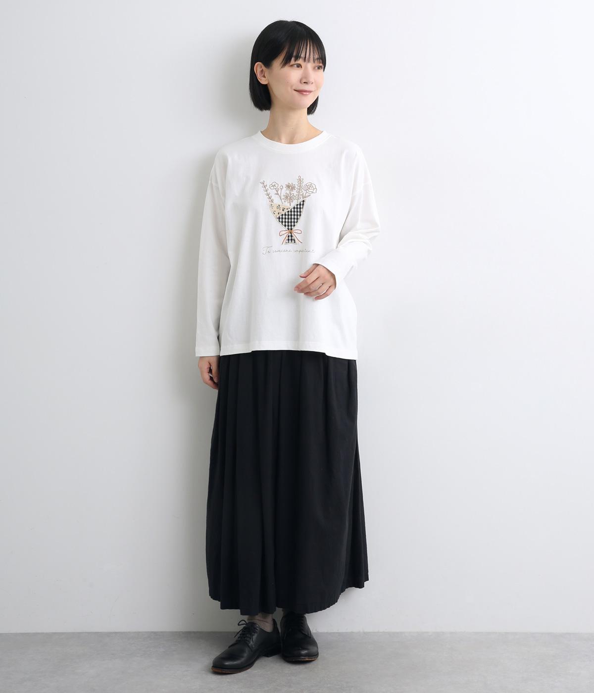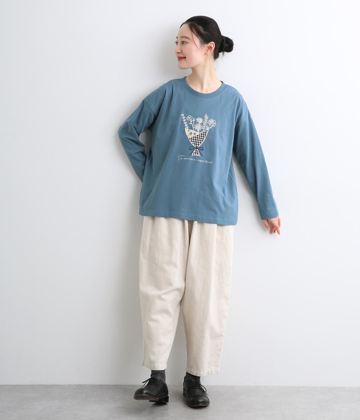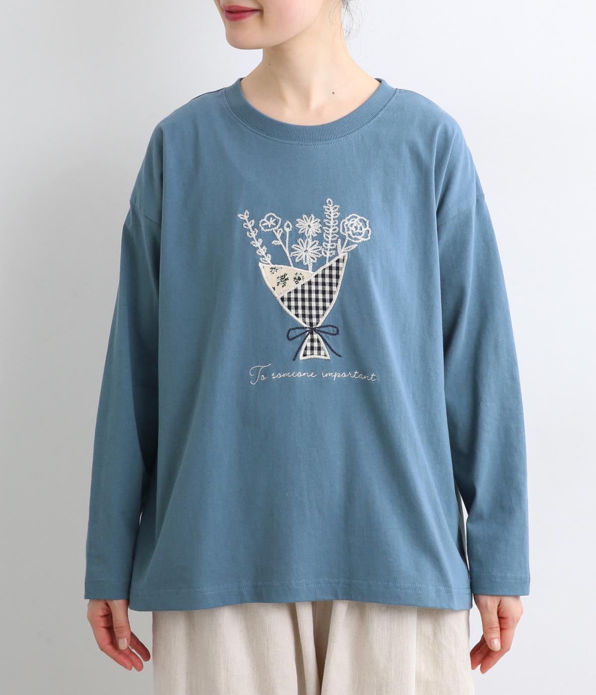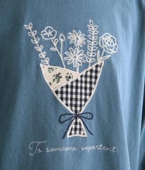 かわいらしく優しい雰囲気の花束刺しゅうが目をひくロングスリーブTシャツです。さまざまなボトムと好相性で、一枚で着るだけでコーディネートが完成します。扱いやすい素材でデイリーに活躍するアイテムです。