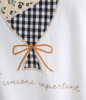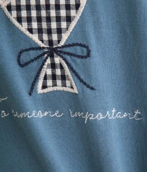 肌にやさしく、着るほどになじむコットン生地を使用しました。首元はリブで脱ぎ着しやすいのもポイント。胸元の花束とロゴは別布や刺しゅうで仕立てました。