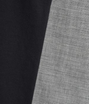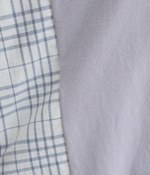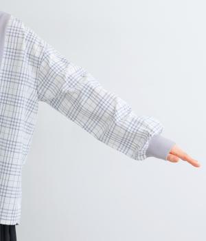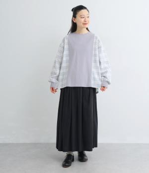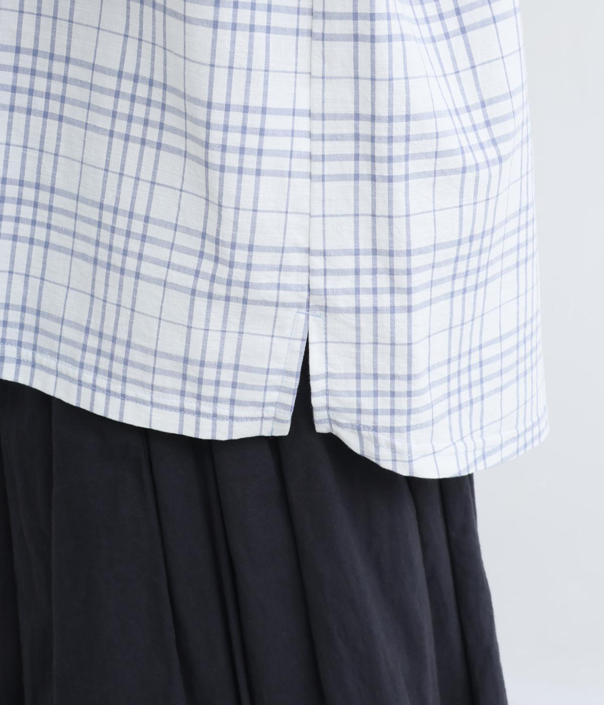 さらっとしたドライな質感が心地よいコットンリネンのチェック生地をベースに使用しています。前の中心や後ろヨークはやわらかな綿天竺に切り替えて着心地の良さもアップ。