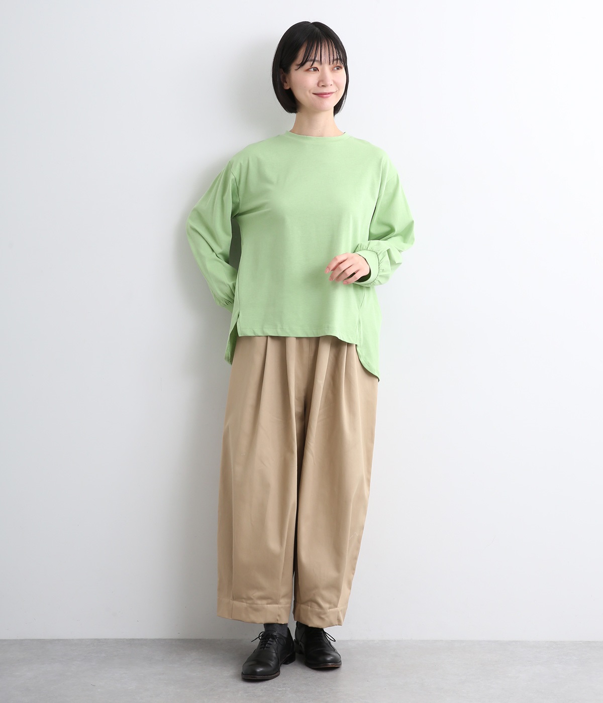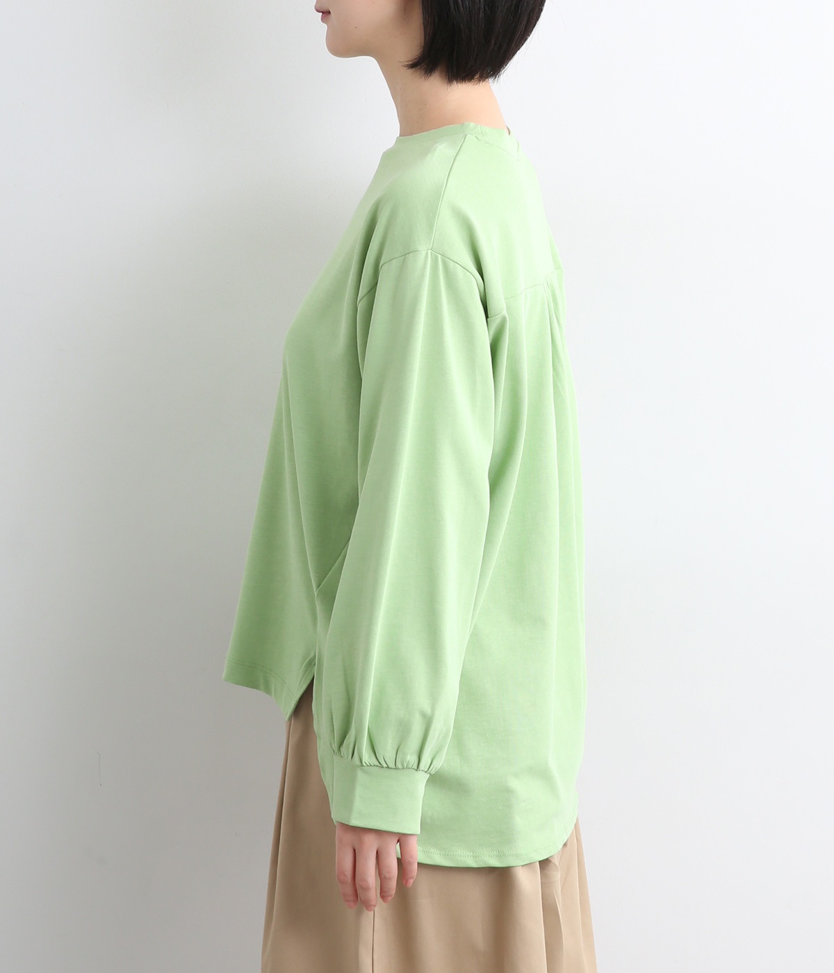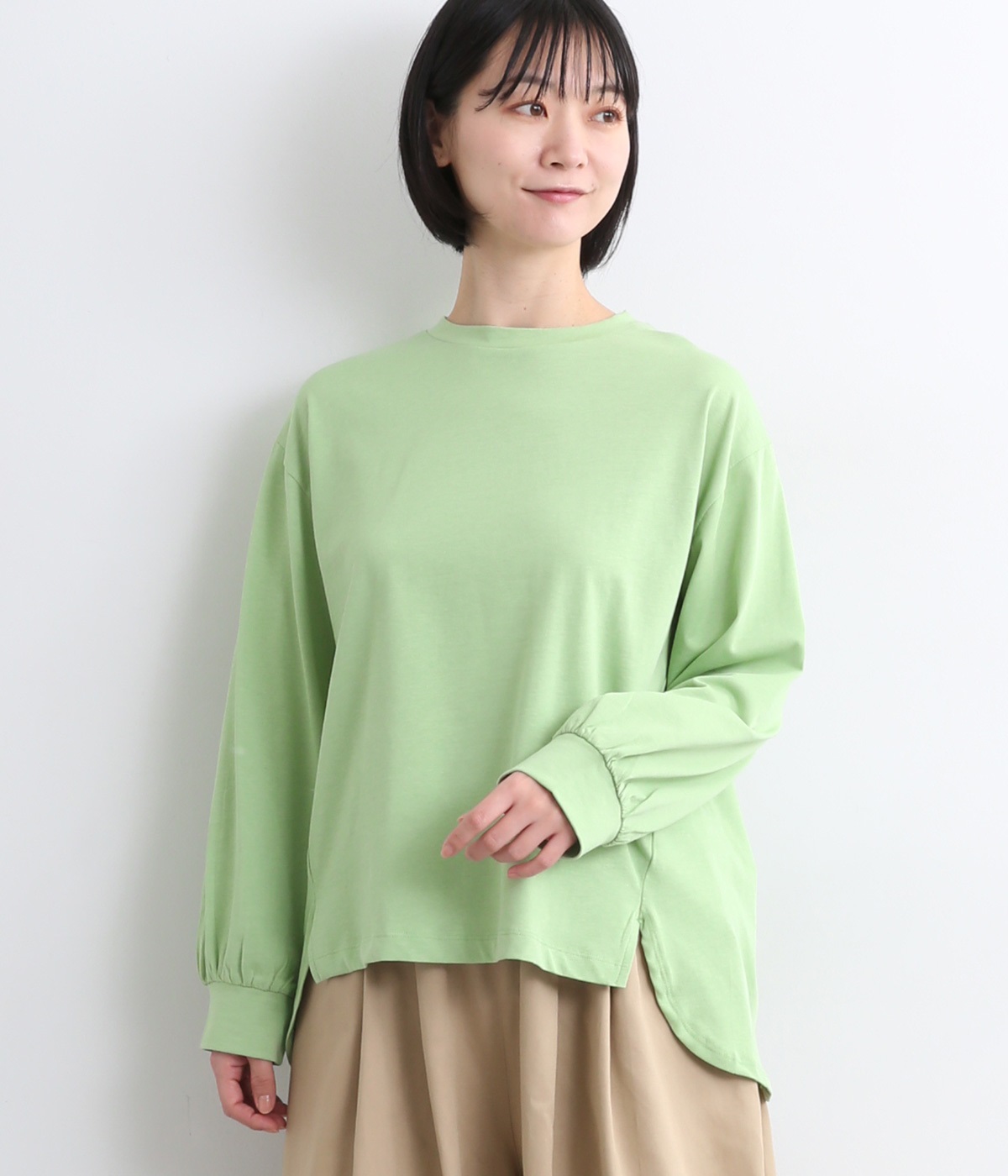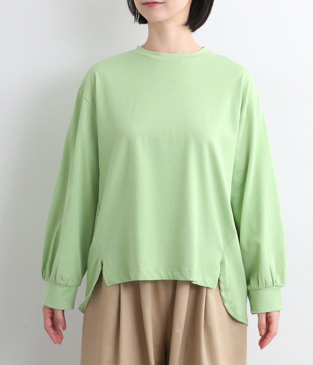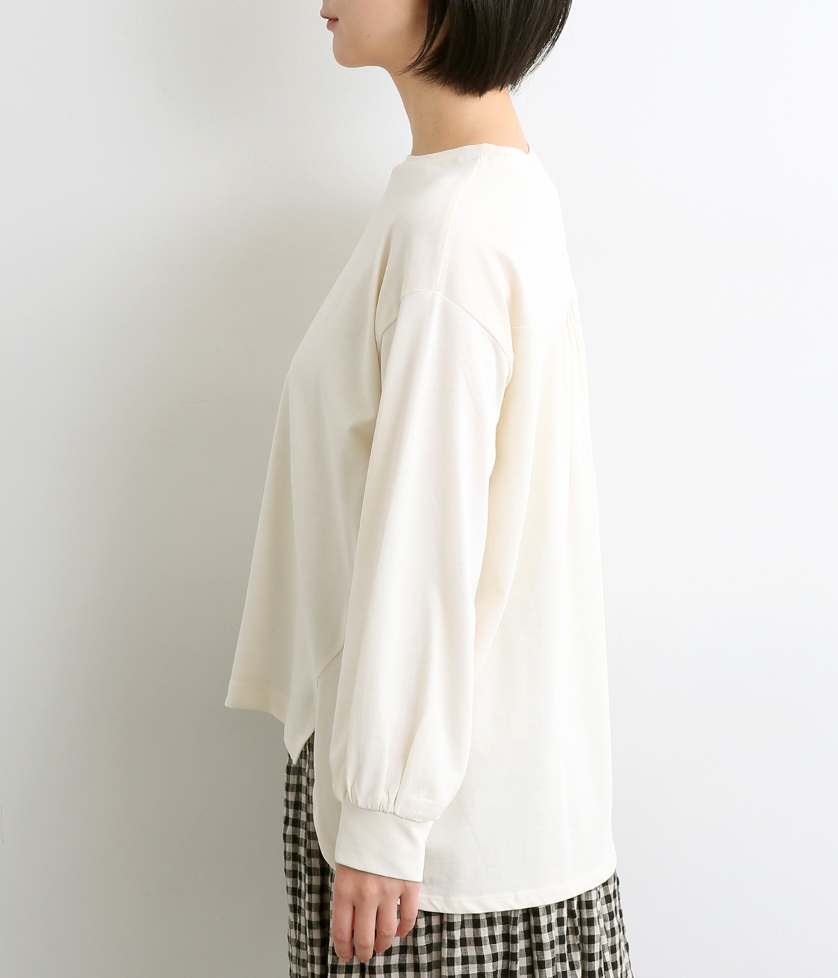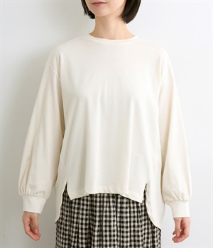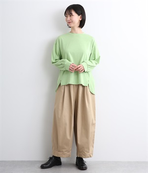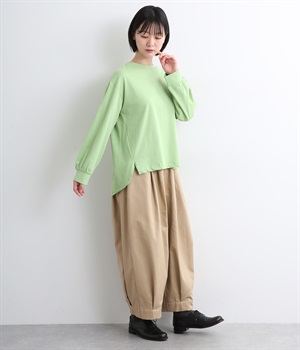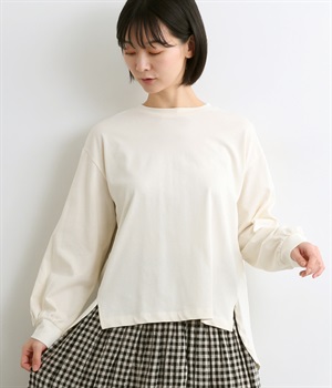 前は直線、後ろは曲線と、前後でデザインを変え、裾丈にも変化をつけました。ほどよくゆとりのあるシルエットで、さらりと着まわせるクルーネック仕立て。袖口はカフス切替えをいれて、手元をすっきりとさせています。