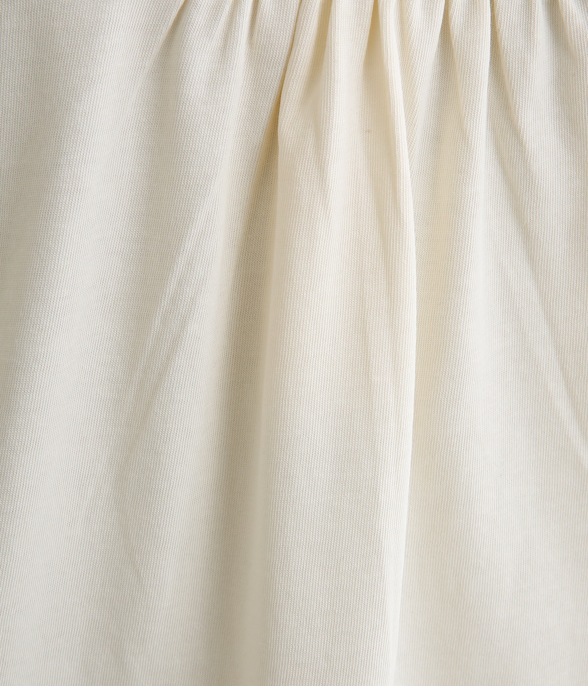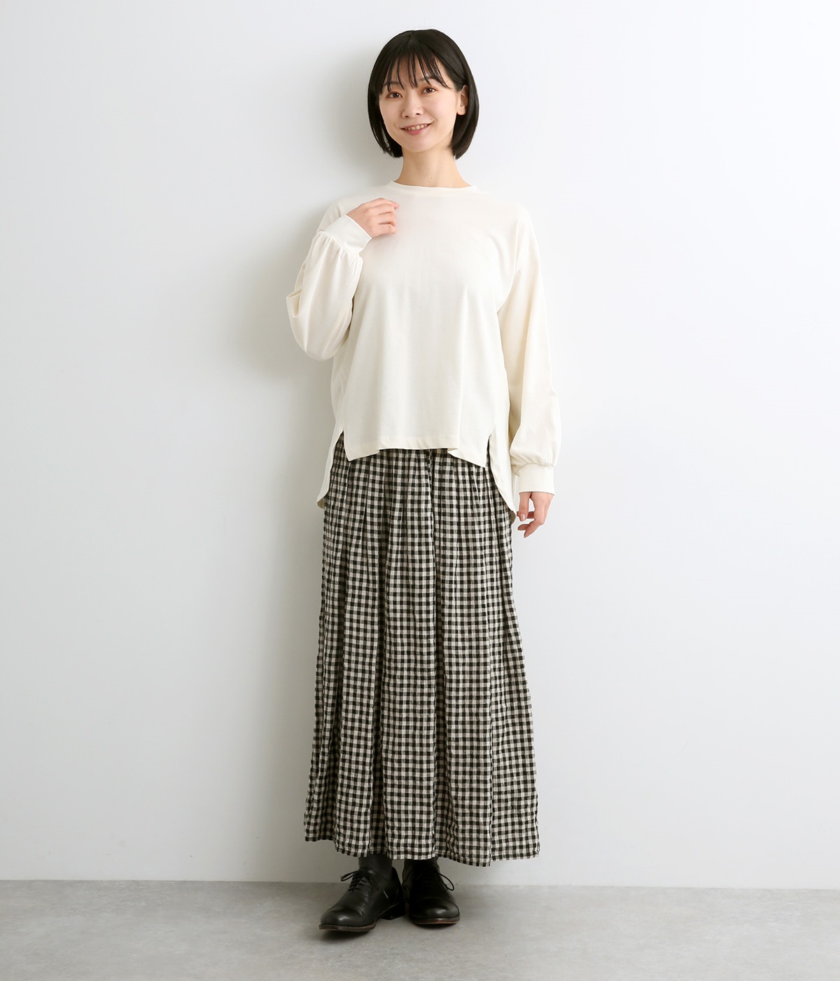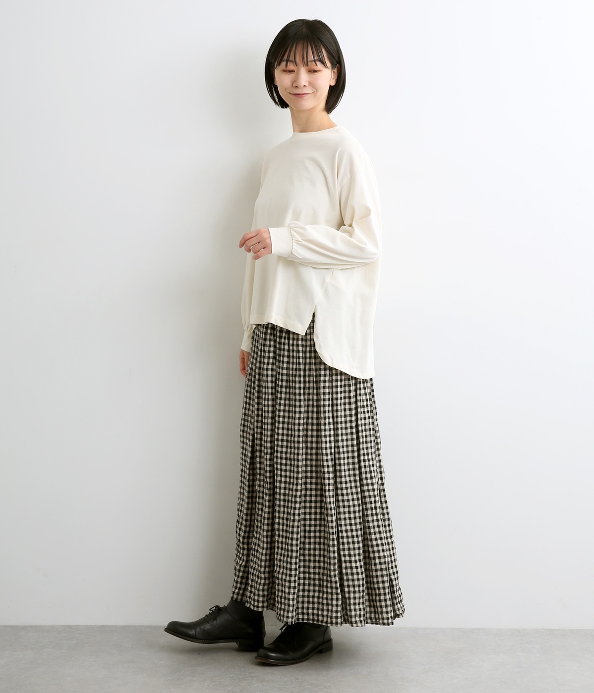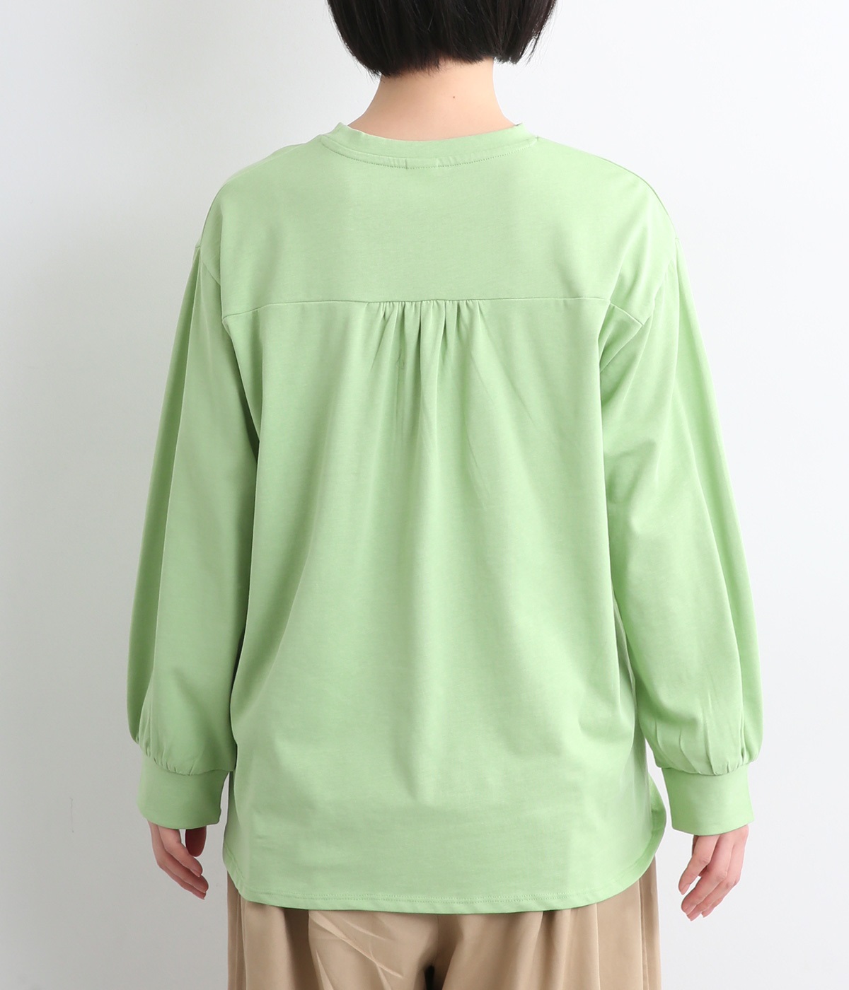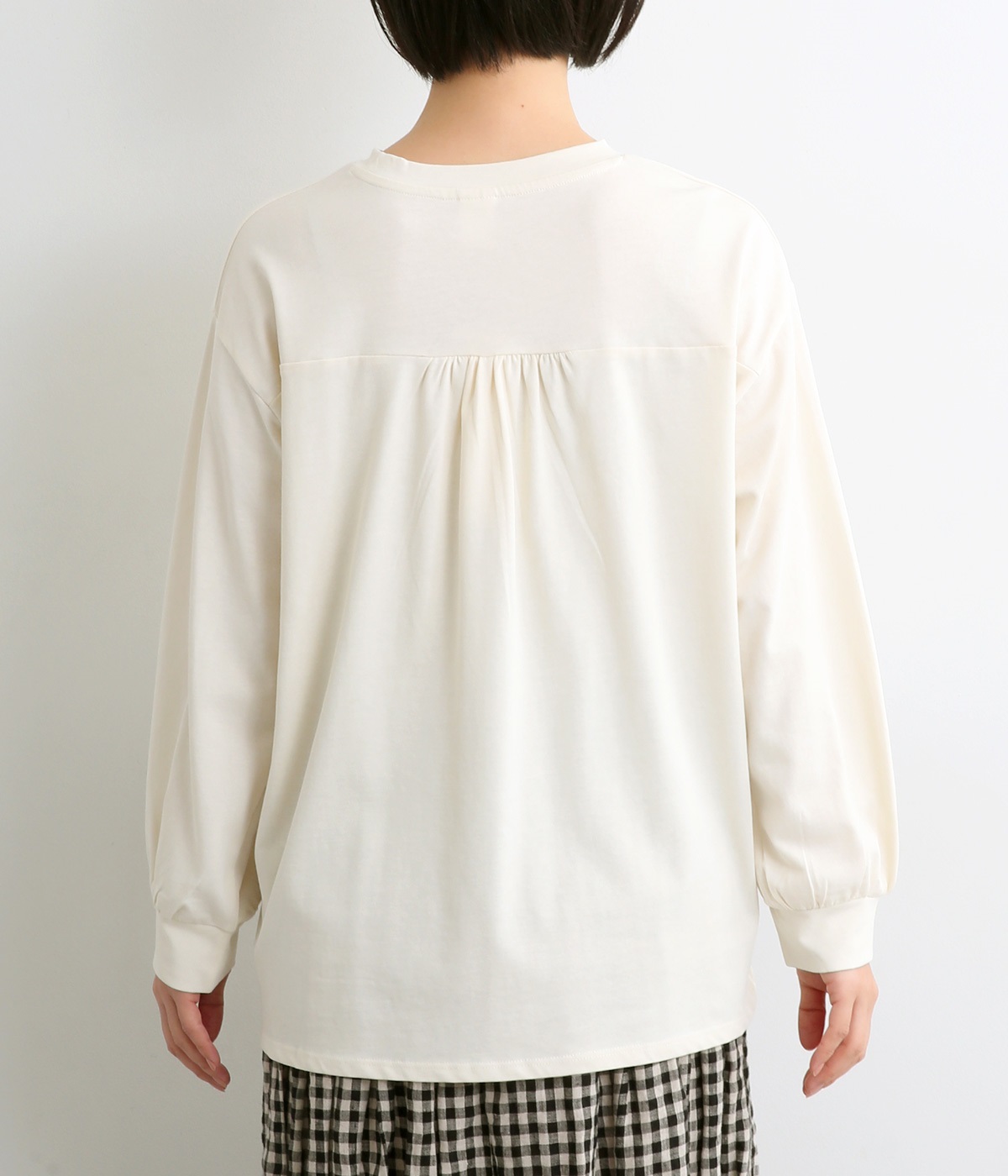 前は直線、後ろは曲線と、前後でデザインを変え、裾丈にも変化をつけました。ほどよくゆとりのあるシルエットで、さらりと着まわせるクルーネック仕立て。袖口はカフス切替えをいれて、手元をすっきりとさせています。