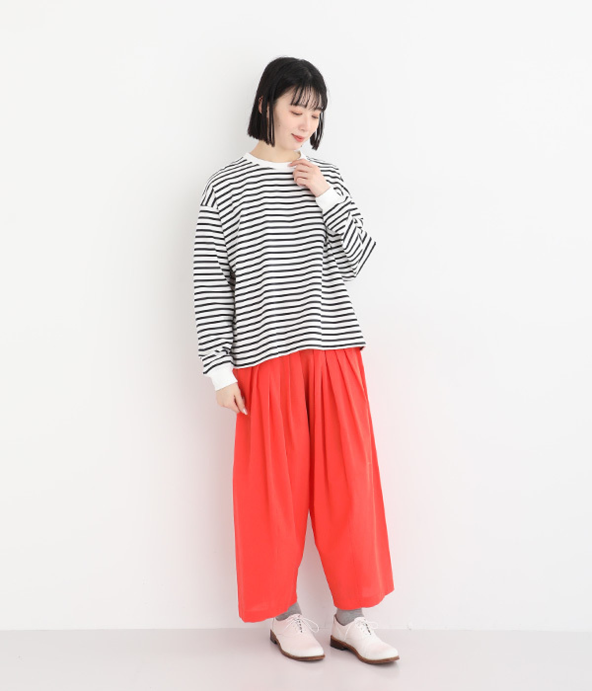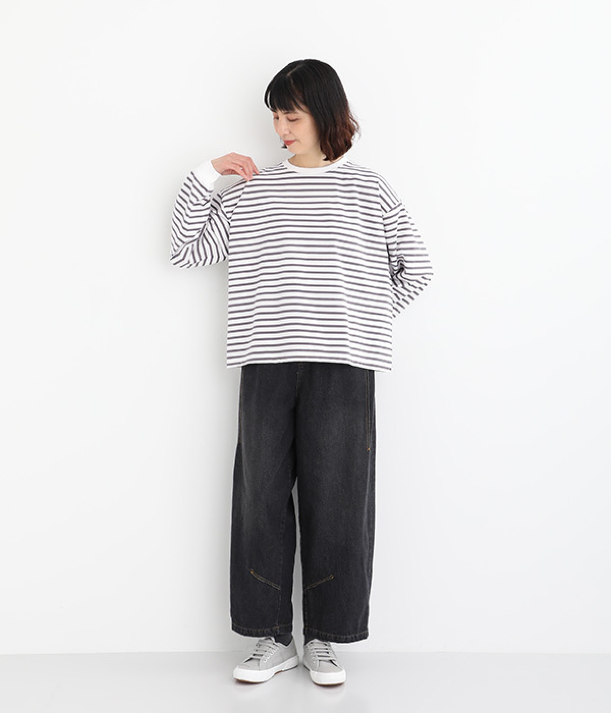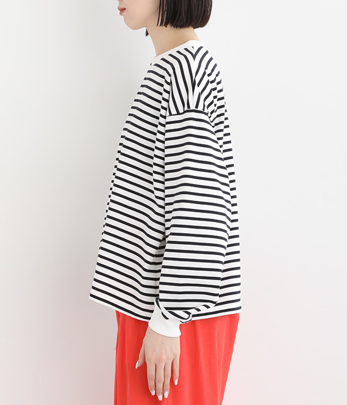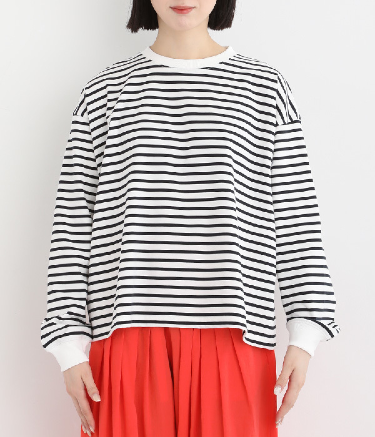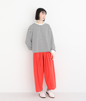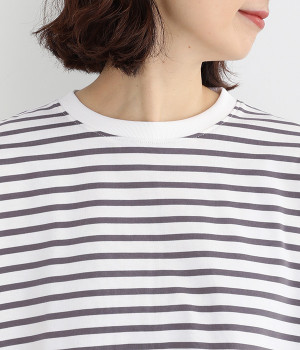 リラックス感のある、ワイドシルエットのボーダープルオーバーです。襟ぐりと袖口を配色リブで切り替え、リハリよく仕上げました。ほどよくカジュアルな雰囲気で、毎日のコーディネートに頼れる便利な一枚です。