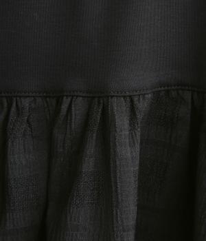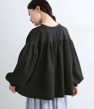立体感のあるドビー織りの凹凸と、やわらかな光沢が重なり合い、表情ゆたな生地に仕上がりました。さらりとした肌ざわりで、しなやかに落ちる風合いも魅力。フライス生地との切り替えにより、異素材のコントラストをたのしめます。