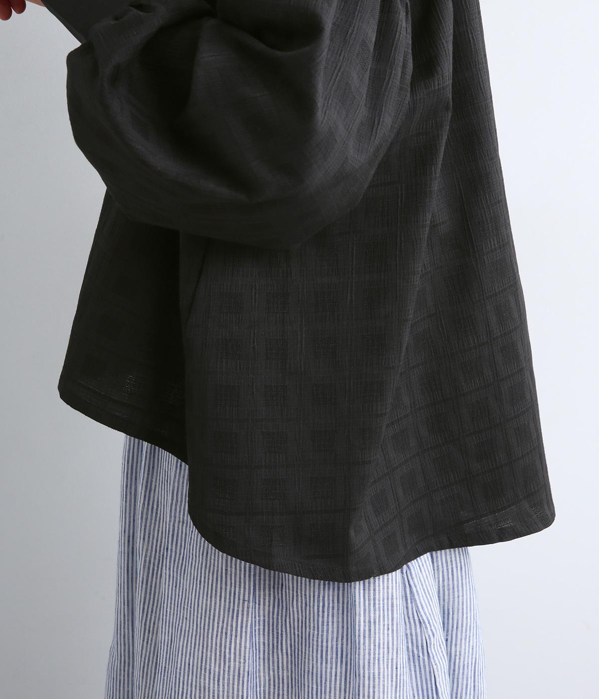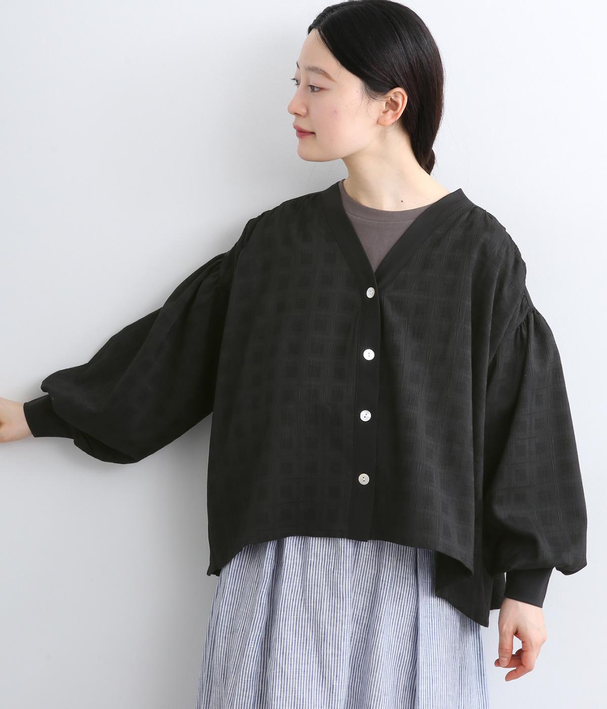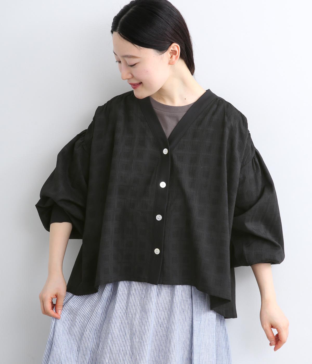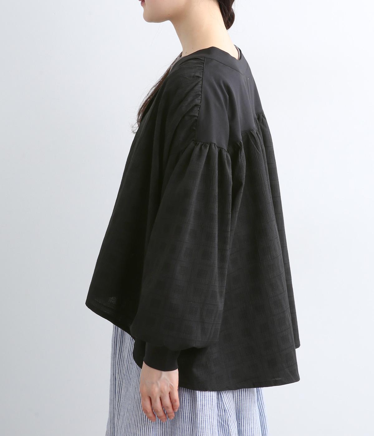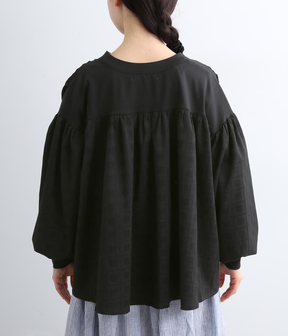 立体的なチェック柄が浮かび上がる身頃に、無地の切り替えでメリハリを添えました。ギャザーをたっぷりと施した背面と、ふんわりとしたボリュームスリーブが、体のラインをカバーしながらやわらかな印象に。すっきりとしたVネックと、前後差のある裾で抜け感をつくり、甘すぎないバランスに仕上げています。