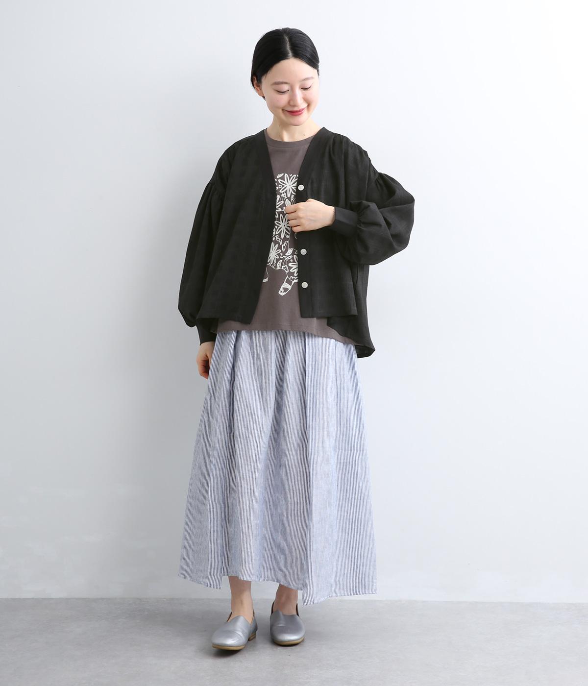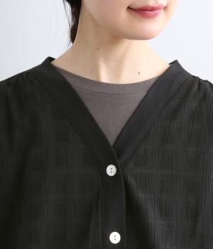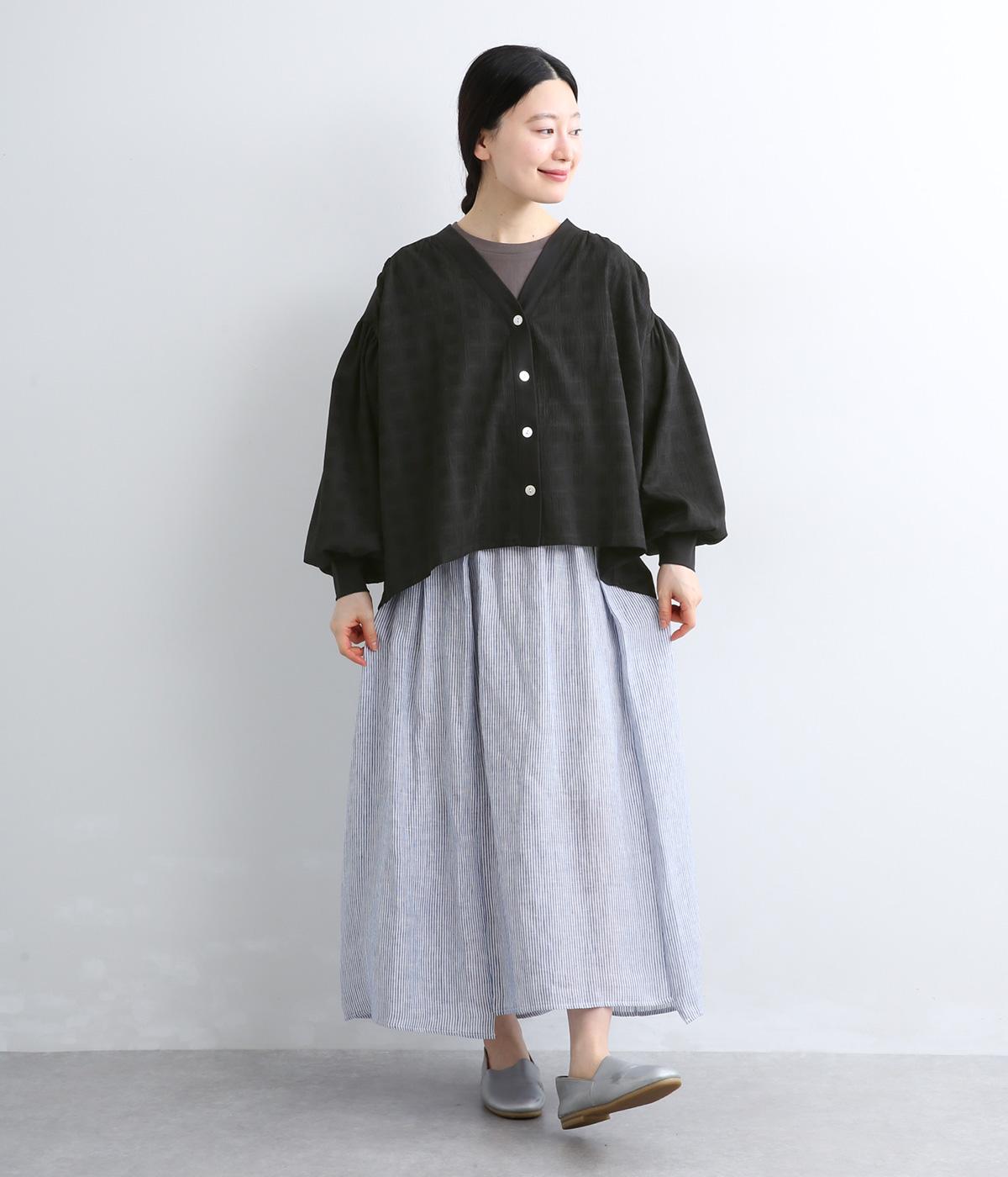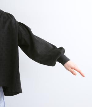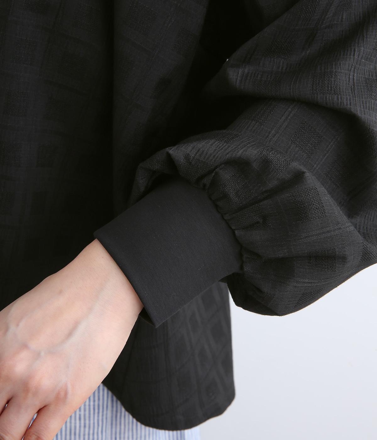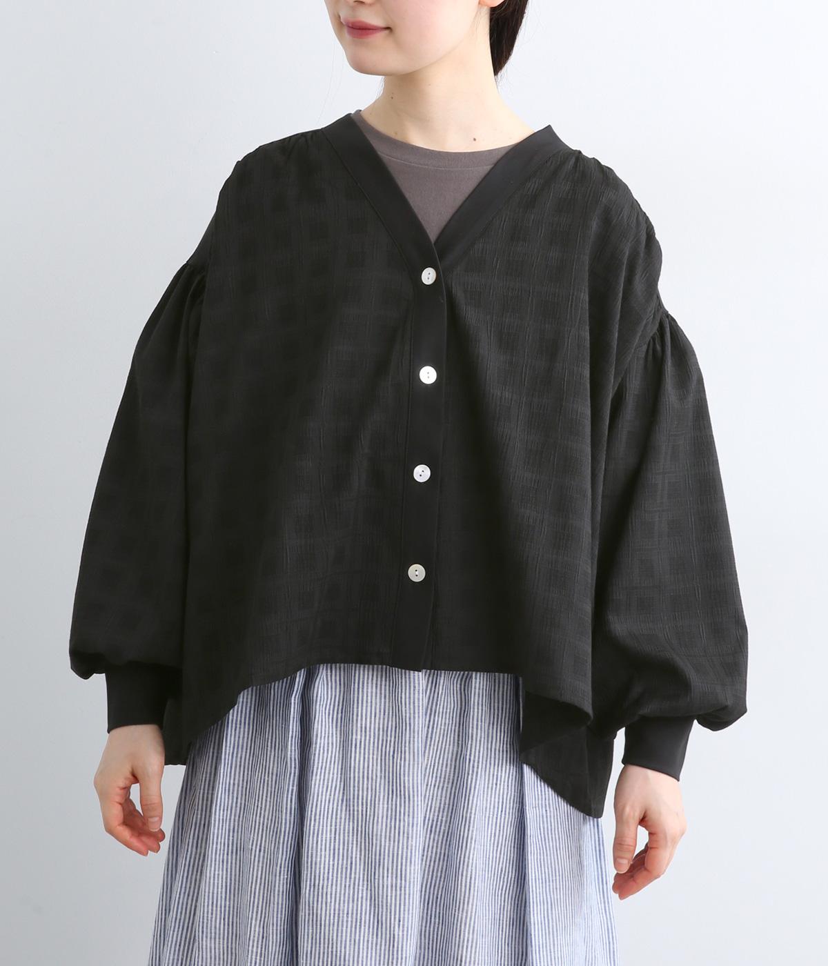 立体的なチェック柄が浮かび上がる身頃に、無地の切り替えでメリハリを添えました。ギャザーをたっぷりと施した背面と、ふんわりとしたボリュームスリーブが、体のラインをカバーしながらやわらかな印象に。すっきりとしたVネックと、前後差のある裾で抜け感をつくり、甘すぎないバランスに仕上げています。