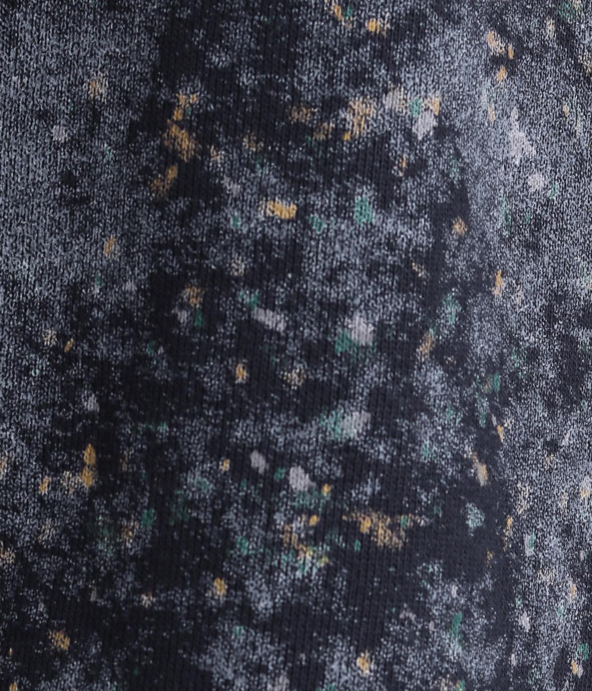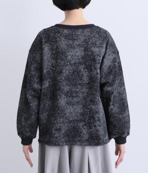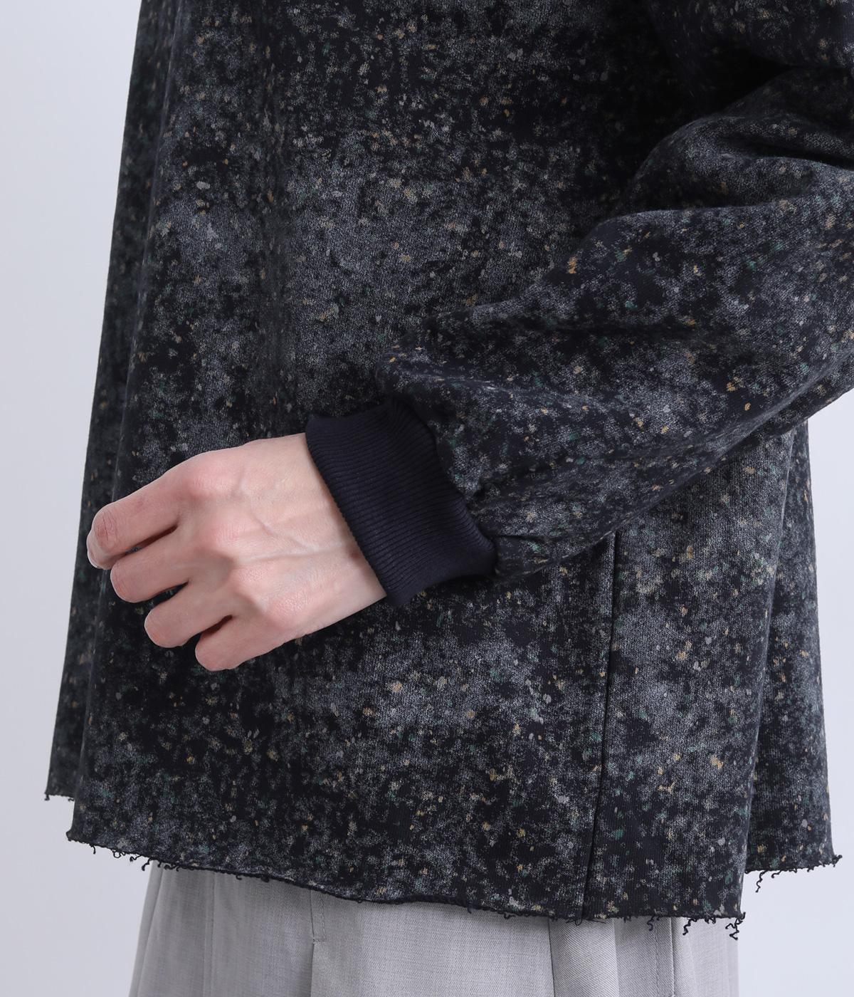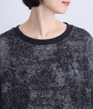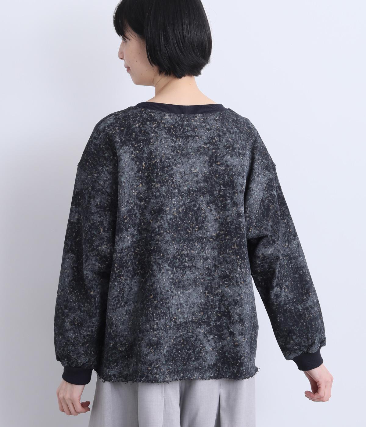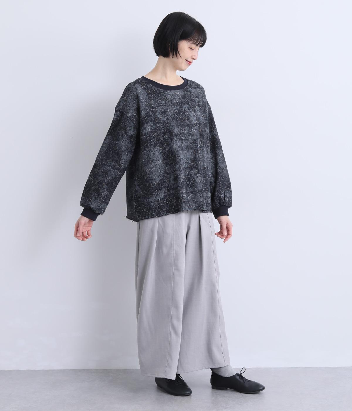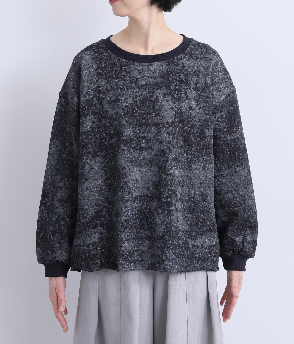 気負っていないのにさまになる、抽象的な柄のようなピグメント風スウェットが大人のカジュアルスタイルを格上げ。襟ぐりや袖口はリブで引き締めつつ、裾はカットオフで抜け感を出しているのもポイントです。