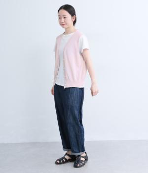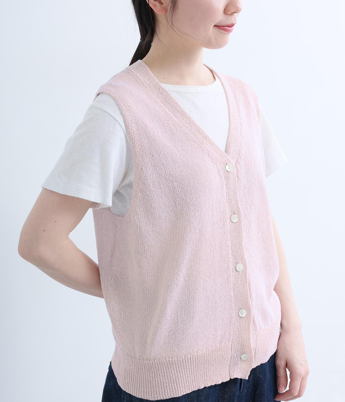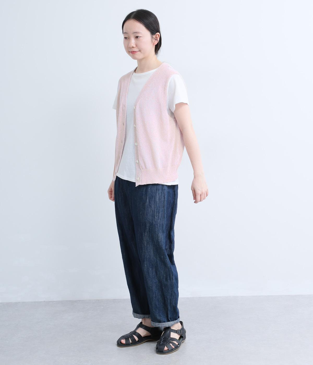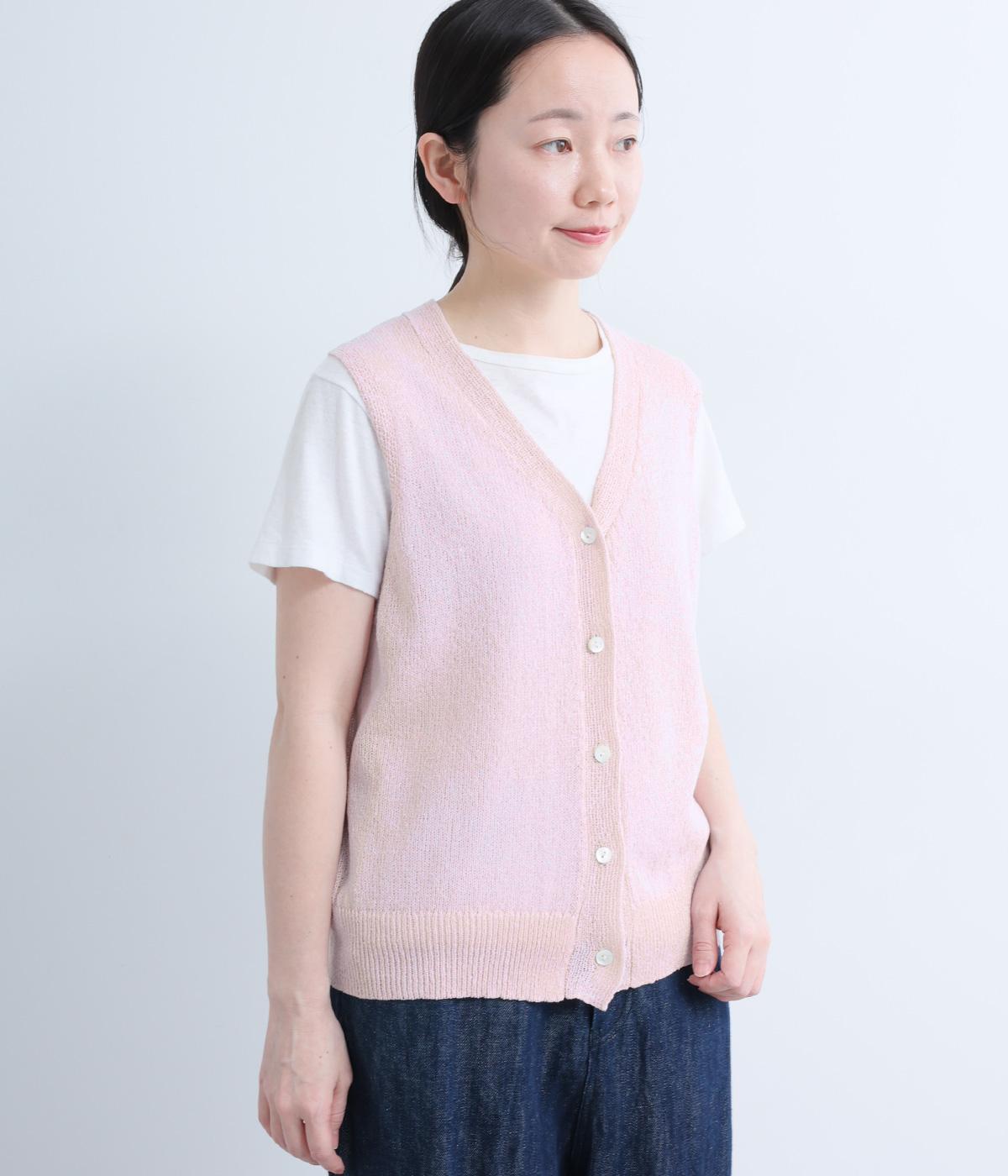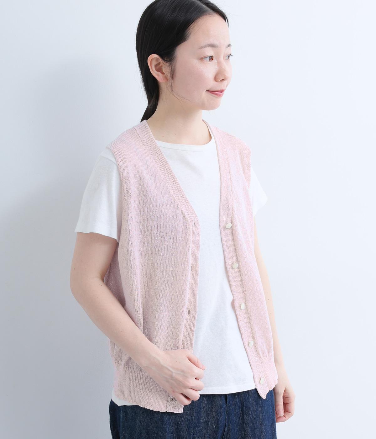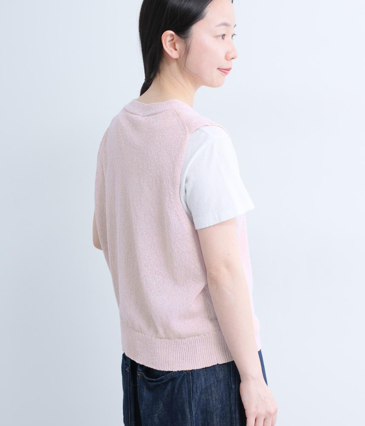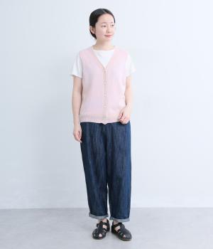 すっきりしたVネックと太めのウエストリブが洗練された印象のニットベスト。肌寒い季節はシャツなどとレイヤードして、汗ばむ季節はノースリーブトップス感覚でも着まわせます。和紙素材ならではの表情が魅力で、シンプルながらも雰囲気のいい着こなしに。