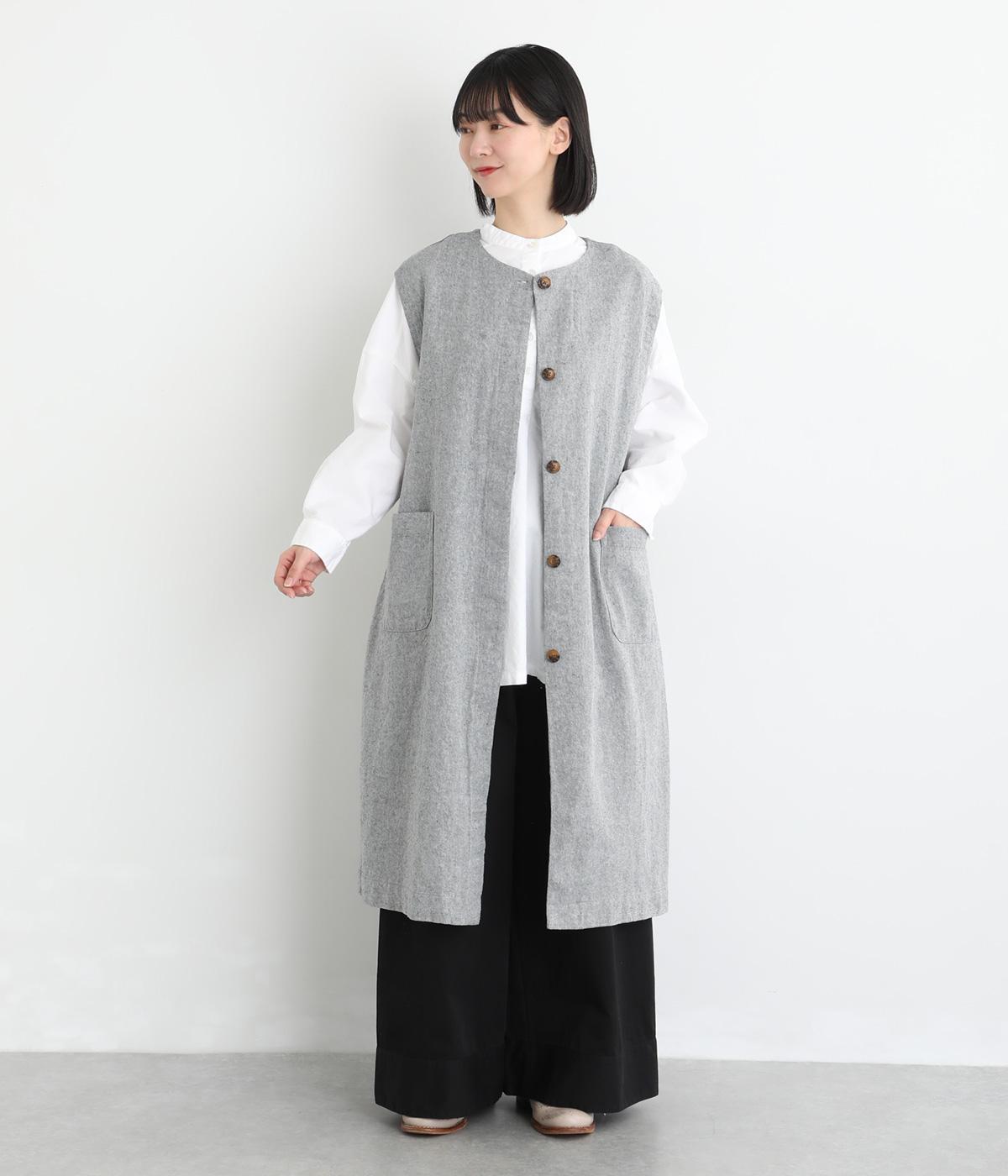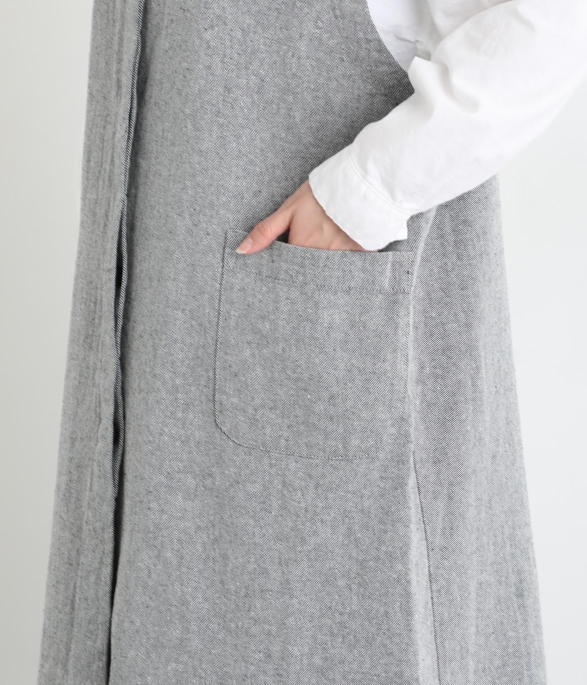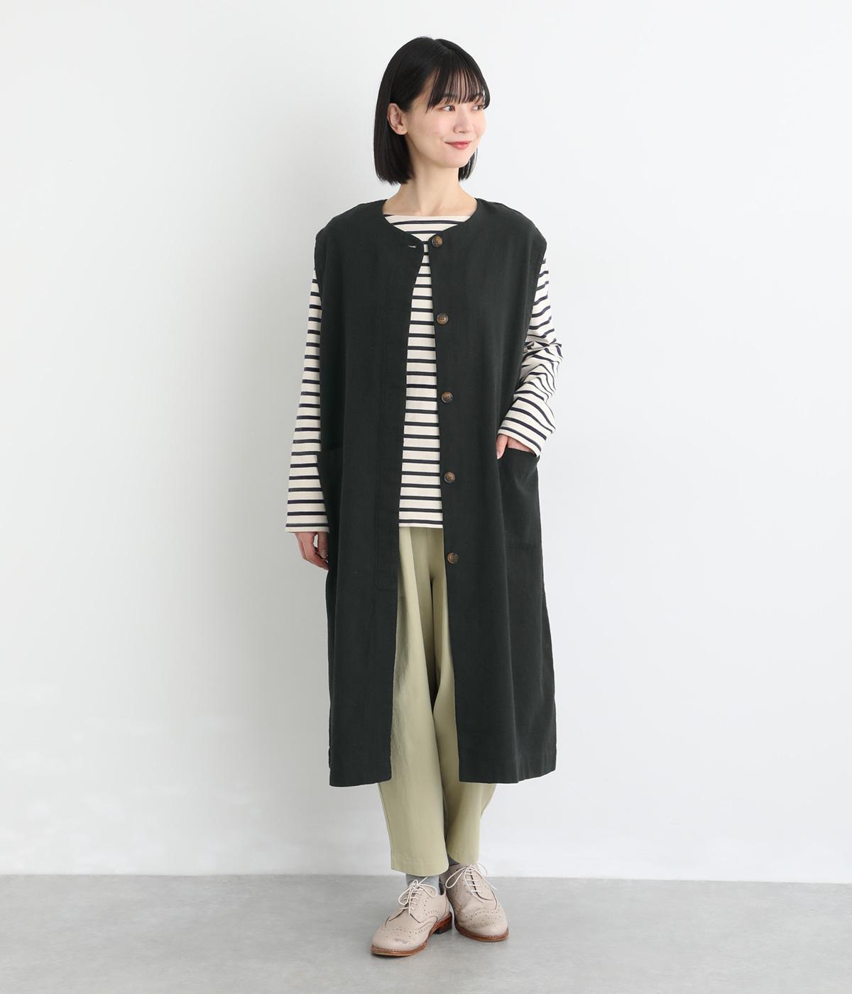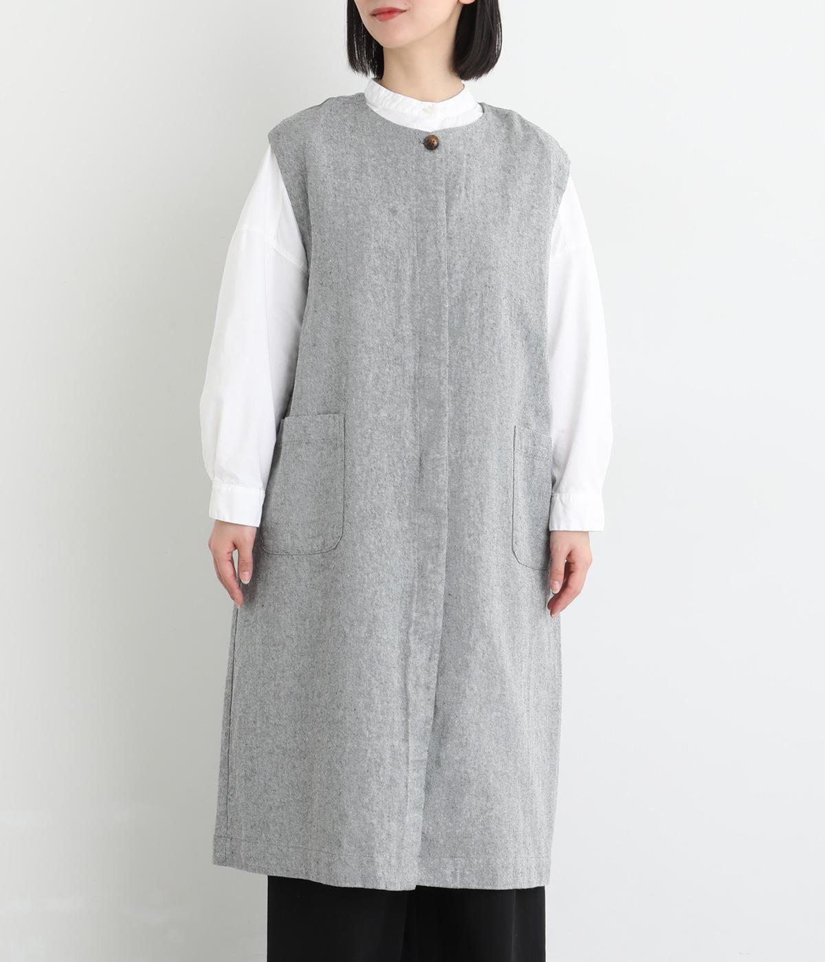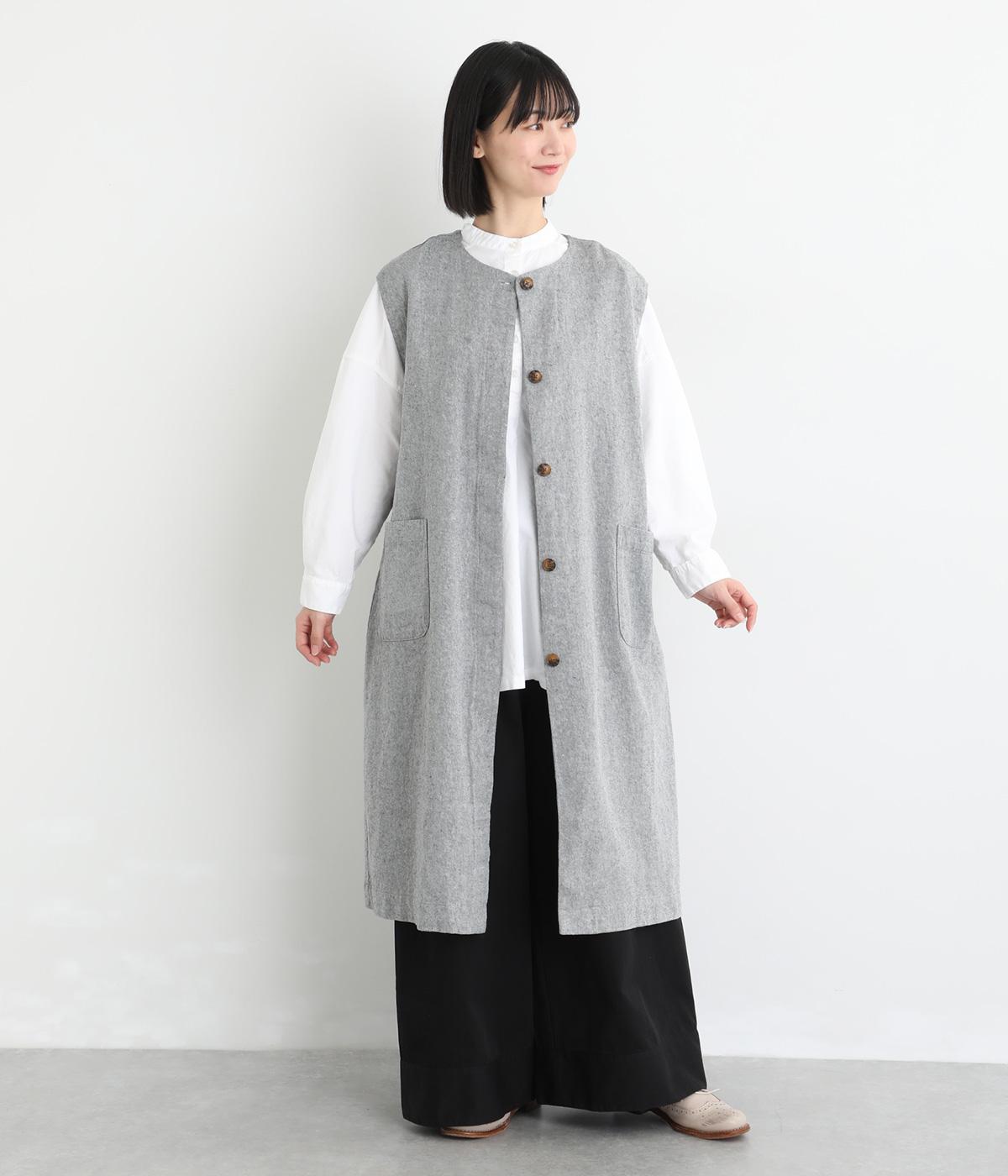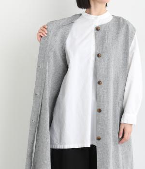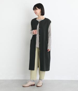 前をあけてもとじてもサマになるロングジレです。フロントのひとつボタンがアクセントに。留めればすっきりとした縦ラインが強調され、あけて羽織れば、ラフで抜け感のあるスタイリングがたのしめます。ロング丈ながらコーディネートが重たくなりにくく、自然な奥行きを与えてくれるアイテムです。