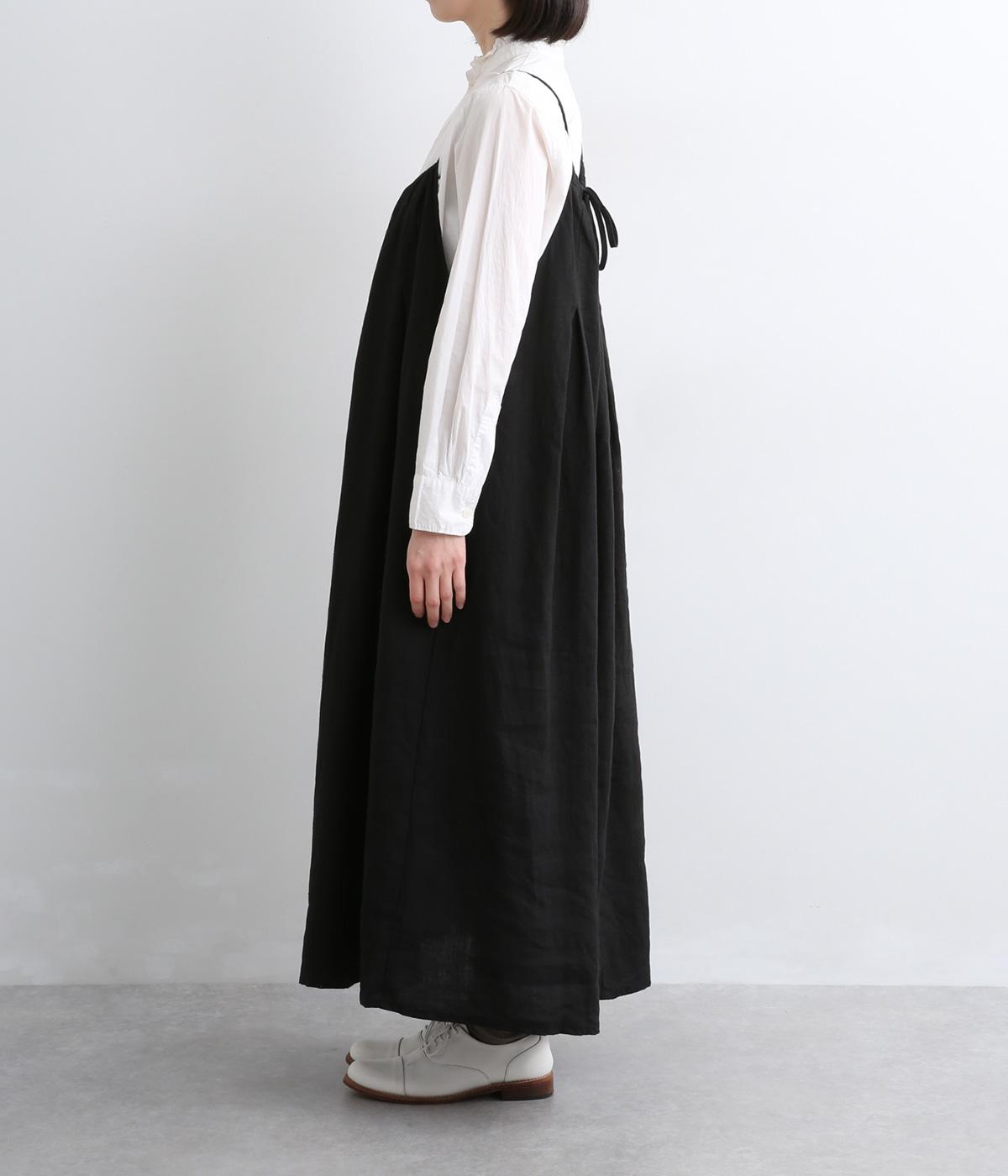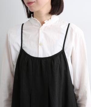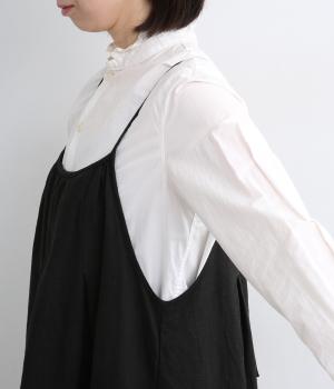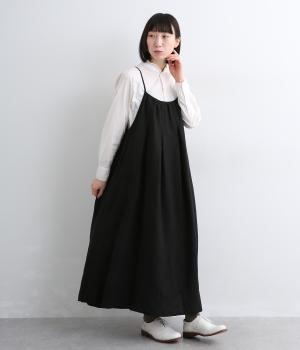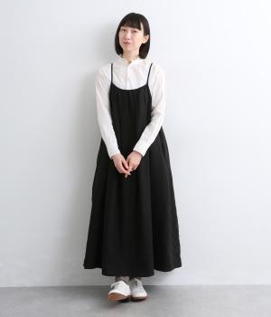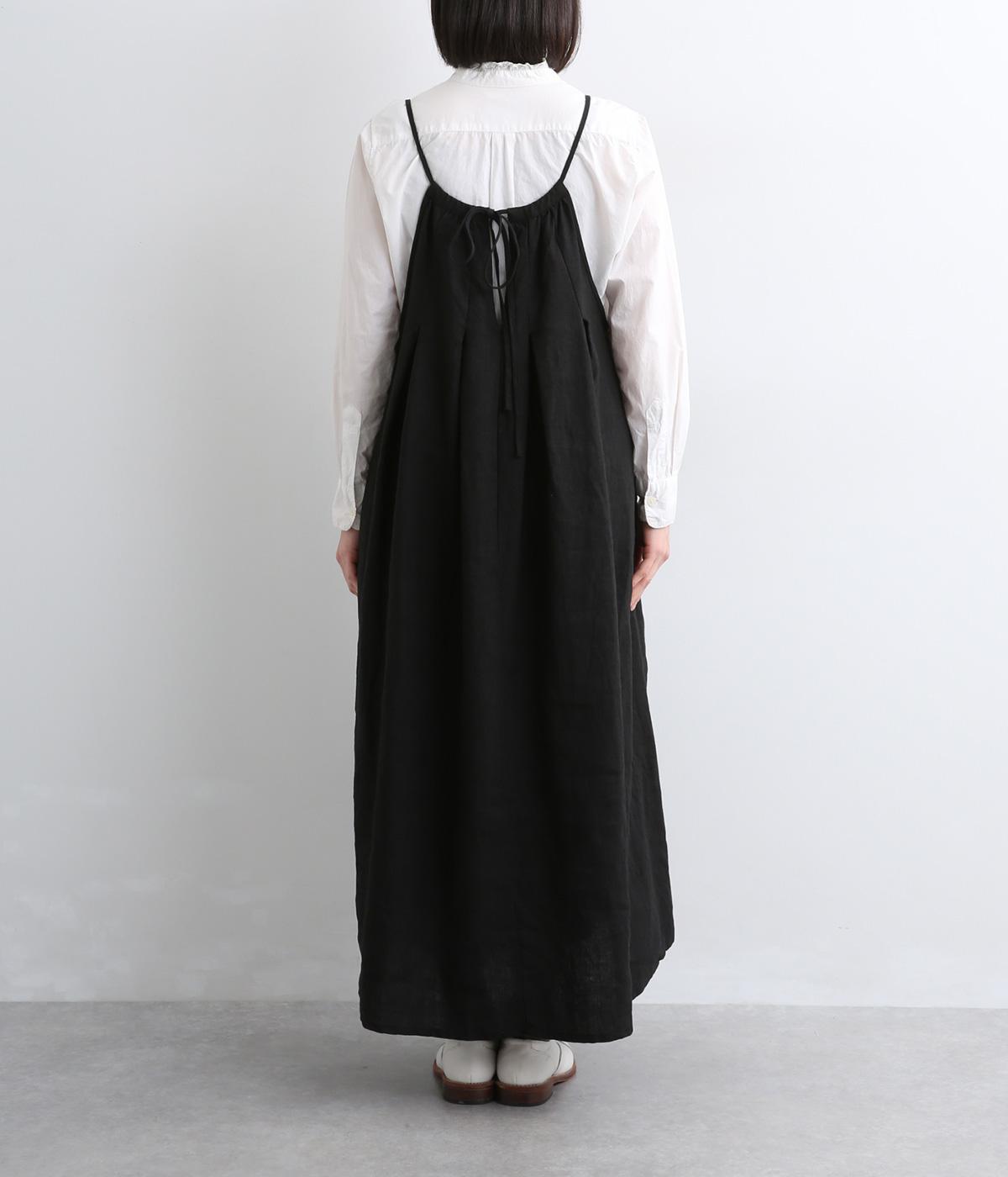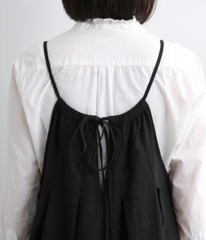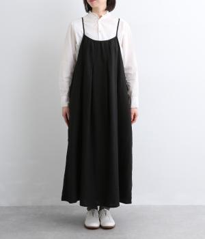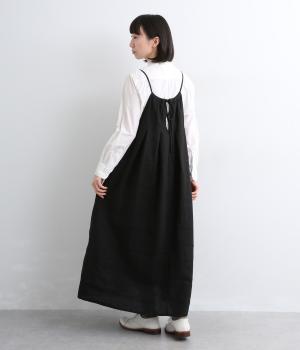 タックを入れて胸下からたっぷりと広がるフレアシルエットのキャミソールワンピース。華奢な肩紐で女性らしさを演出し、広くあいているのでさまざまなトップスと合わせられます。後ろリボンの結び加減で肩紐の長さも調整できます。