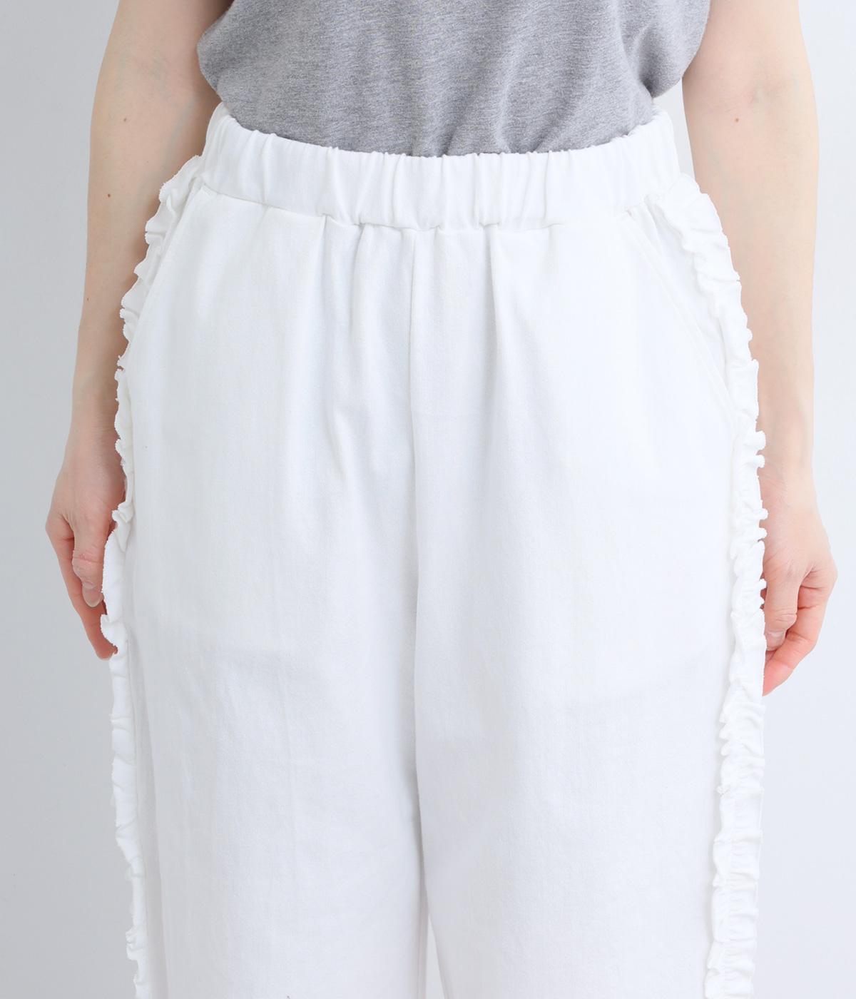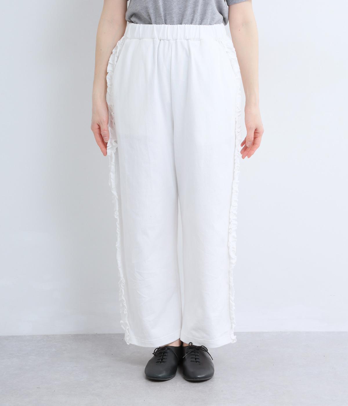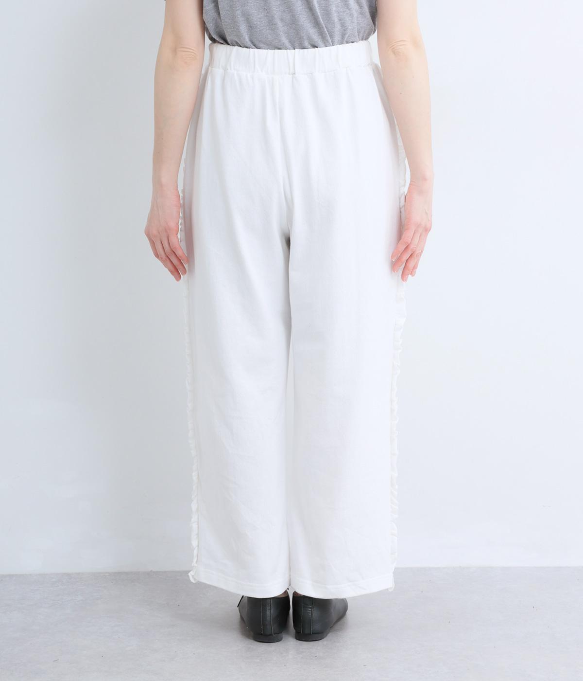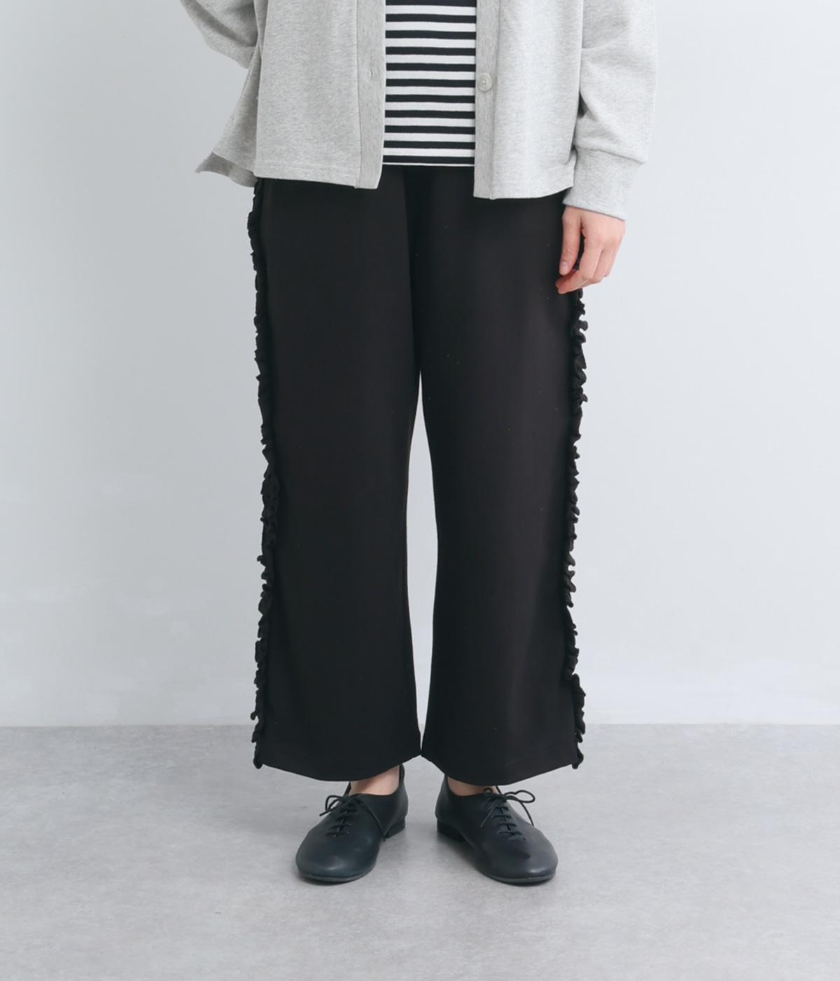 リラックスムード漂うカットソーパンツのサイドにフリルをあしらって華やかなアイテムにアップデート。甘さとカジュアルさのバランスがちょうどよく取り入れやすい仕上がり。ウエストはフィット感のいい総平ゴムに内紐入り。