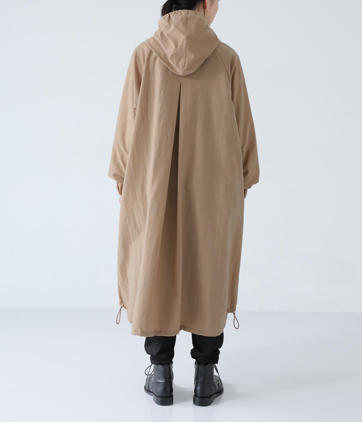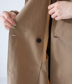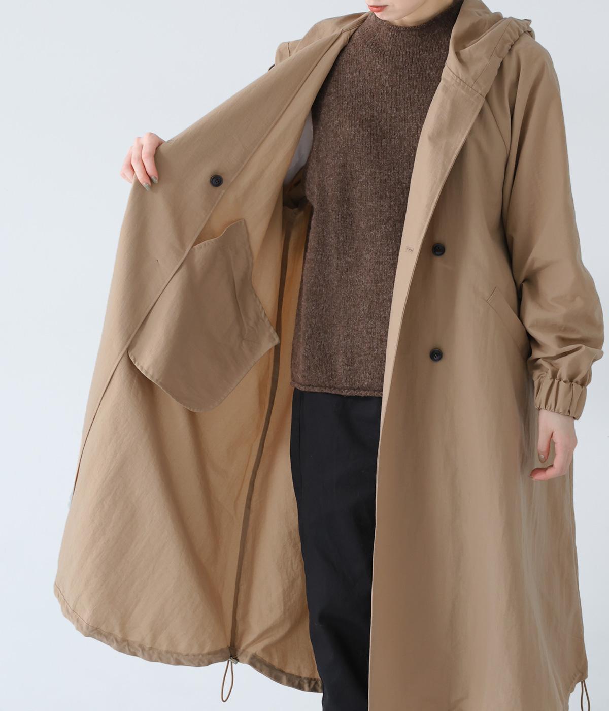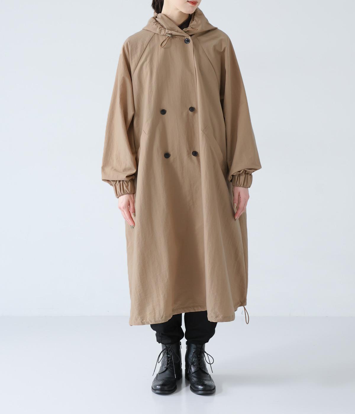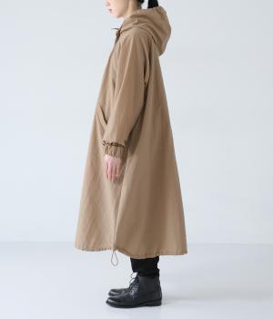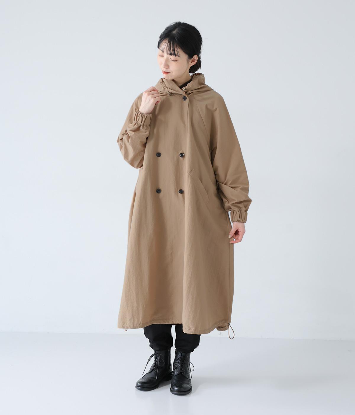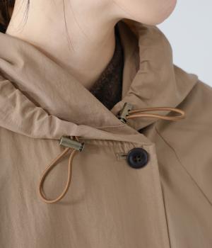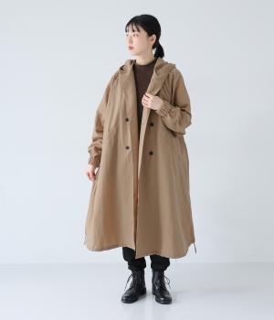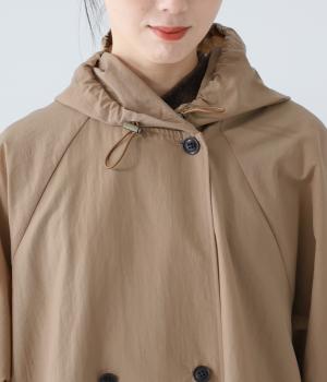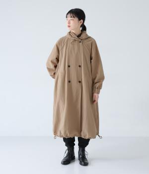カジュアルな中にもクラシカルなムード漂うダブルボタン仕様のコート。立体的なフードとタックが後ろ姿のアクセントになっています。Aラインに広がるシルエットで女性らしさもアップ。裾のドローコードを絞ればシルエットのアレンジも可能です。