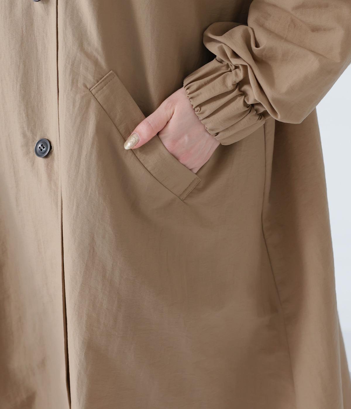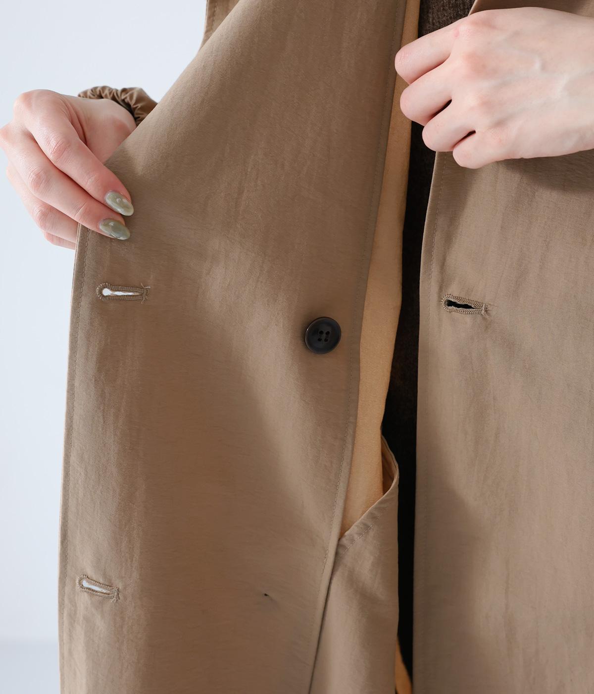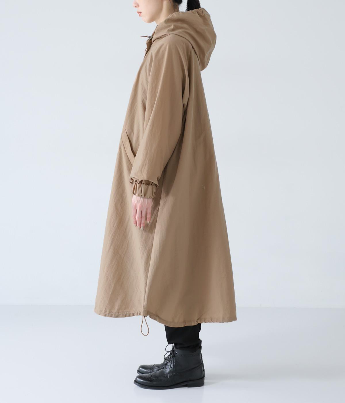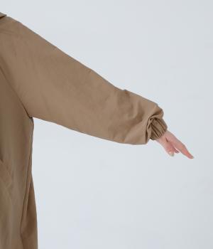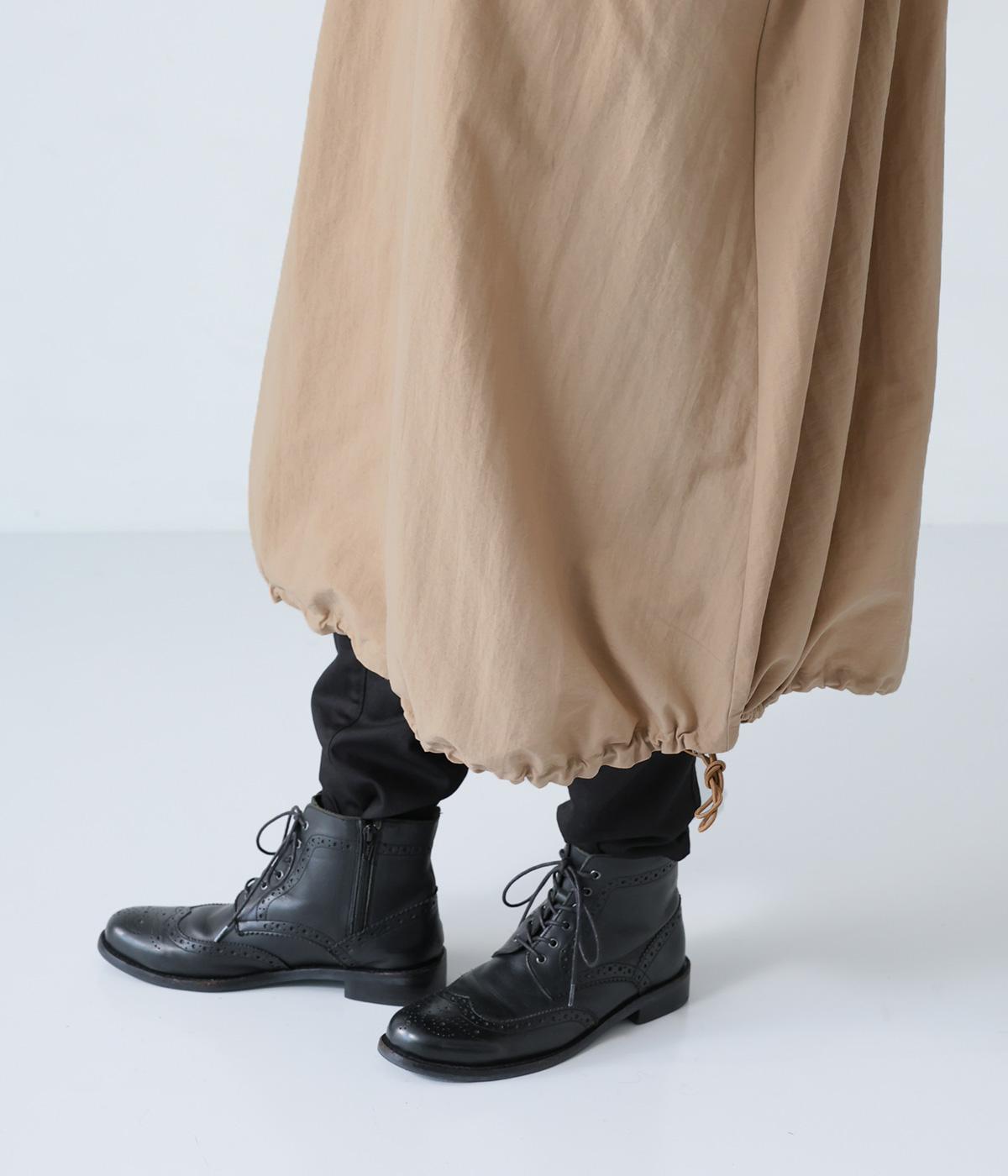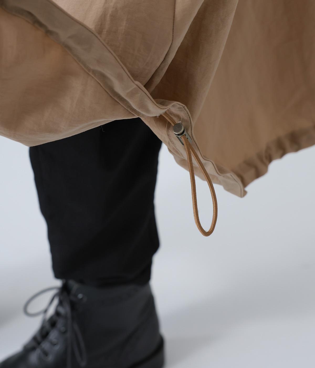 表面に細かなシワのある、洗いざらしのコットンのようなナチュラルな風合いを出したナイロン生地です。軽やかでほどよいハリがあり、シルエットをきれいに表現してくれます。