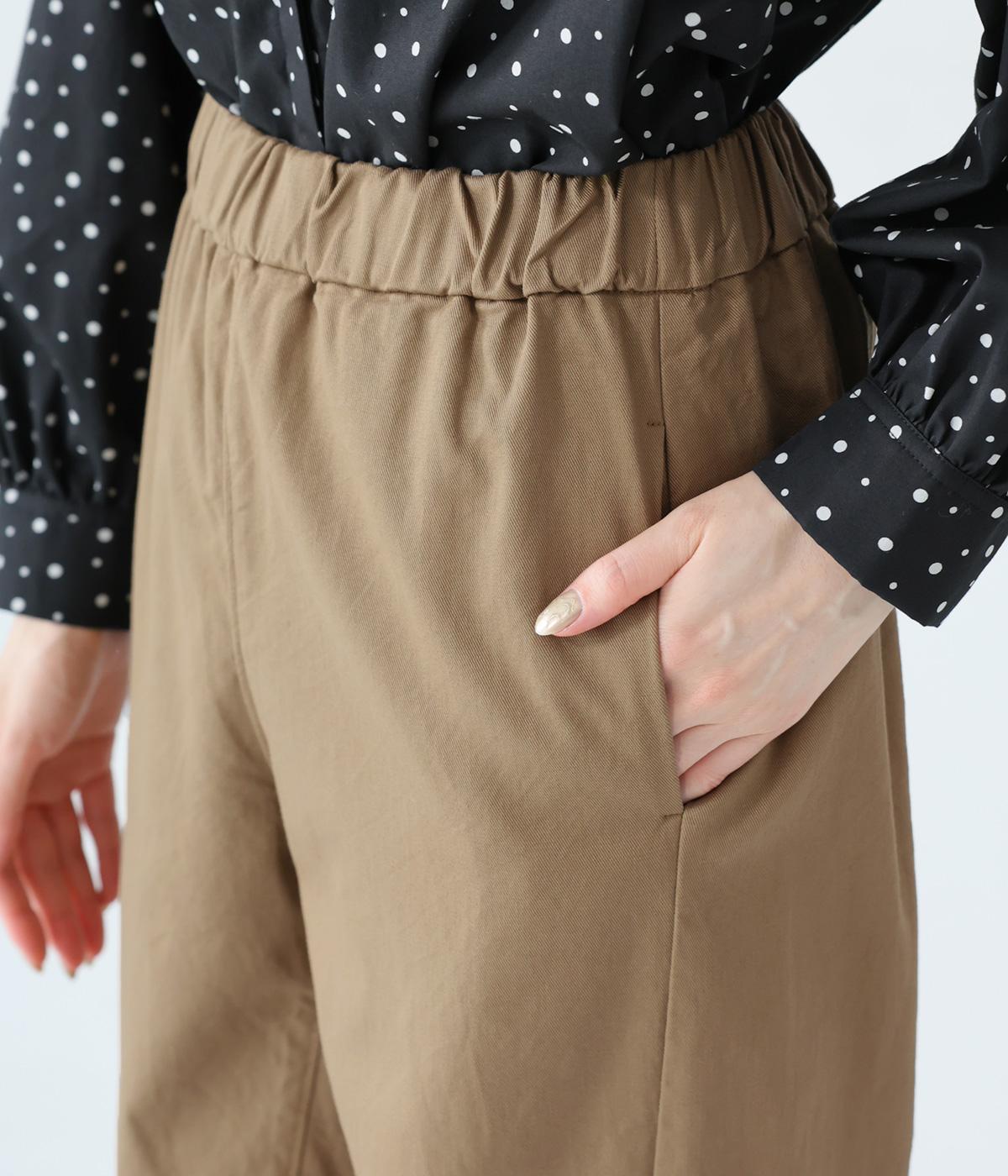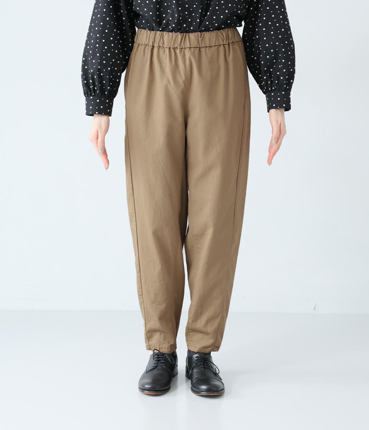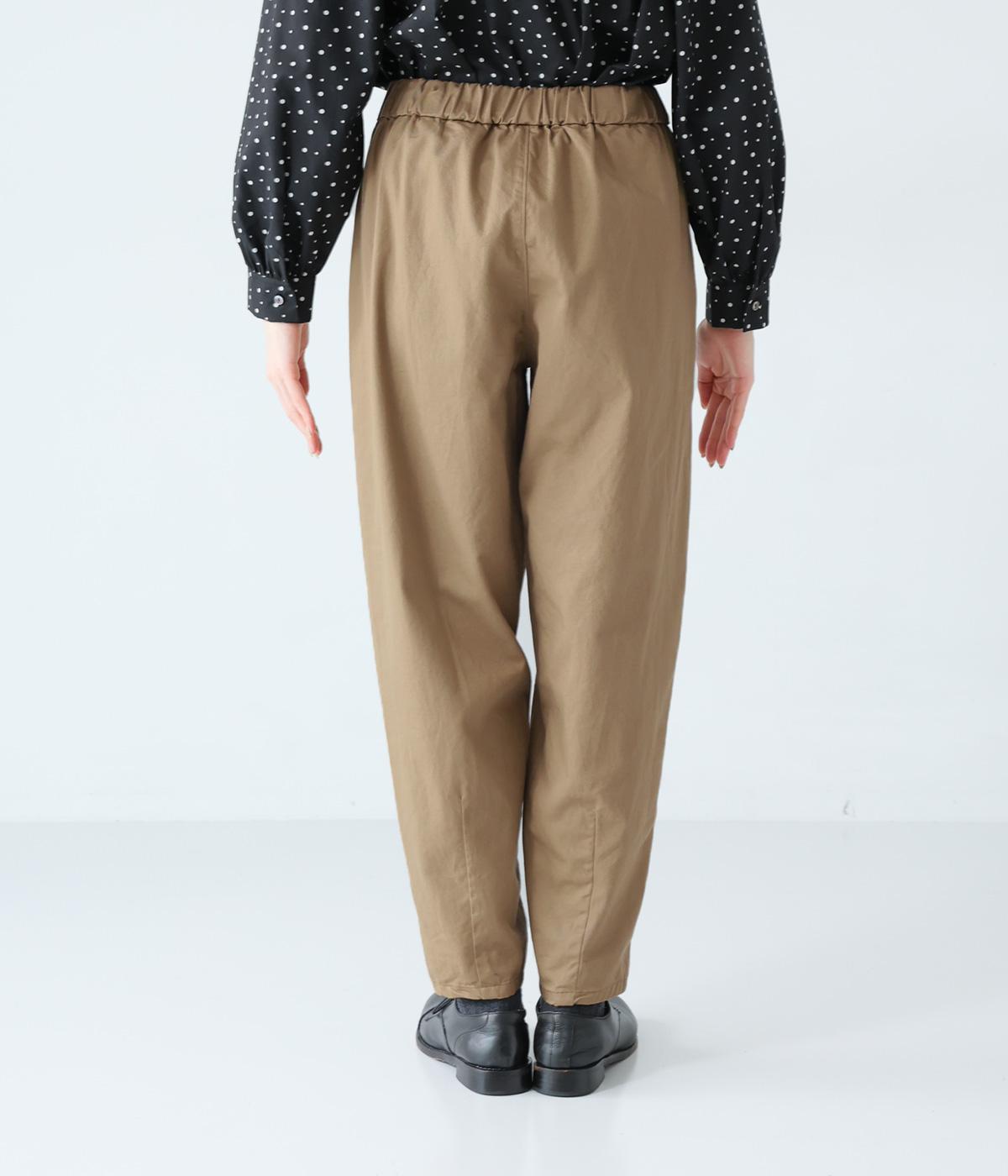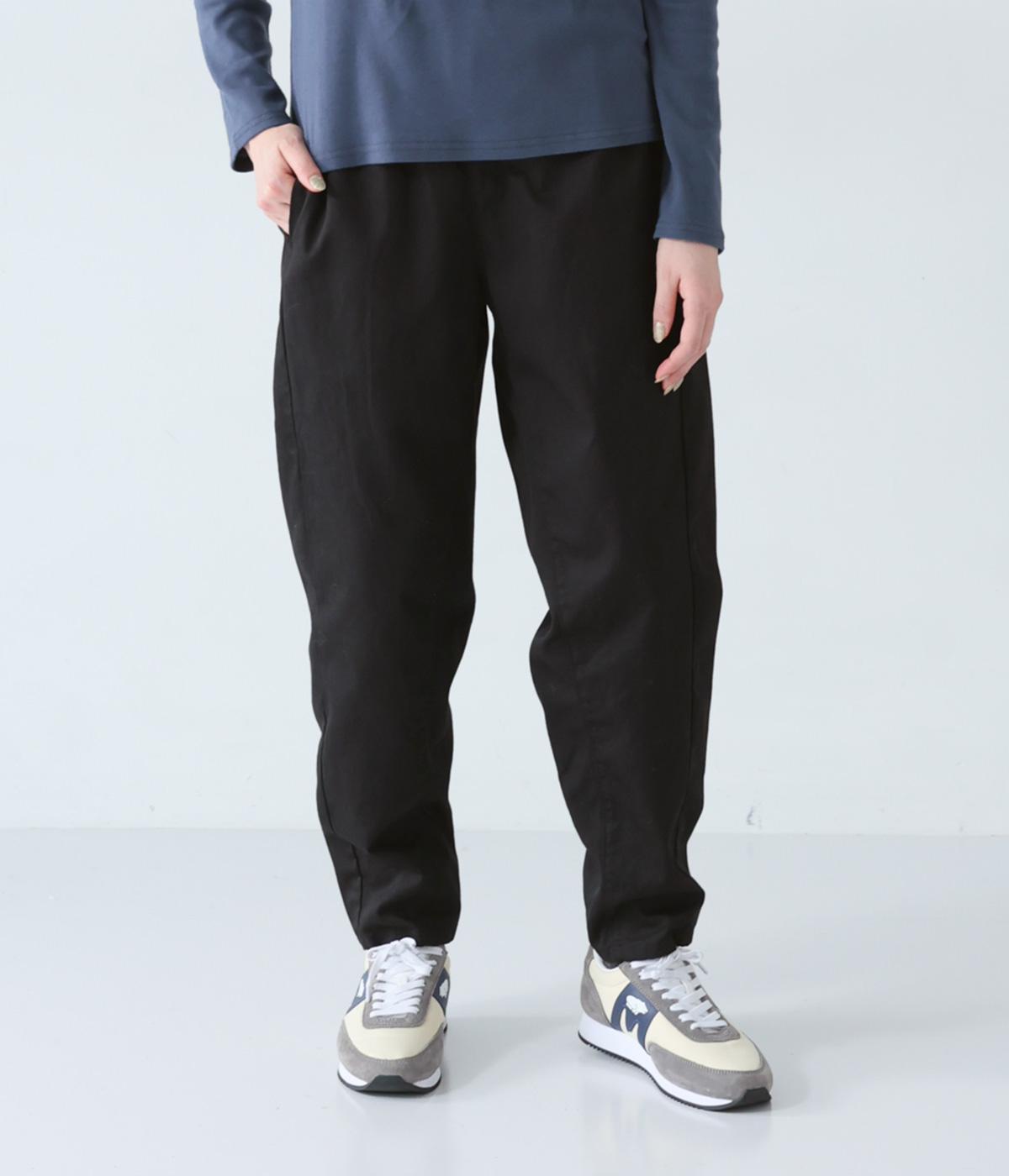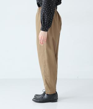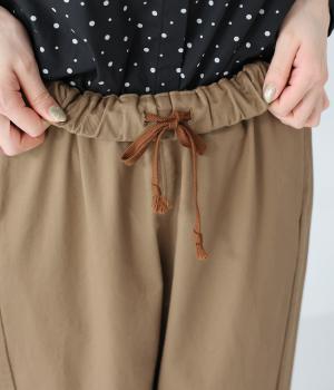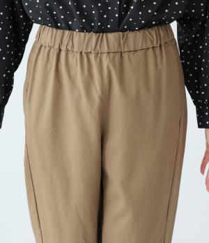 気になるお尻や太ももまわりにゆとりを持たせ、裾に向かって細くしたテーパードシルエットが魅力。サイドの切り替えラインを前寄りにして、脚のラインをすっきりと見せています。ウエストはイージーなはき心地を叶える総ゴム仕様。内側の紐でフィット感の調整も可能です。