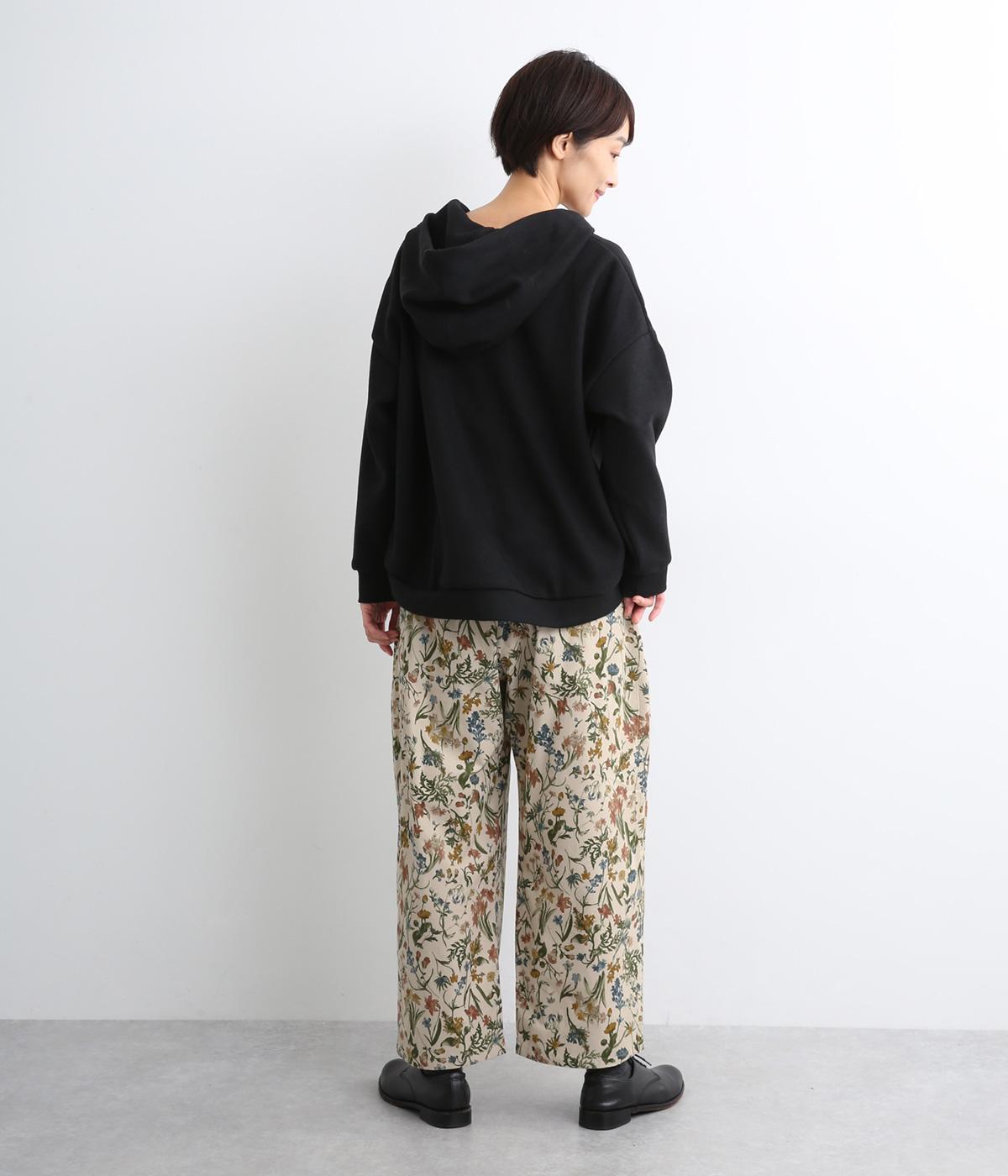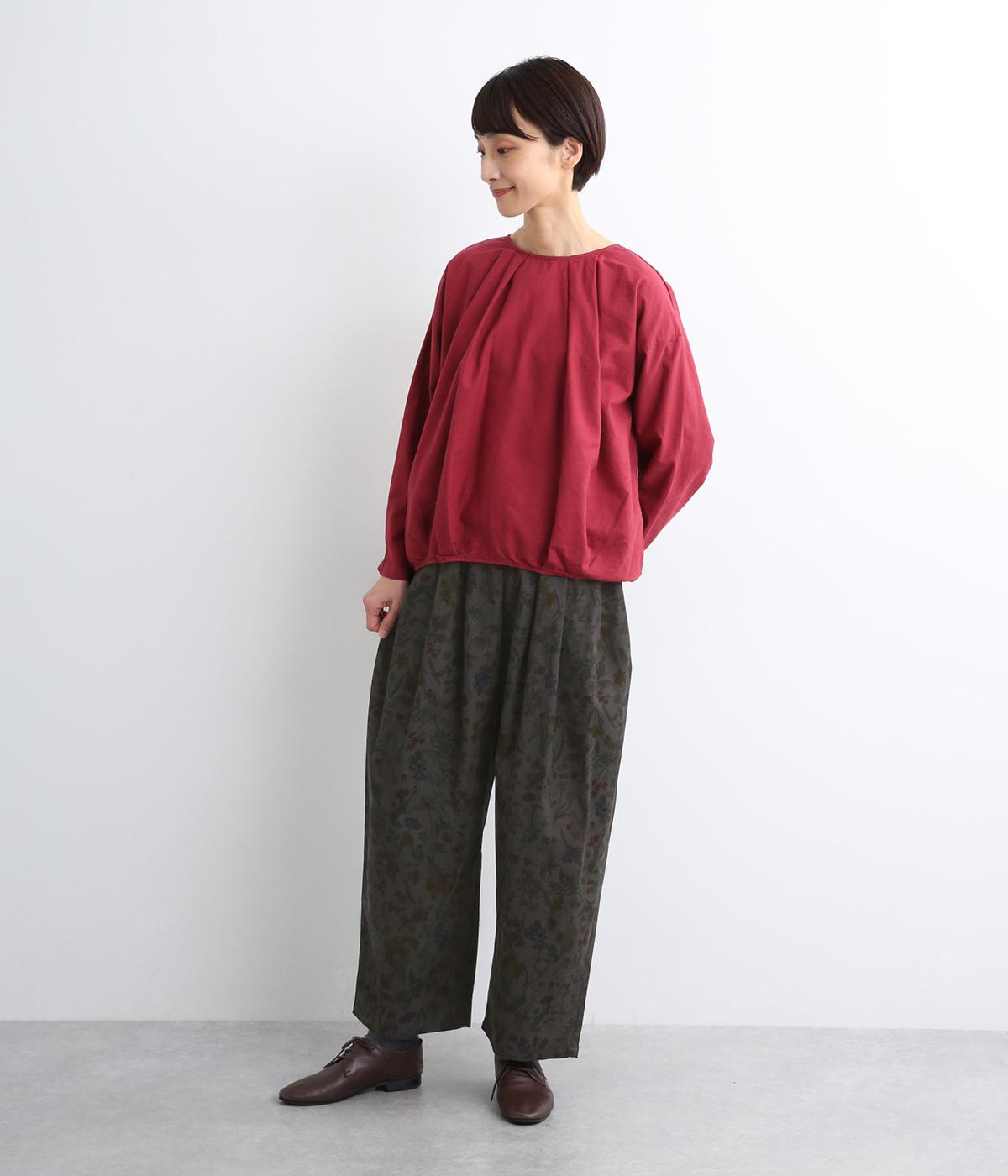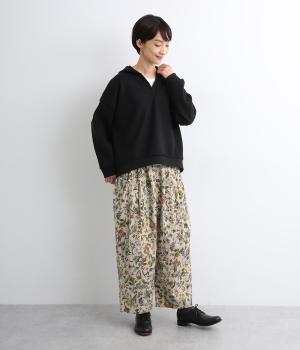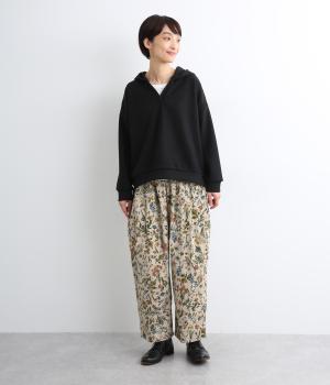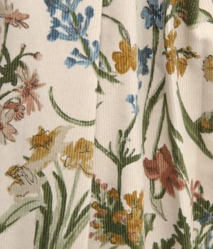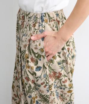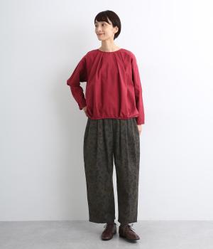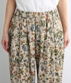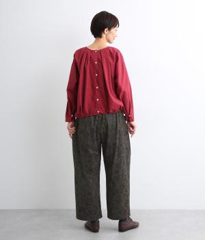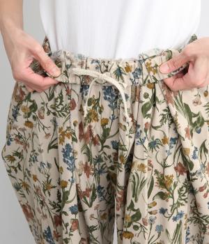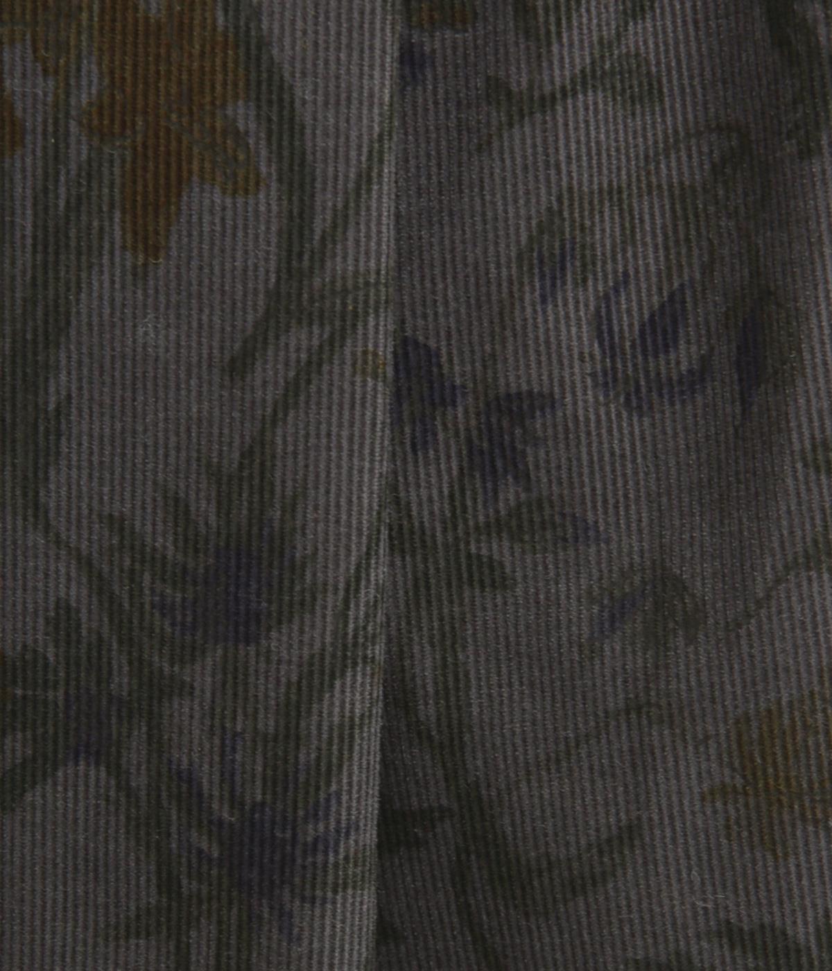 細い畝が特徴のコットンコーデュロイ生地にフラワー柄をあしらいました。適度なハリとやわらかさを持ちあわせた軽やかな生地感で、とても楽なはき心地です。