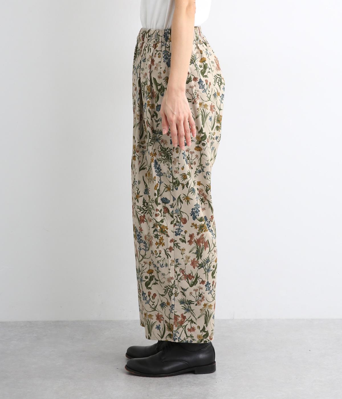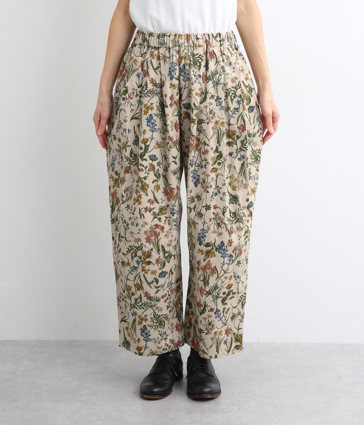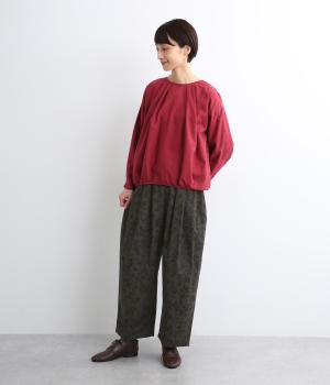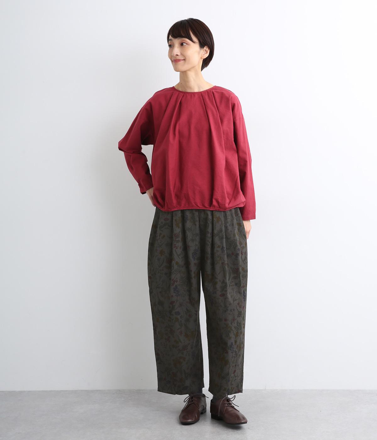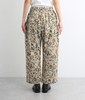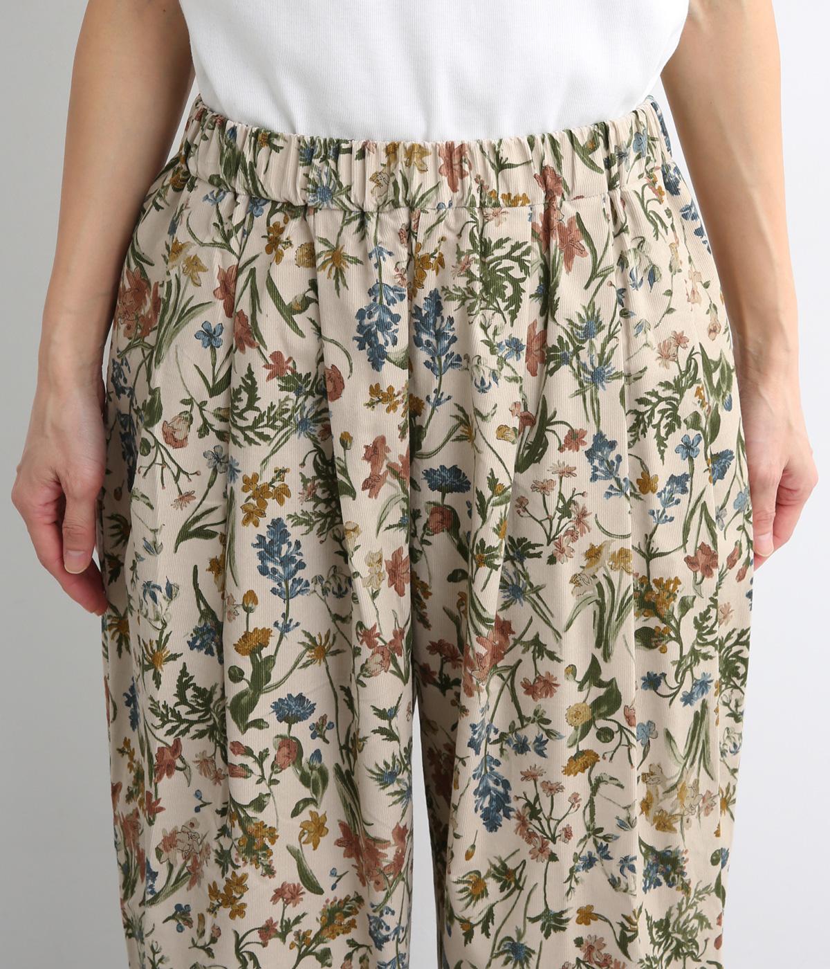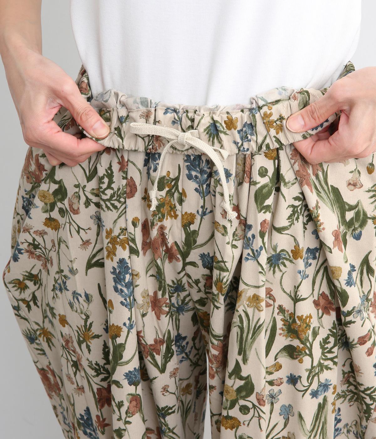 繊細なフラワー柄を纏ったコーデュロイ生地が着こなしの主役になるパンツ。楕円のように丸みを帯びたシルエットが体のラインをカバーしながらファッションムードを高めてくれます。前ウエストのタックから流れるドレープも印象的。ウエストは総ゴム仕様で、内側に紐を通しています。