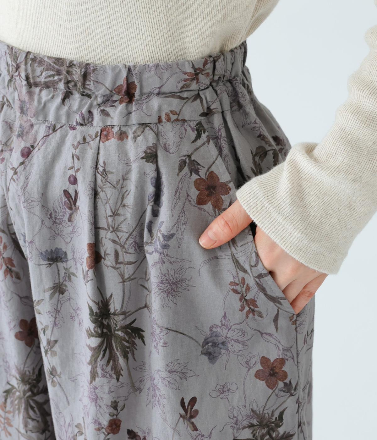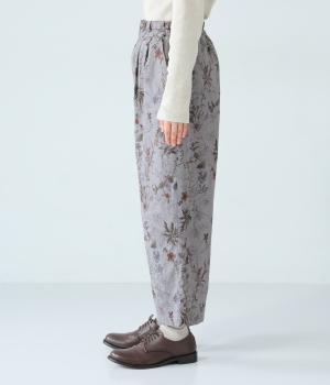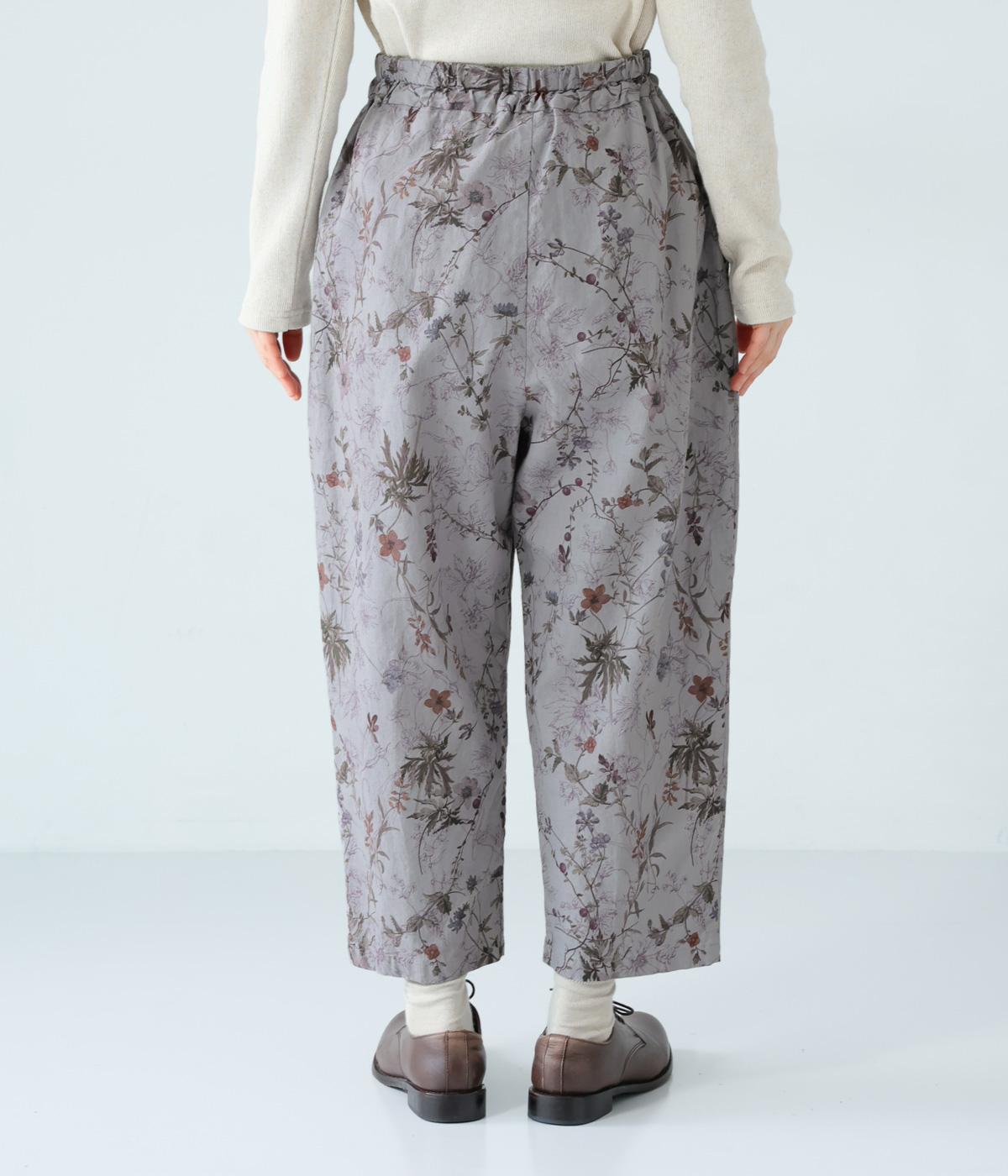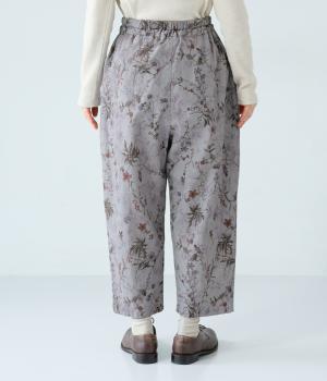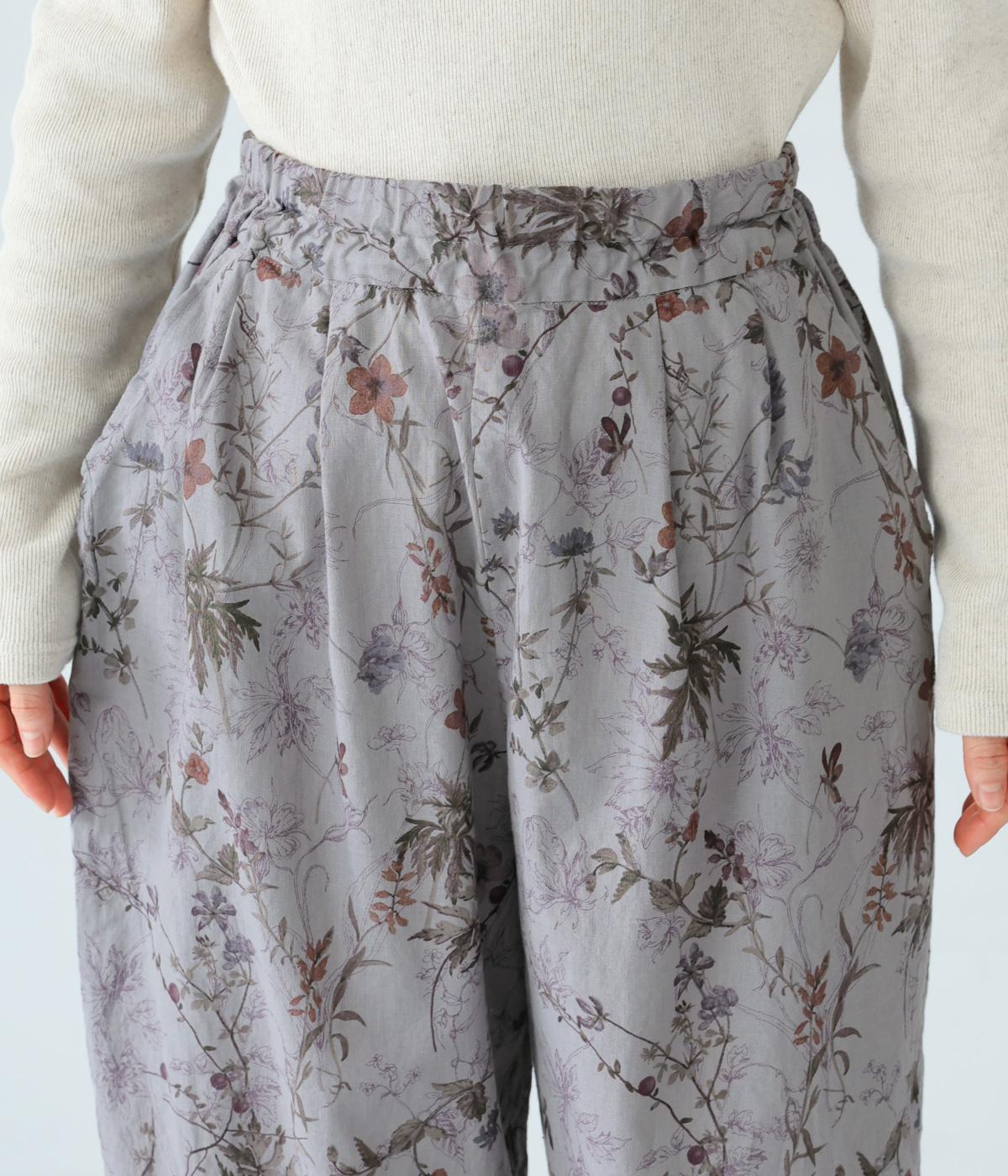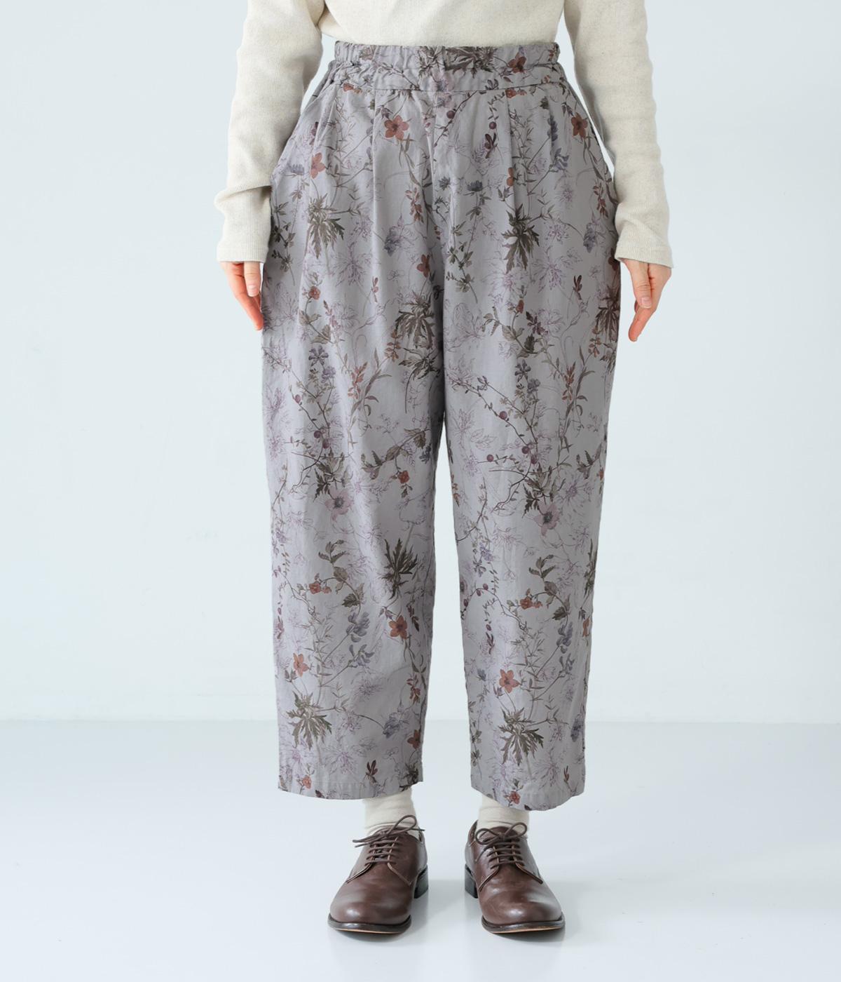 全体を落ち着いた色合いでまとめ、写実的な草花模様をあしらったシックな雰囲気のテーパードパンツ。花柄でも甘くなりすぎず大人っぽい印象に。ウエストはゴム仕様でゆったりしながら、タック入りのテーパードシルエットがすっきり見えを叶える絶妙なフォルムです。
