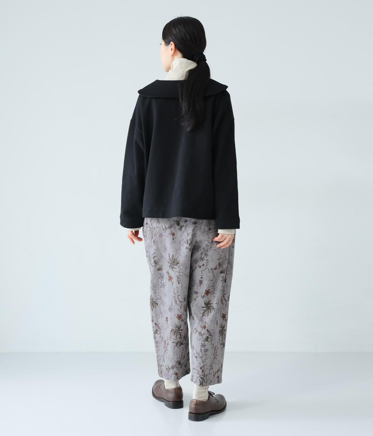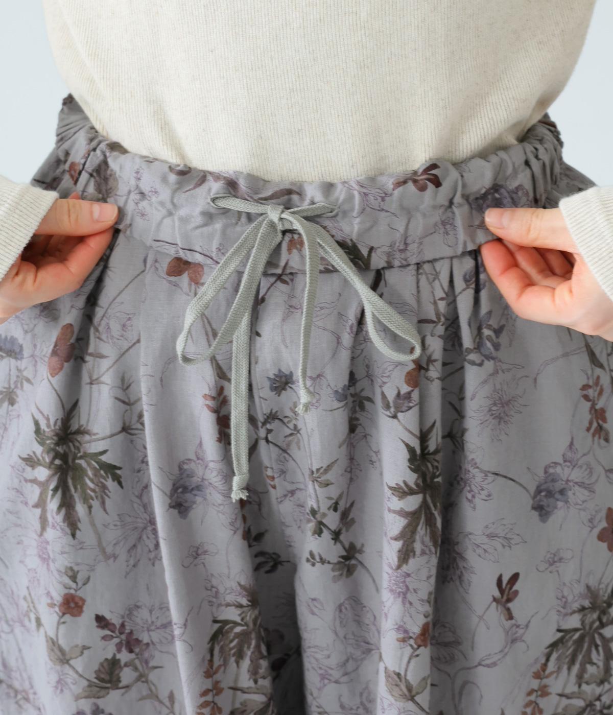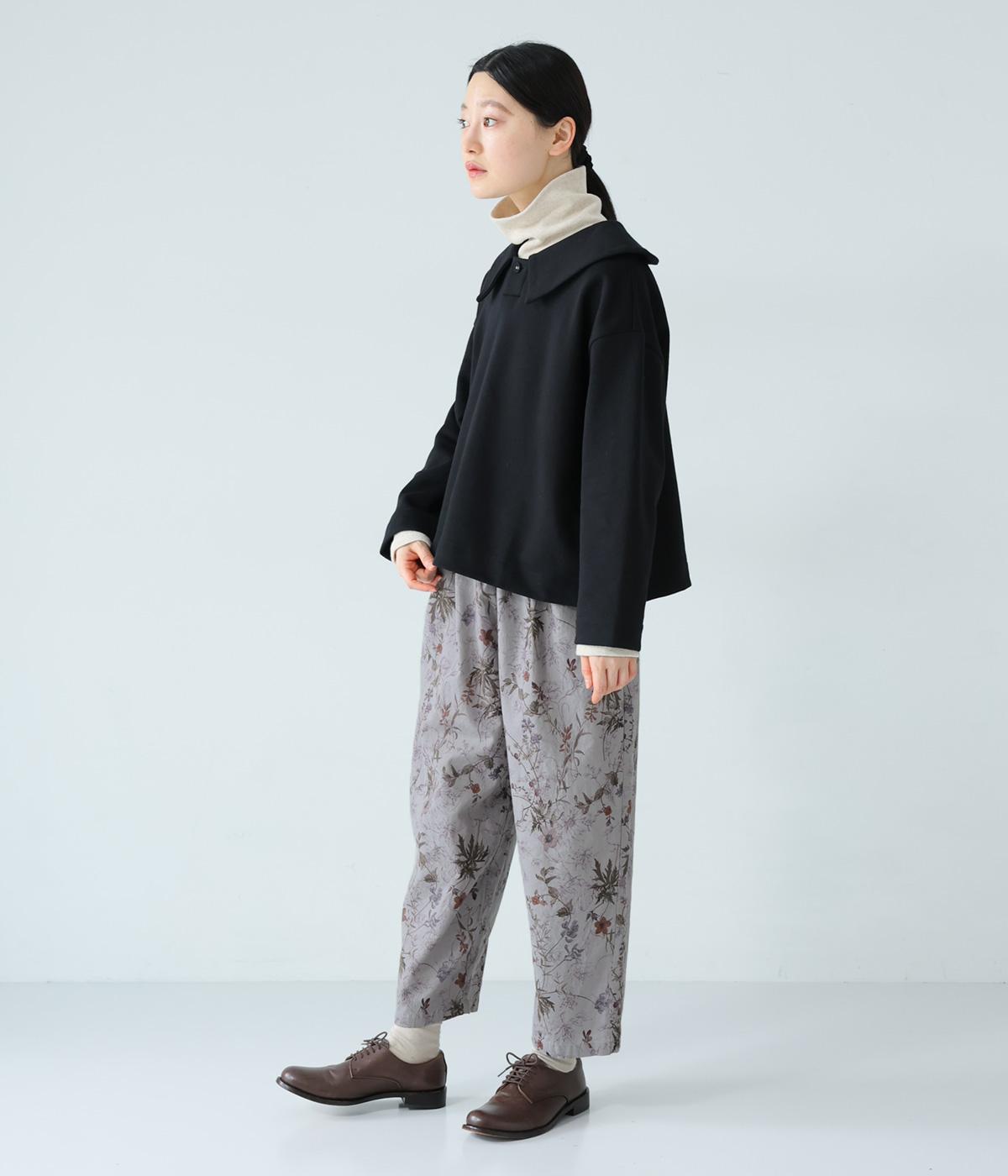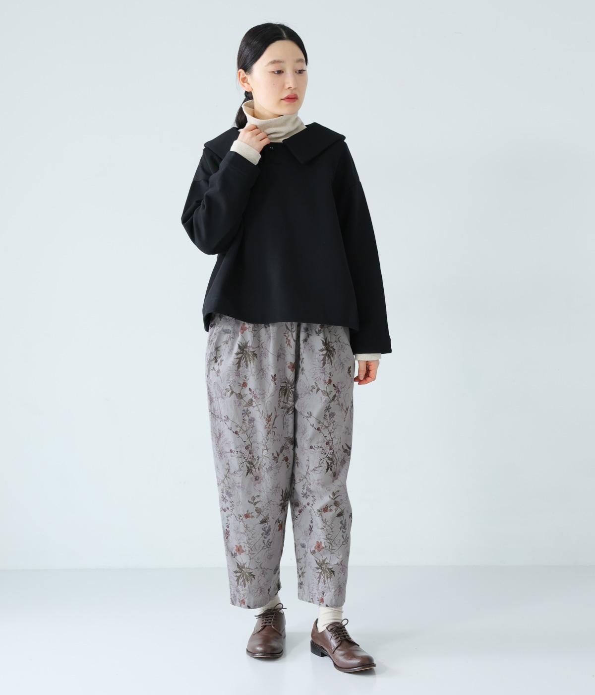 全体を落ち着いた色合いでまとめ、写実的な草花模様をあしらったシックな雰囲気のテーパードパンツ。花柄でも甘くなりすぎず大人っぽい印象に。ウエストはゴム仕様でゆったりしながら、タック入りのテーパードシルエットがすっきり見えを叶える絶妙なフォルムです。