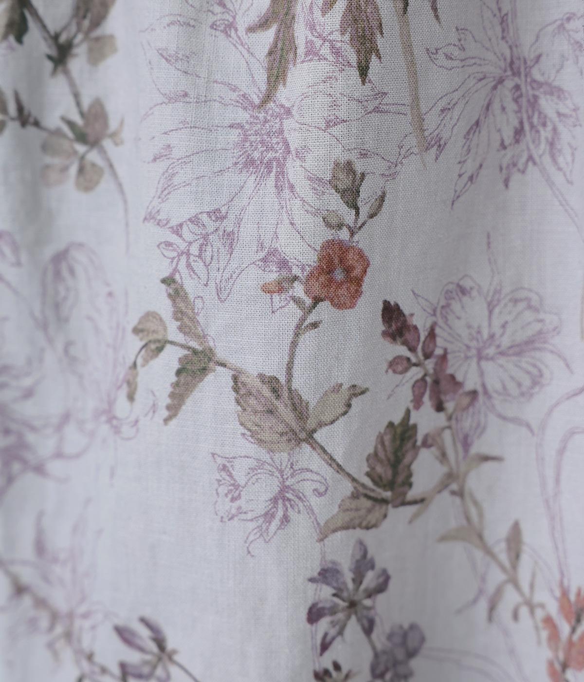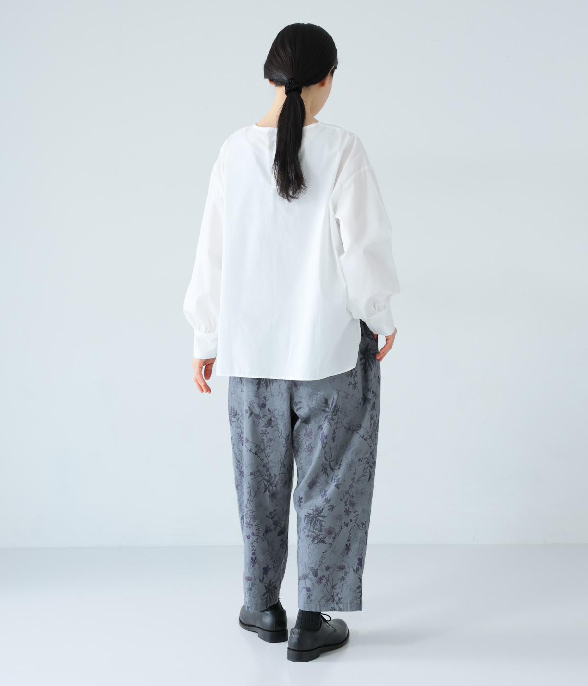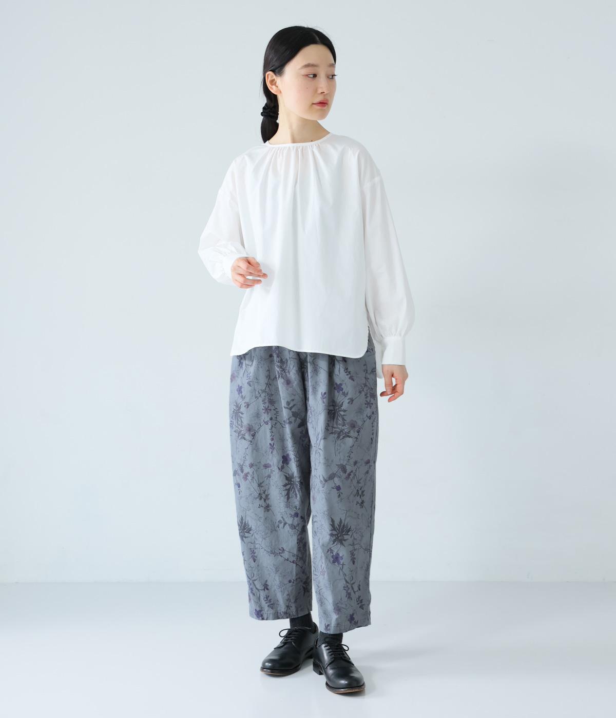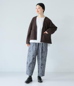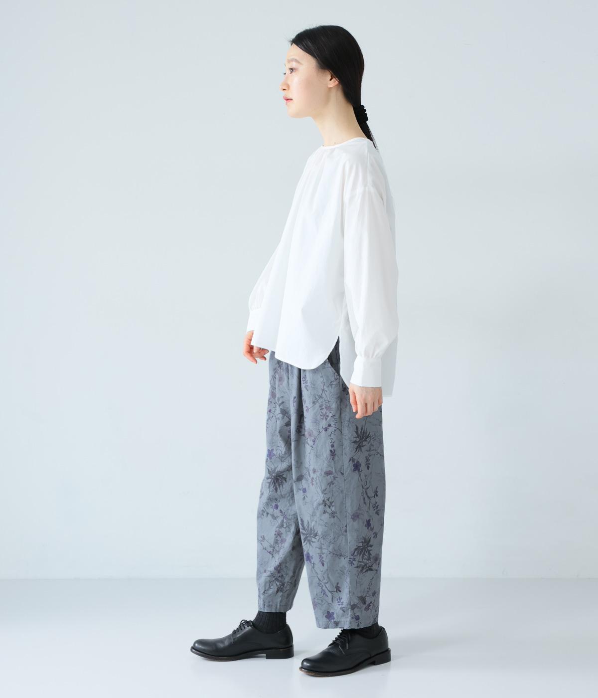 全体を落ち着いた色合いでまとめ、写実的な草花模様をあしらったシックな雰囲気のテーパードパンツ。花柄でも甘くなりすぎず大人っぽい印象に。ウエストはゴム仕様でゆったりしながら、タック入りのテーパードシルエットがすっきり見えを叶える絶妙なフォルムです。